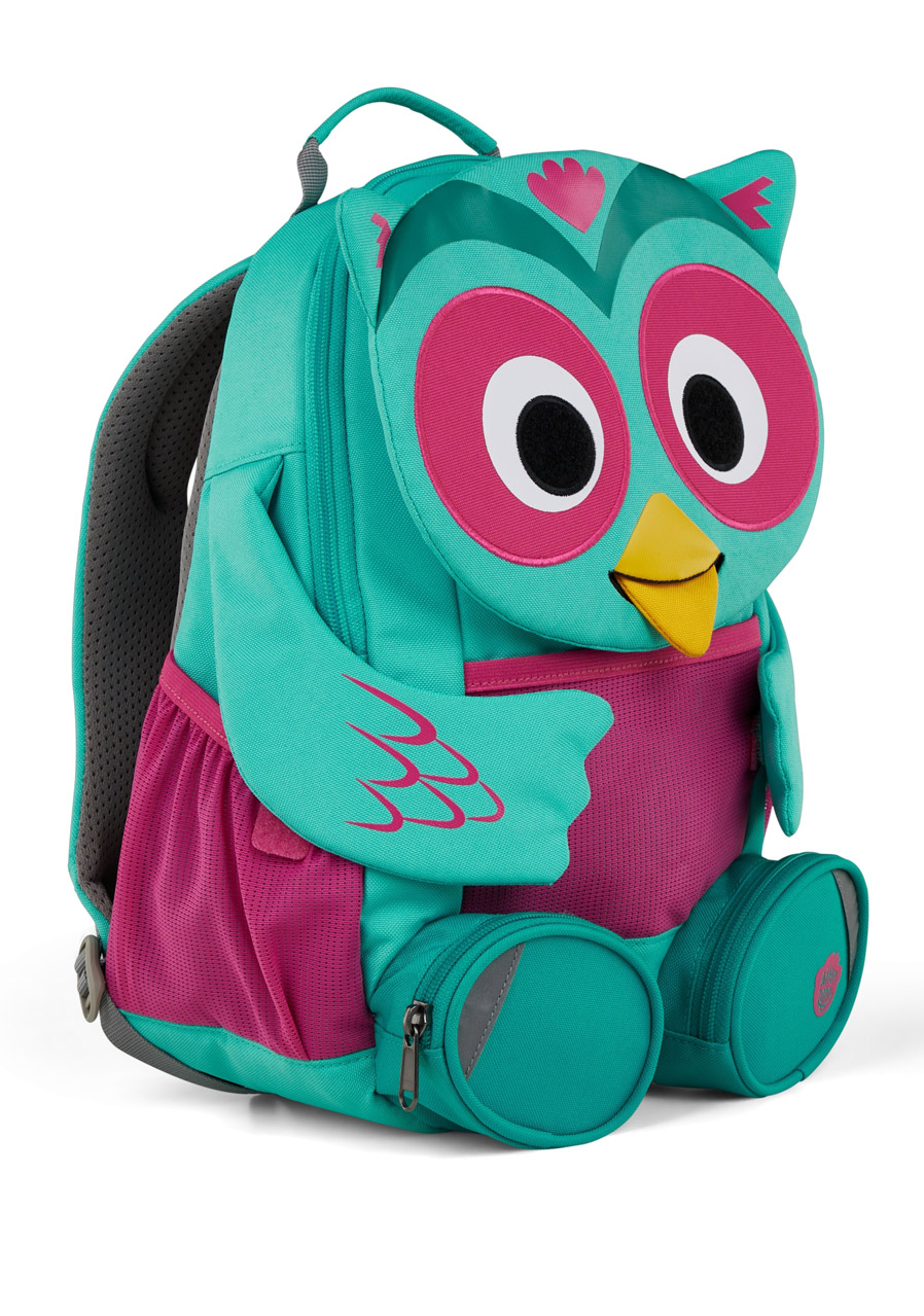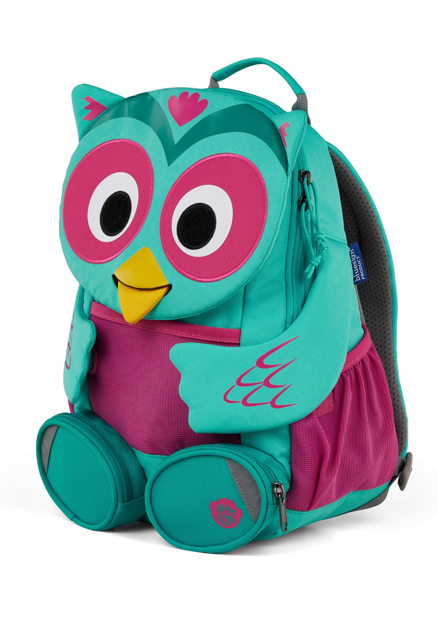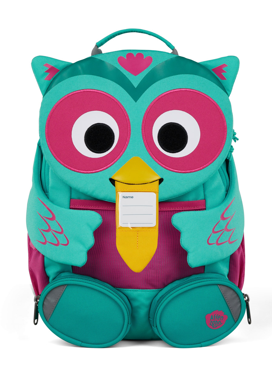 Výhody: Nízká hmotnost, ergonomické řešení pro dětská záda, použití recyklovaných materiálů, funkční detail v podobě výsuvného jazyka s jmenovkou.