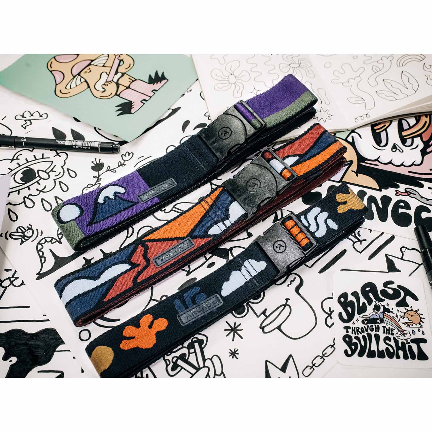 Arcade Hannah Eddy Wave Hello kombinuje originální grafiku umělkyně Hannah Eddy s funkčním strečovým páskem o délce 101 cm. Díky elastickému webbingovému pásu pevně drží kalhoty na místě, aniž by omezoval pohyb, a minimalistická hliníková přezka zajišťuje rychlé zapínání i uvolnění.