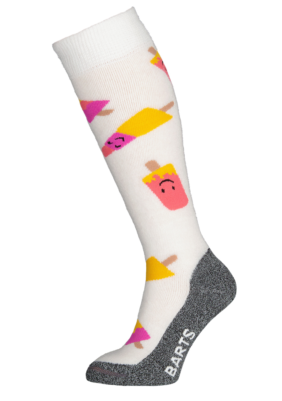 Podkolenky Barts Skisock Popsicle Kids v bílé barvě s veselým motivem nanuků zpříjemní dětem každý den na horách i při zimních hrách. Pružný a hřejivý materiál udržuje nohy v teple, zajišťuje pohodlí v lyžařské obuvi a chrání před odřením. Díky originálnímu designu se stanou oblíbeným doplňkem dětského zimního outfitu.