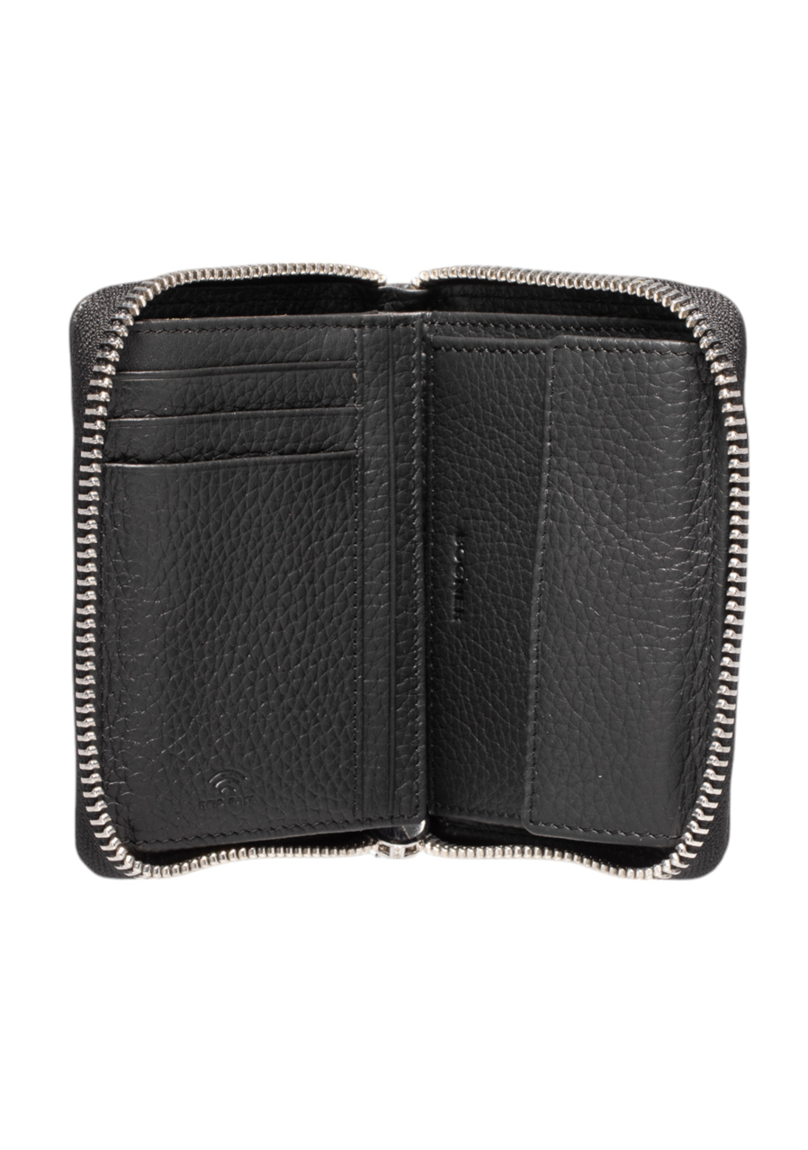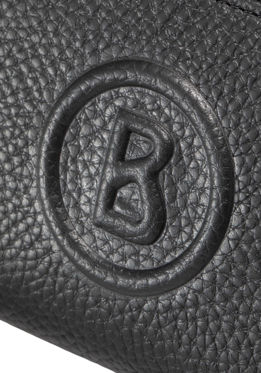 Detaily: zapínání na zip, přihrádky na karty a bankovky, kapsa na mince, kovové logo Bogner