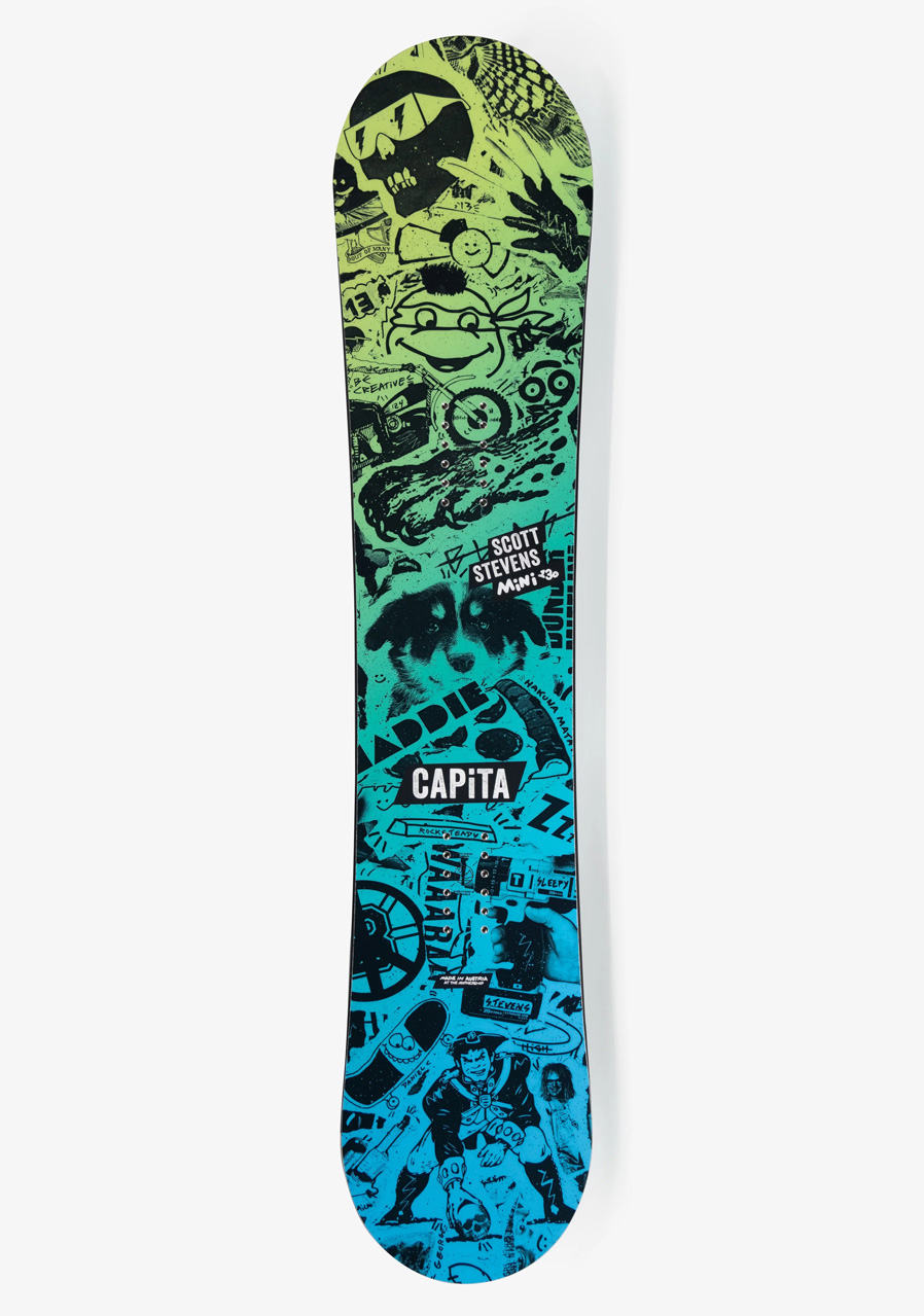Snowboard Capita Scott Stevens Mini je navržen pro mladé jezdce, kteří chtějí zábavné, odolné a snadno ovladatelné prkno, na kterém se rychle posunou ve svých dovednostech. Model vychází z dospělé verze prkna Scotta Stevense – ikony kreativního freestyle snowboardingu – a přináší lehkou, odolnou konstrukci uzpůsobenou pro menší váhu a nižší rychlosti. Twin tvar a hybridní profil Park Mini RCR (camber mezi vázáními s rockerem na špičce a patce) poskytují ideální rovnováhu mezi stabilitou, popem a tolerancí chyb. Díky FSC® dřevěnému jádru a odolné skluznici HMC Extruded je prkno připraveno na každodenní ježdění, park i sjezdovku.