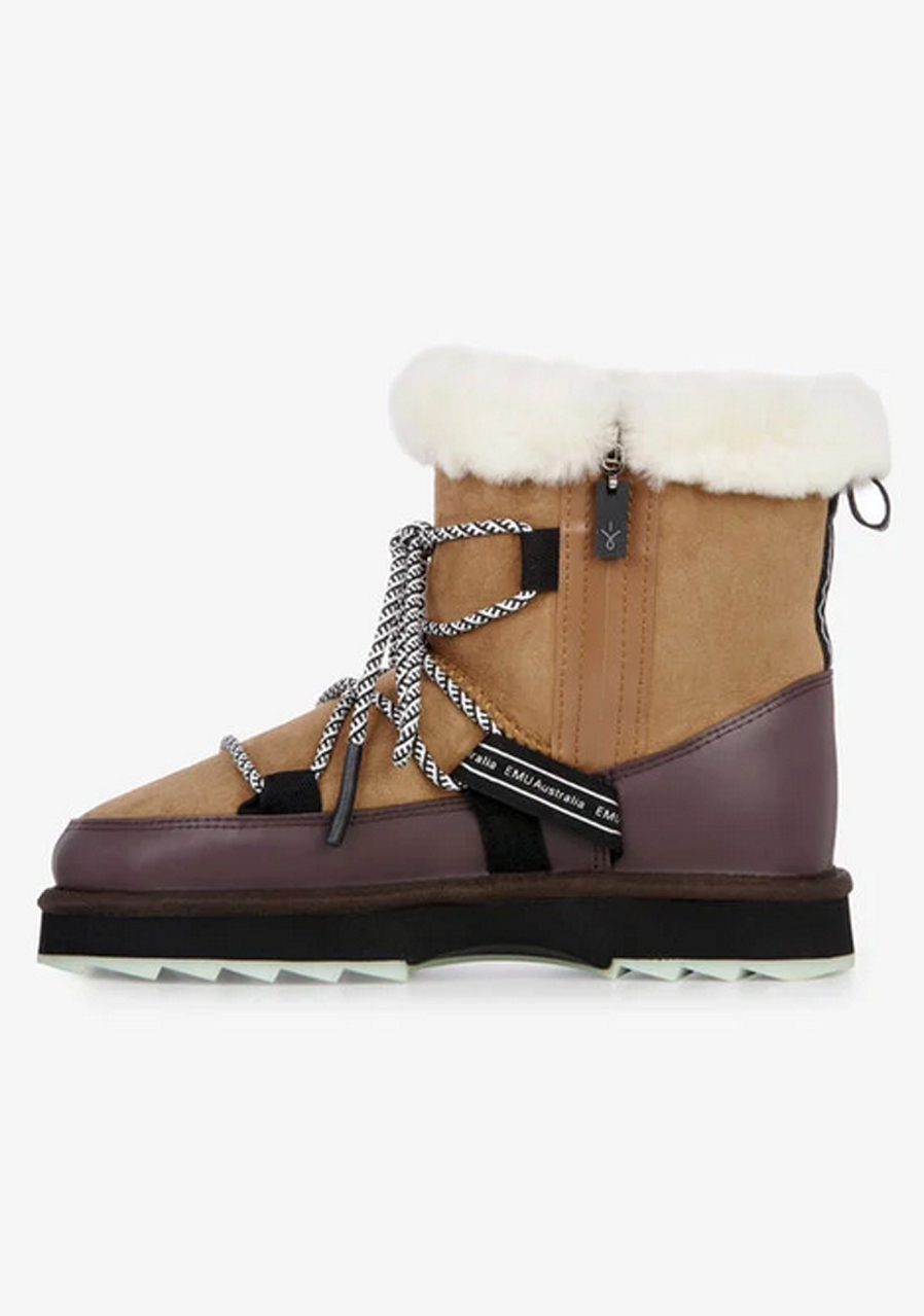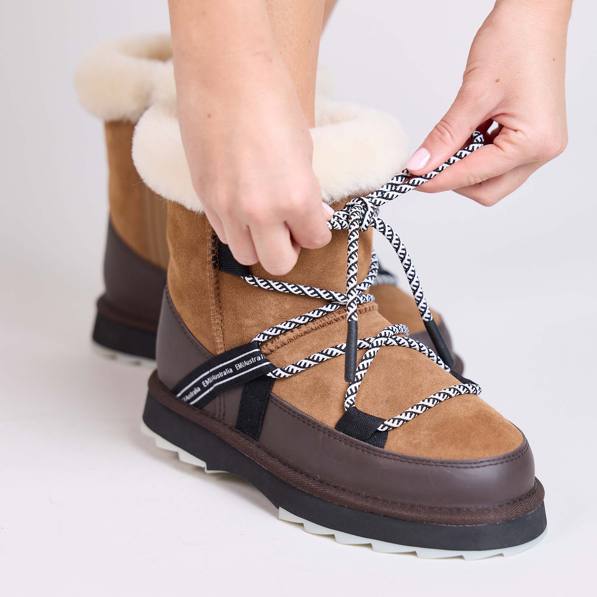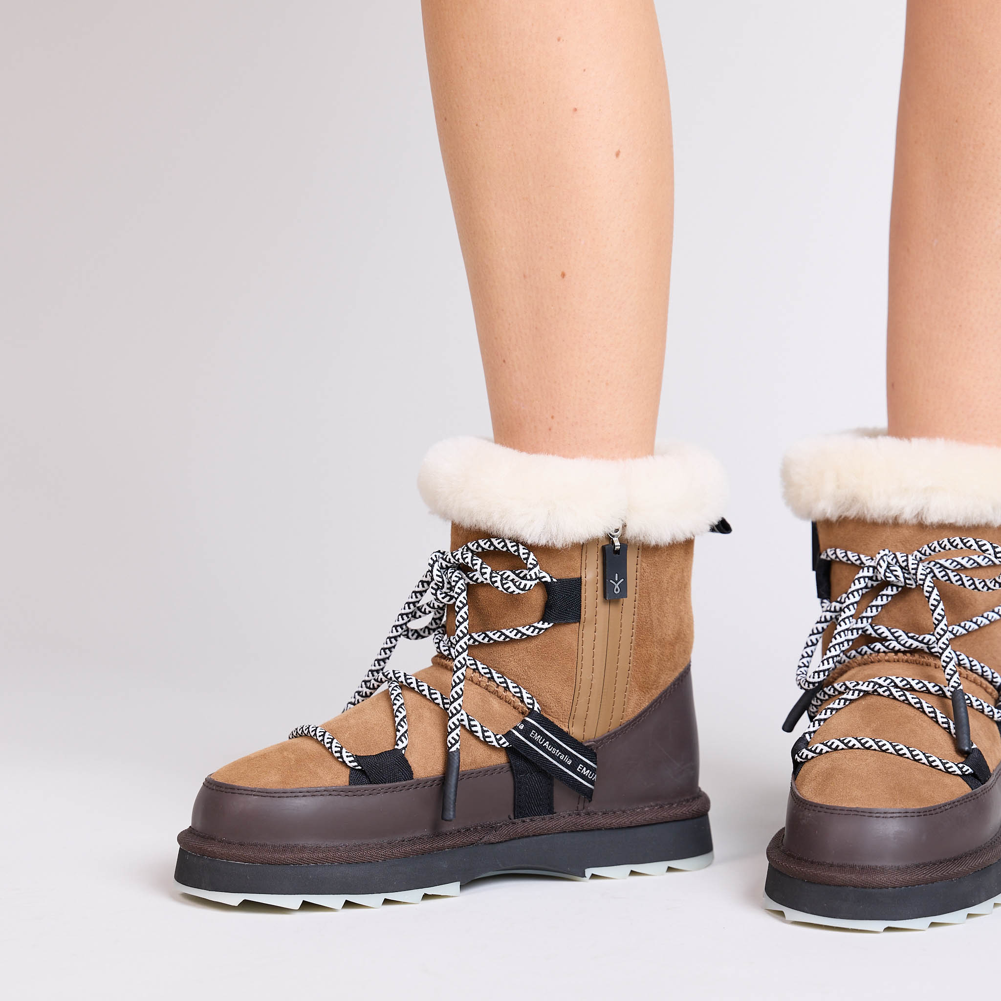Sněhule z kolekce Emu Australia. Model vyroben z kombinace semišové kůže, textilního materiálu a syntetického materiálu.