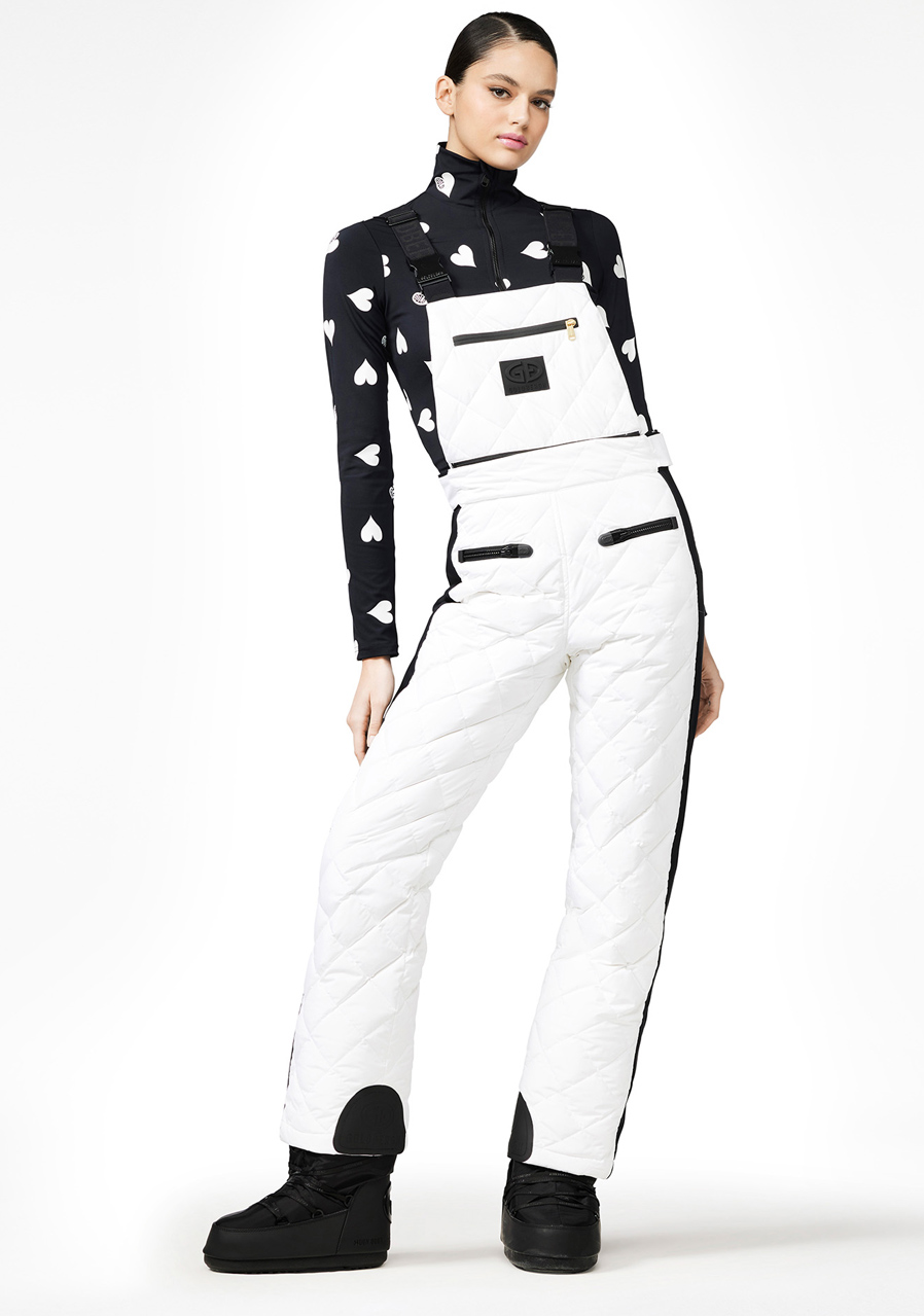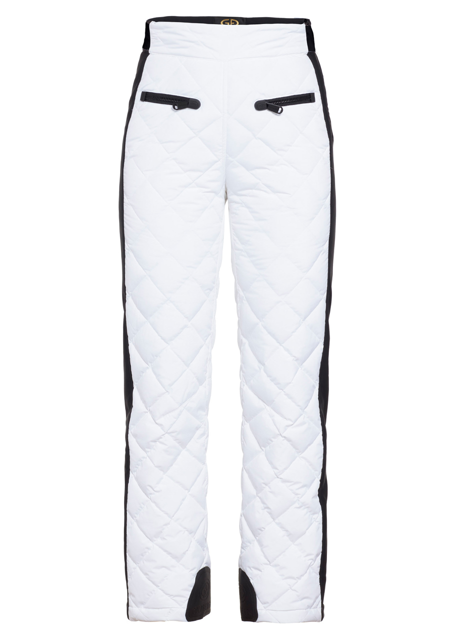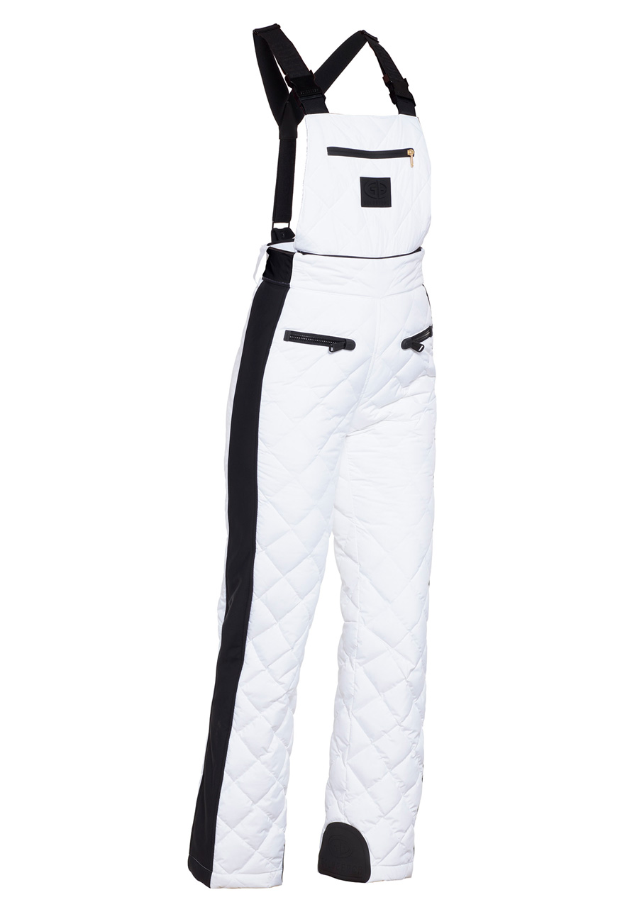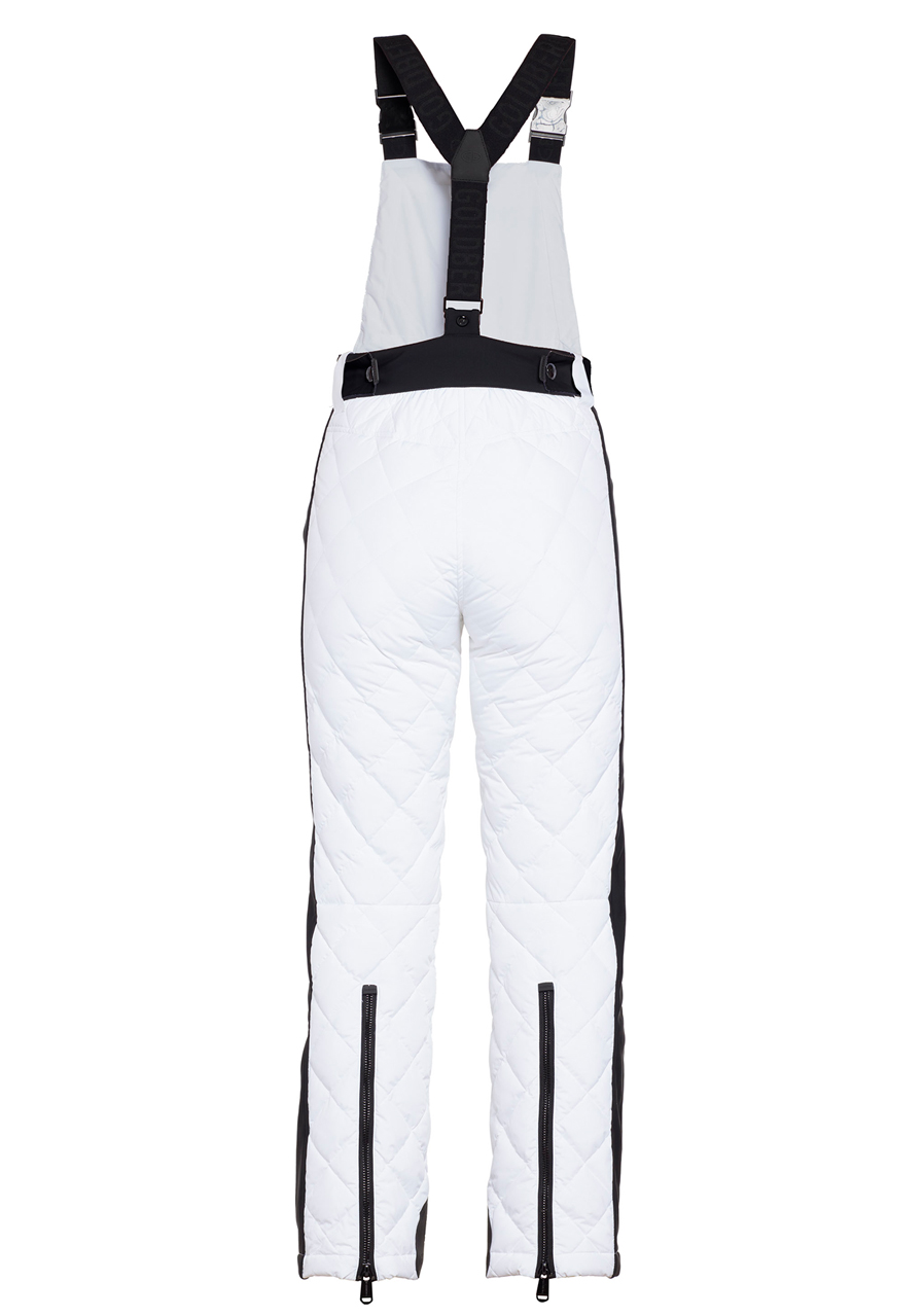 Dámské péřové prošívané kalhoty s laclem. Bílá barva dodává kalhotám eleganci a materiál funkčnost. Oceníte také tři kapsy na přední straně. Zip na zadní straně spodní části kalhot pro dokonalé přilnutí kalhot k lyžařským botám. Černé pruhy po stranách dodají kalhotám dokonalou siluetu, která zvýrazní ženské křivky.