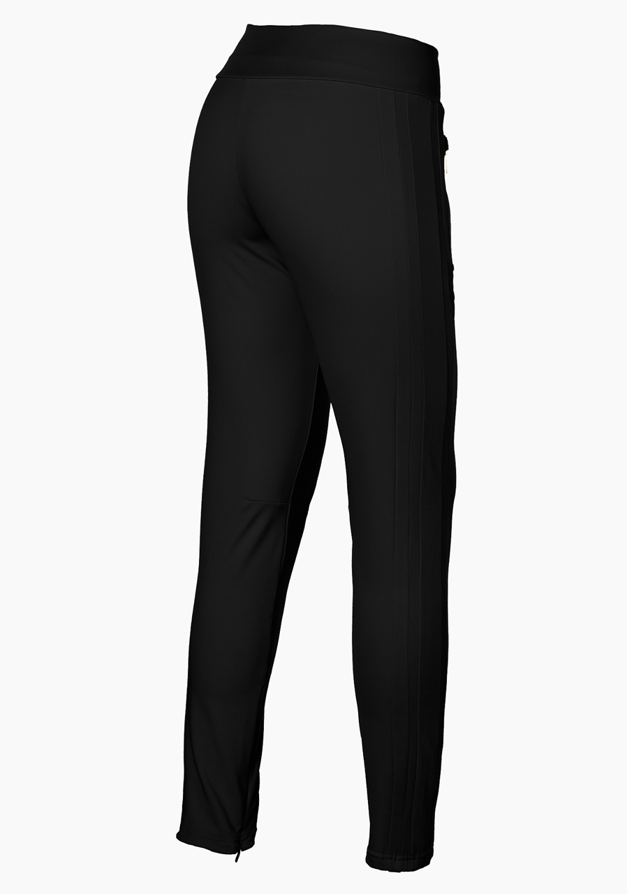 Goldbergh Flux Track Pants v černé barvě jsou stylové a funkční kalhoty vhodné jak na sport, tak pro volný čas. Jsou vyrobeny z pružného materiálu s technologií Powerstretch, který je prodyšný a odvádí vlhkost, což zajišťuje maximální pohodlí při nošení. Kalhoty mají regular fit střih a rovnými nohavicemi, elastický pas a lesklé pruhy po stranách, které dodávají moderní vzhled. Praktické jsou také přední kapsy na zip a skrytý zip na vnitřní straně nohavic pro snadné oblékání. Materiál je směsí recyklovaného polyesteru a elastanu, což poskytuje optimální flexibilitu a vnitřní česaná úprava zaručuje maximální komfort během nošení. Kalhoty mají antizápachovou úpravu a rychle schnou, což je ideální pro aktivní životní styl. Navíc jsou opatřeny Goldbergh logem na spodní části nohavice.