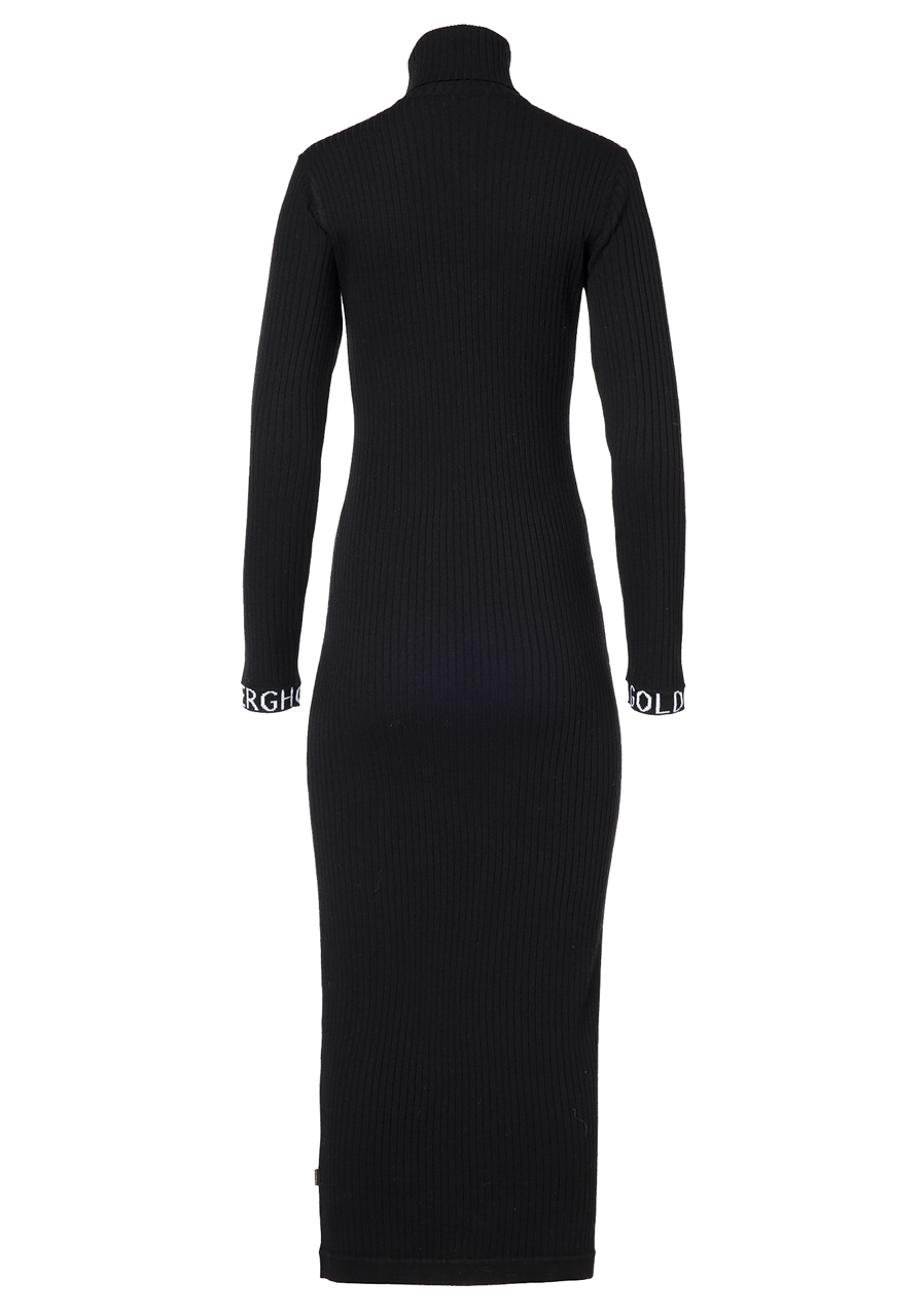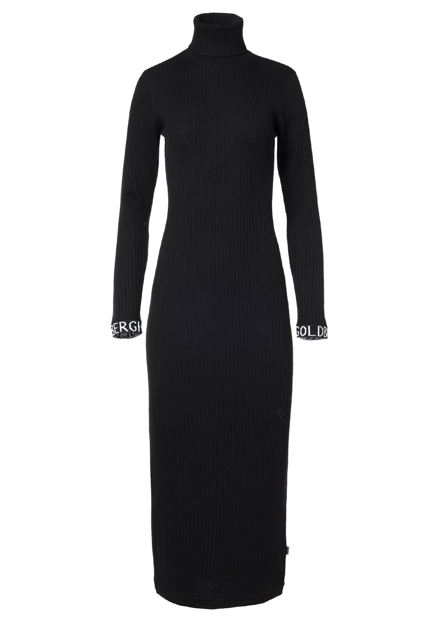 Tyto přiléhavé úpletové šaty v délce po kotníky kombinují ženský střih se sportovně-luxusními detaily. Měkký žebrovaný materiál příjemně obepíná postavu, zatímco přehnutý rolák zajišťuje hřejivý komfort. Kontrastní nápis Goldbergh na manžetách dodává originální výraz, ideální pro zimní městský styl nebo stylové après-ski večery.