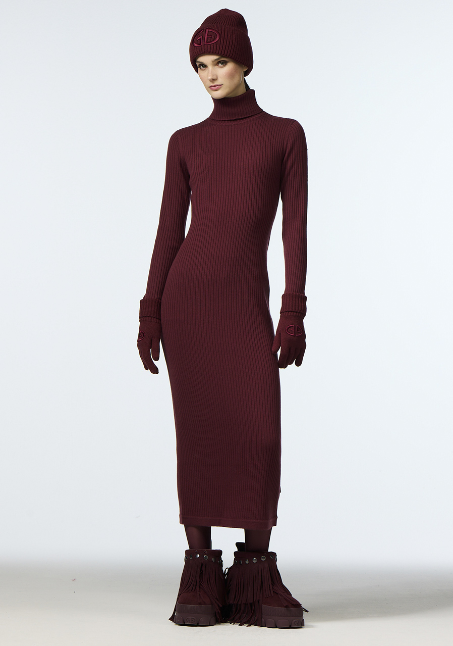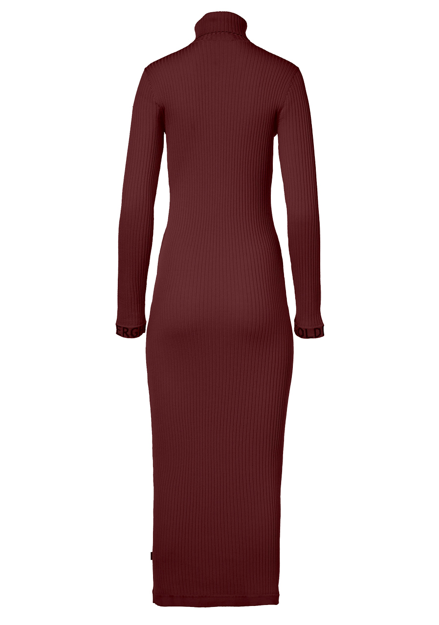 Tyto přiléhavé úpletové šaty v délce po kotníky kombinují ženský střih se sportovně-luxusními detaily. Měkký žebrovaný materiál příjemně obepíná postavu, zatímco přehnutý rolák zajišťuje hřejivý komfort. Kontrastní nápis Goldbergh na manžetách dodává originální výraz, ideální pro zimní městský styl nebo stylové après-ski večery.