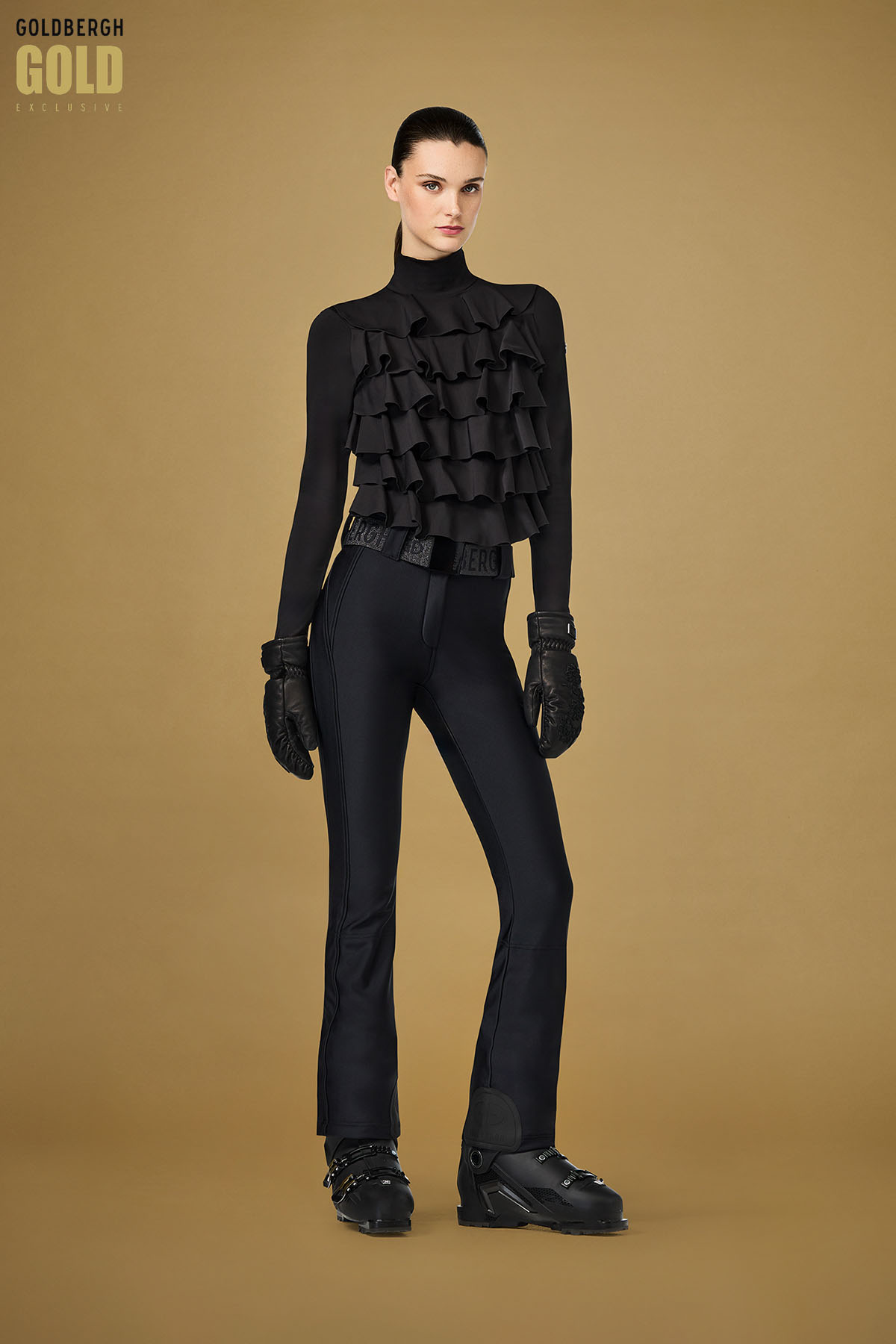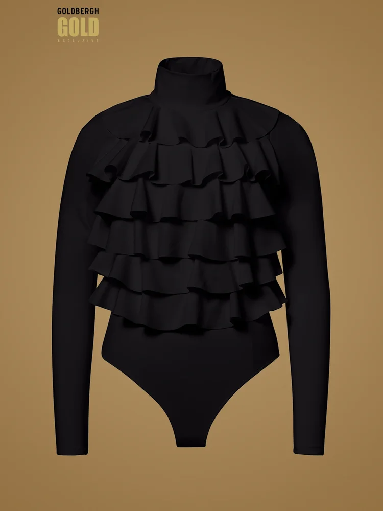 Slim fit body z materiálu powerstretch interlock s jemně kartáčovanou zadní stranou kombinuje komfort a moderní design Úzký stojáček a volánky na předním dílu dodávají elegantní detail, nastavitelná spona v rozkroku umožňuje perfektní přizpůsobení Kovová značka GOLD na rukávu a tkaná značka GOLD na bočním švu podtrhují luxusní vzhled Body odpovídá standardní velikosti