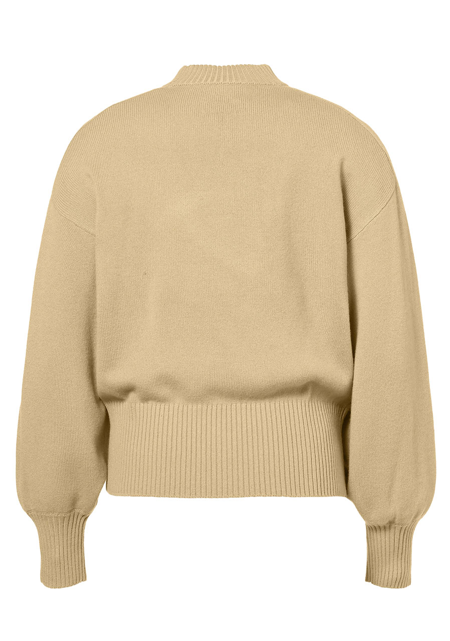 Tento volnější svetr z kašmírové směsi nabízí příjemný a měkký úplet s decentními žebrovanými detaily na lemu, stojáčku a manžetách. Balónové rukávy dodávají modelu módní nádech a zároveň zachovávají pohodlí při nošení. Díky tkané značkové etiketě na boku je svetr elegantním doplňkem pro každodenní i volnočasové outfity.