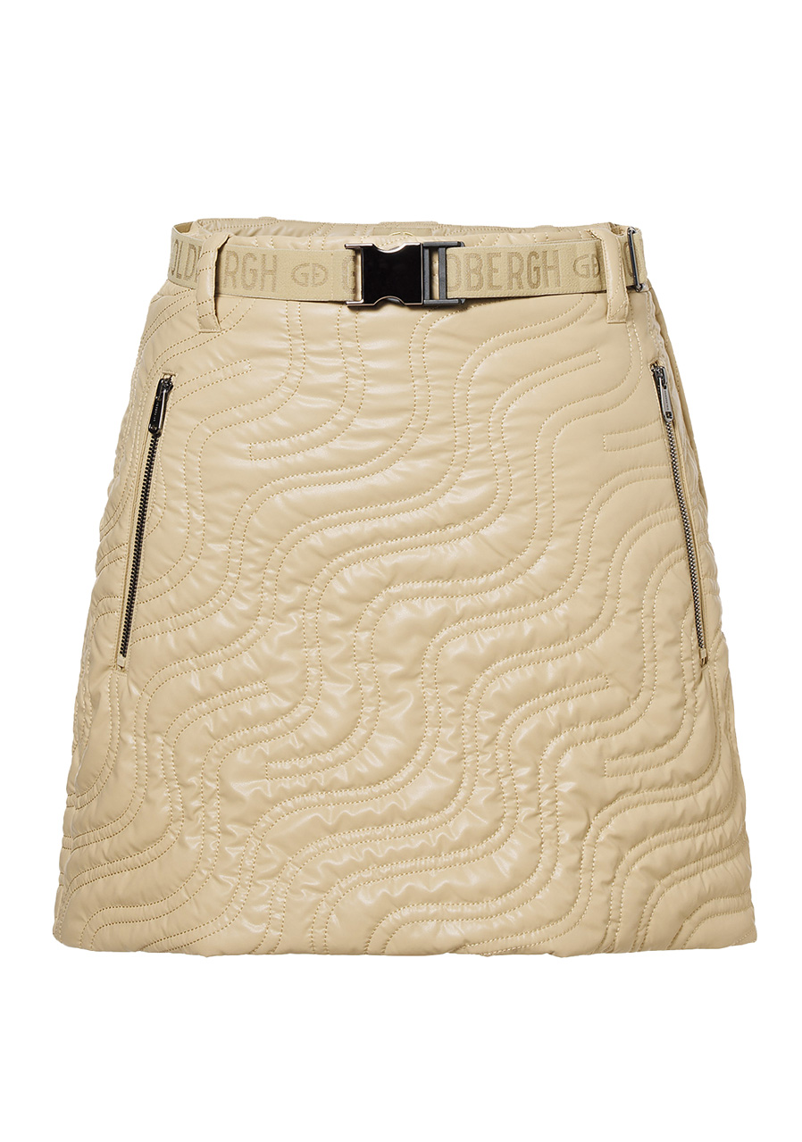 Tato sukně v klasickém regular fit střihu kombinuje pohodlí s funkčností. Disponuje dvěma kapsami a nastavitelným pásem, který umožňuje zvýraznit siluetu. Vyrobena je z částečně recyklovaných materiálů, což z ní činí udržitelnou volbu. Díky kvalitní výplni je vhodná i pro chladnější dny, kdy vás udrží v teple.