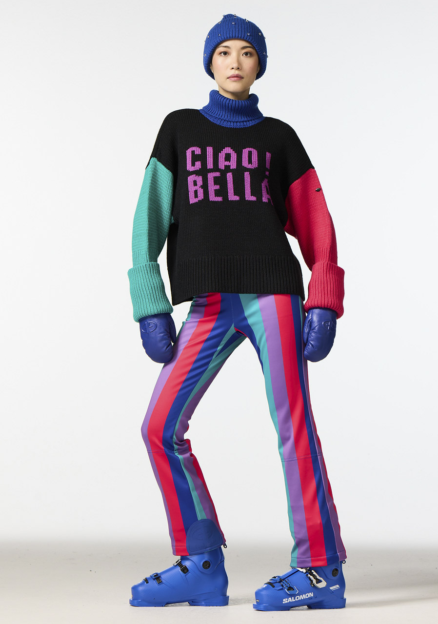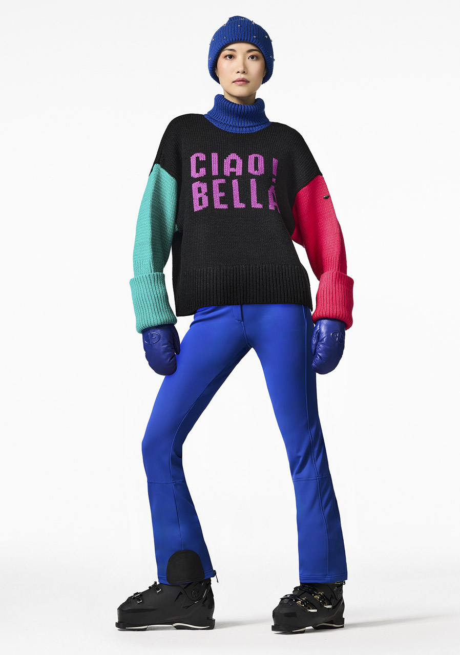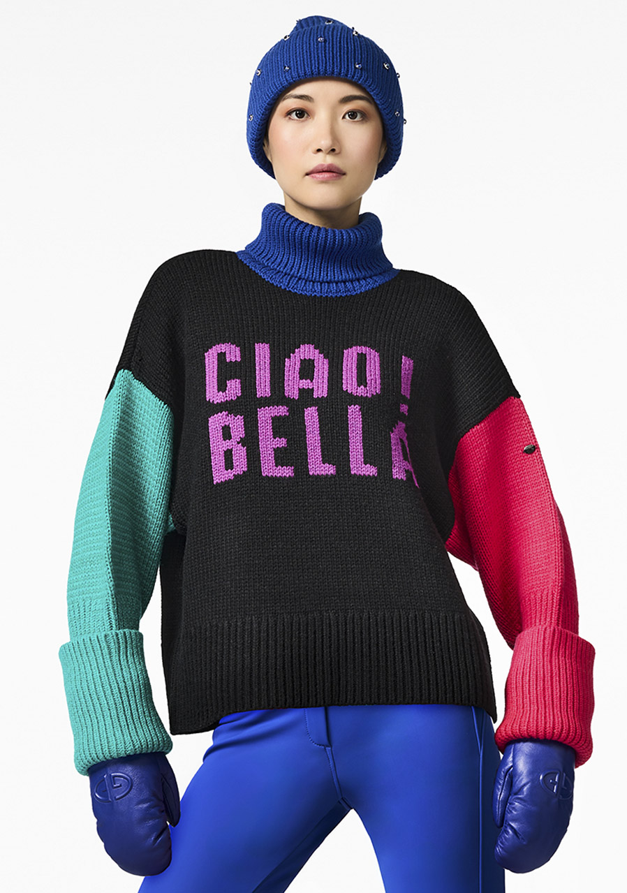 Tento oversized svetr je pletený z hrubšího jednobarevného úpletu s žebrovaným spodním lemem. Rukávy a límec jsou kontrastní barvy a zdobí je žebrované manžety a skládací límec. Na hrudi je jemná intarzie s nápisem „Ciao Bella“. Na rukávu je kovová značka a na boku tkaný štítek s logem značky. Svetr má oversized střih, doporučujeme však zvolit běžnou velikost.