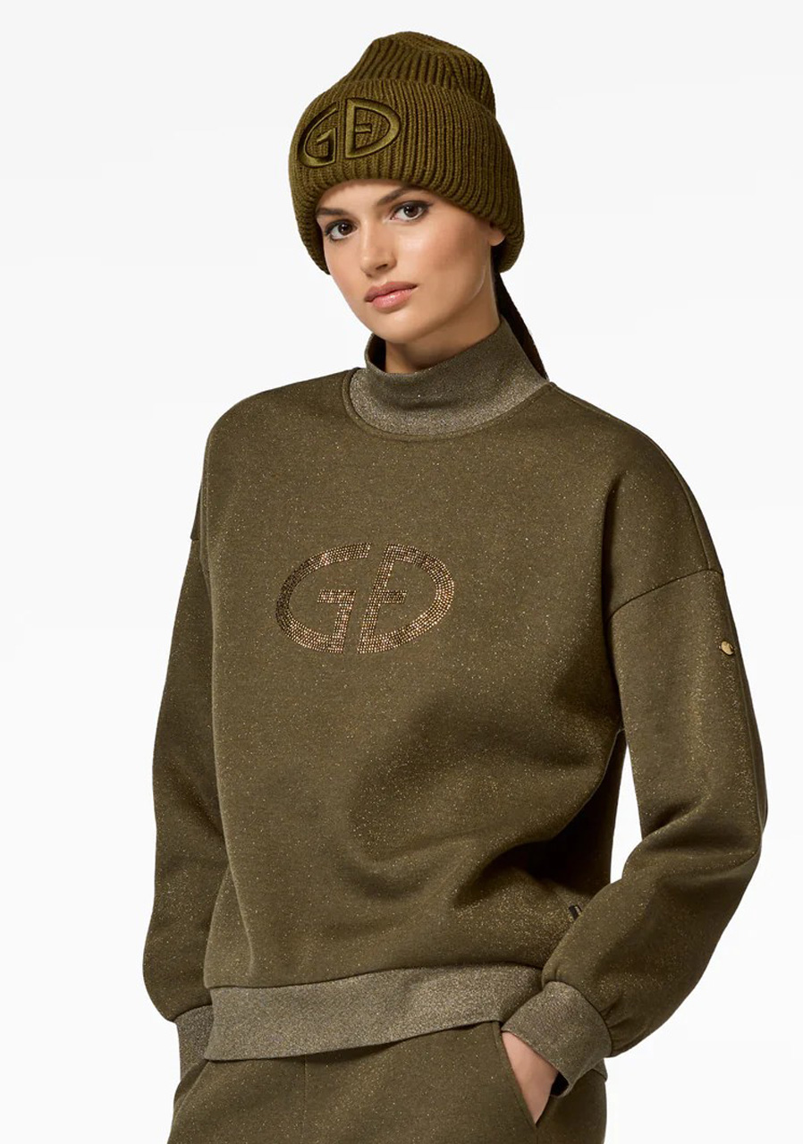 Stylová mikina s volnějším střihem spojuje měkkost a pohodlí fleecu s jemným metalickým leskem díky lurexové přízi na vnější straně. Vnitřní strana je příjemně počesaná pro maximální komfort. Žebrovaný stojáček, lem i manžety zajišťují pohodlné nošení, zatímco výrazné logo GB ze strass kamínků na hrudi dodává celku glamour vzhled. Pro dokonalý komplet ji můžete sladit s tepláky Glimpse ve stejném stylu.
