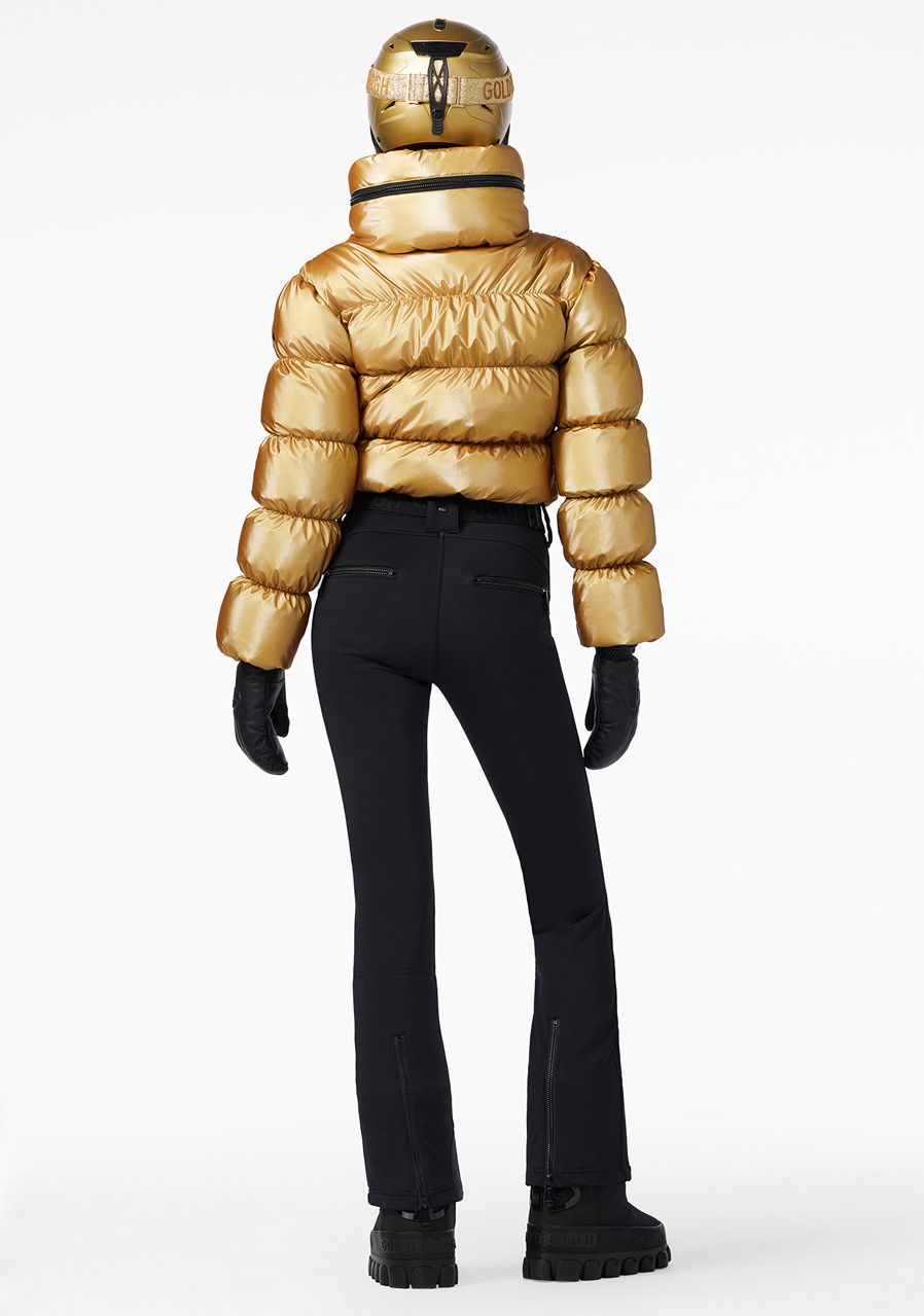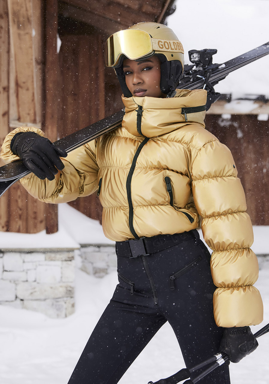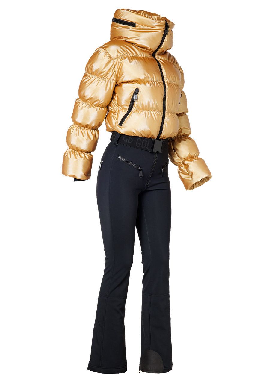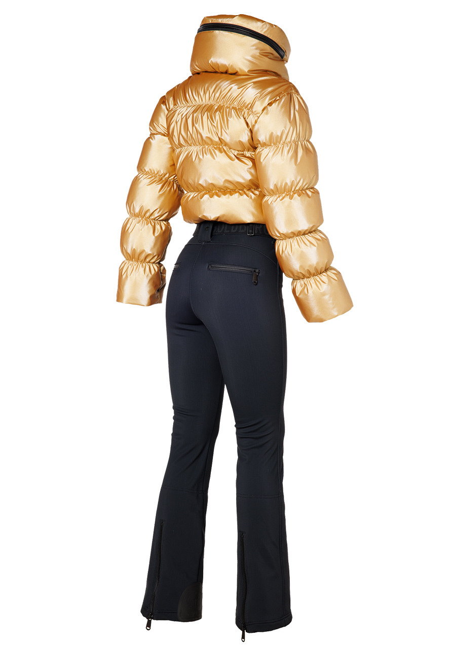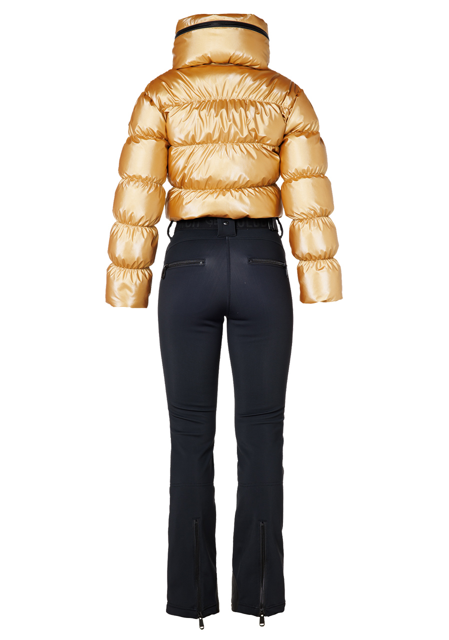 Goldbergh Snowball Ski Suit v kombinaci barev zlatá/černá je luxusní dámská lyžařská kombinéza, která kombinuje styl, funkčnost a udržitelnost. Je vybavena speciálními úpravami a technologiemi pro maximální pohodlí při zimních sportech. Díky voděodpudivé úpravě udržuje majitele v suchu. Vrchní část je zateplená RDS certifikovaným husím peřím, což poskytuje optimální teplo i v extrémních podmínkách. Kombinéza má elegantní střih, který přiléhá k tělu, a je vybavena praktickými detaily jako zipy na zadní straně nohavic, sněhový pás, elastický pásek, prošivané manžety a límec a šest vnějších kapes, dvě vnitřní kapsy a kapsa na skipas. Je ideální pro náročné lyžařky, které hledají styl i vysokou funkčnost.