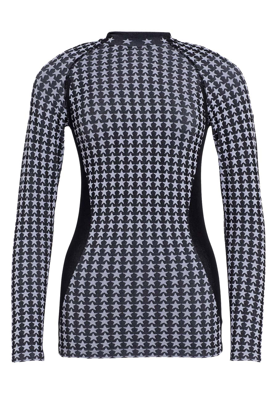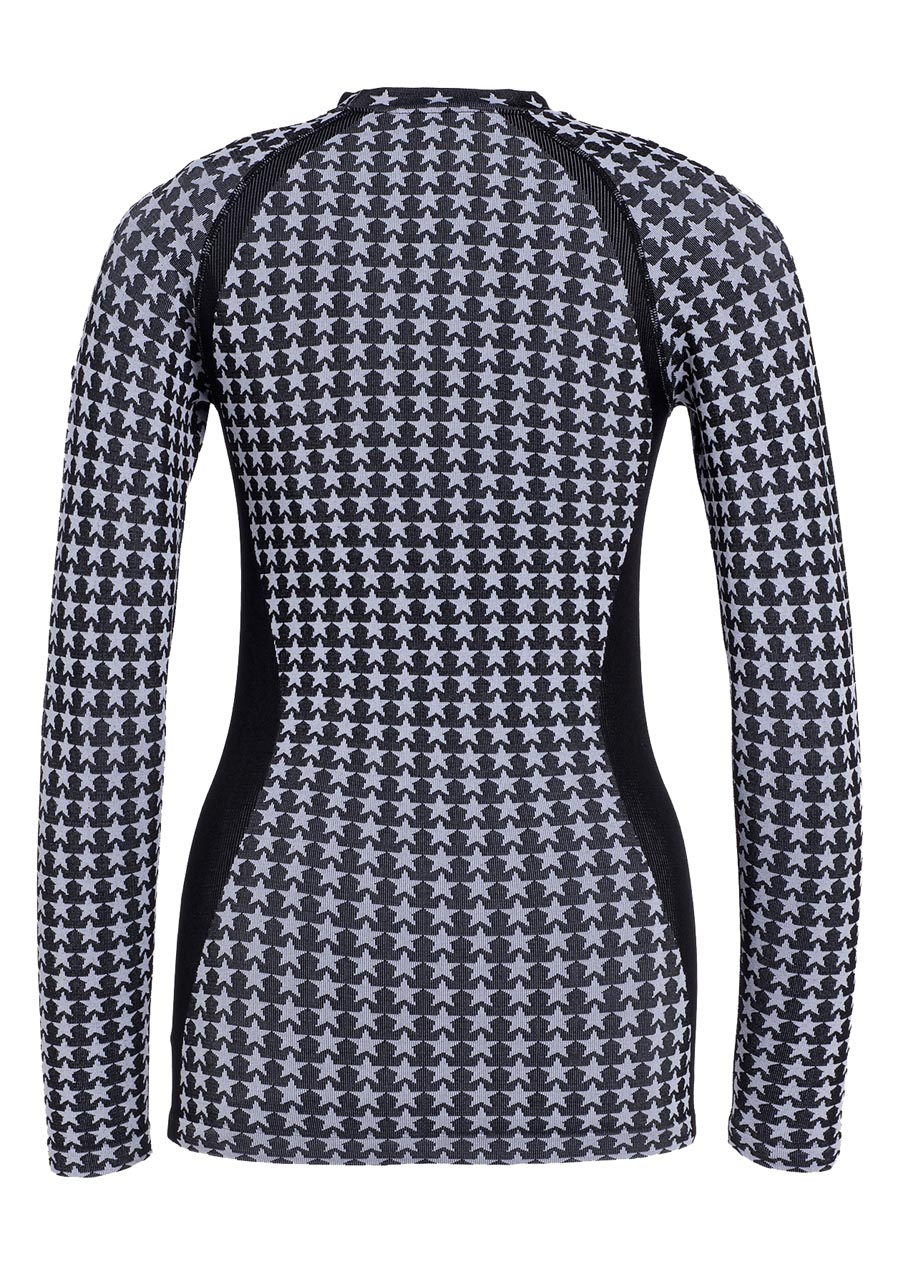 Parametry: Materiál: Bezešvý úplet, odvádění vlhkosti, rychleschnoucí a antibakteriální Složení: 61 % polyamid, 32 % polyester, 7 % elastan Střih: Slim fit, velikost odpovídá standardní velikosti Výstřih: Kulatý Rukávy: Dlouhé Délka: 62,5 cm od středu zad (velikost S-M) Design: Celoplošný hvězdný vzor, kovová etiketa na horním rukávu