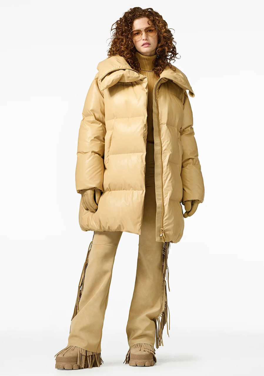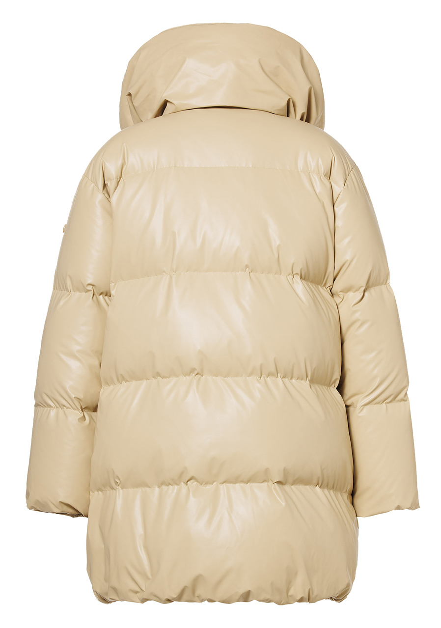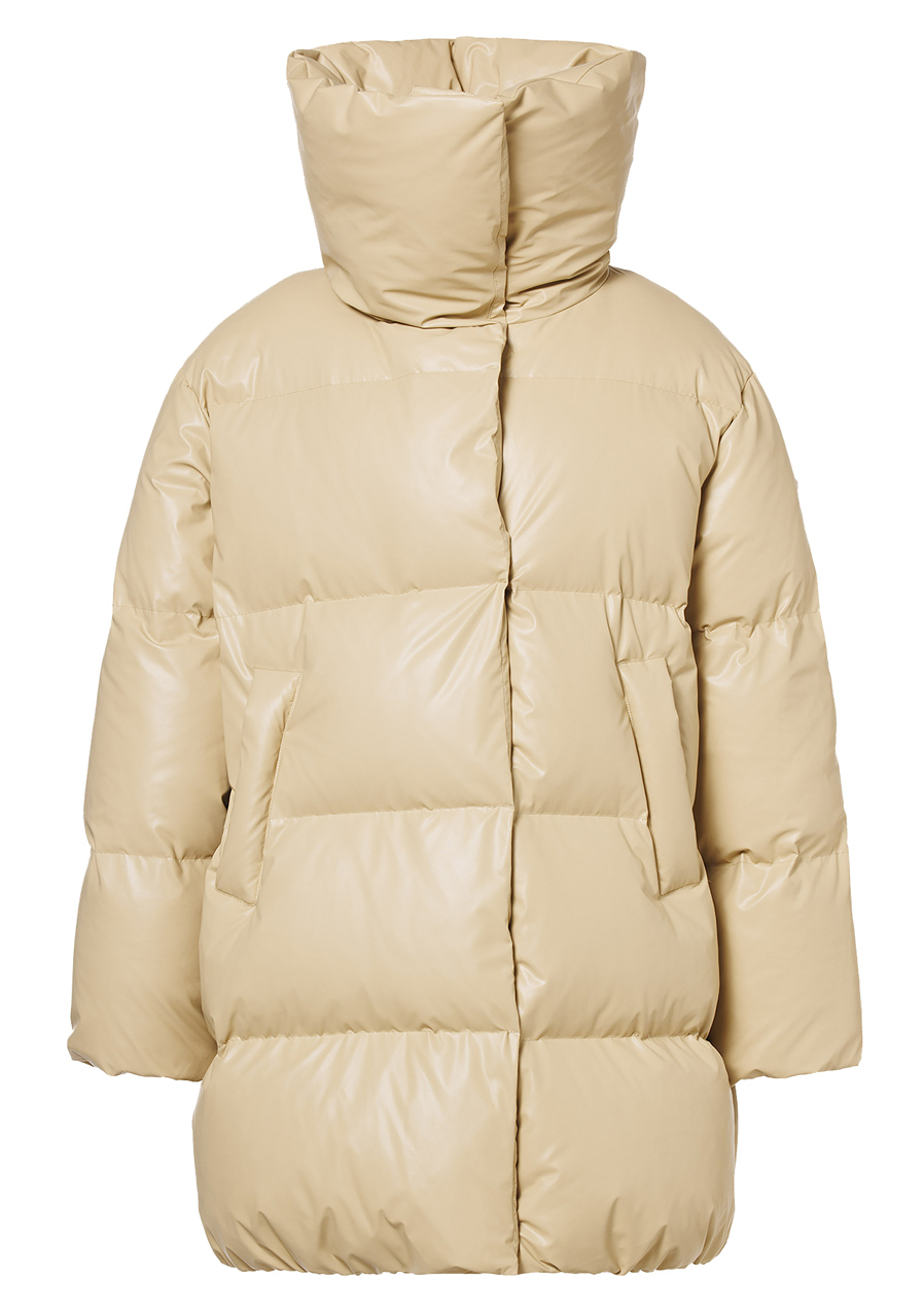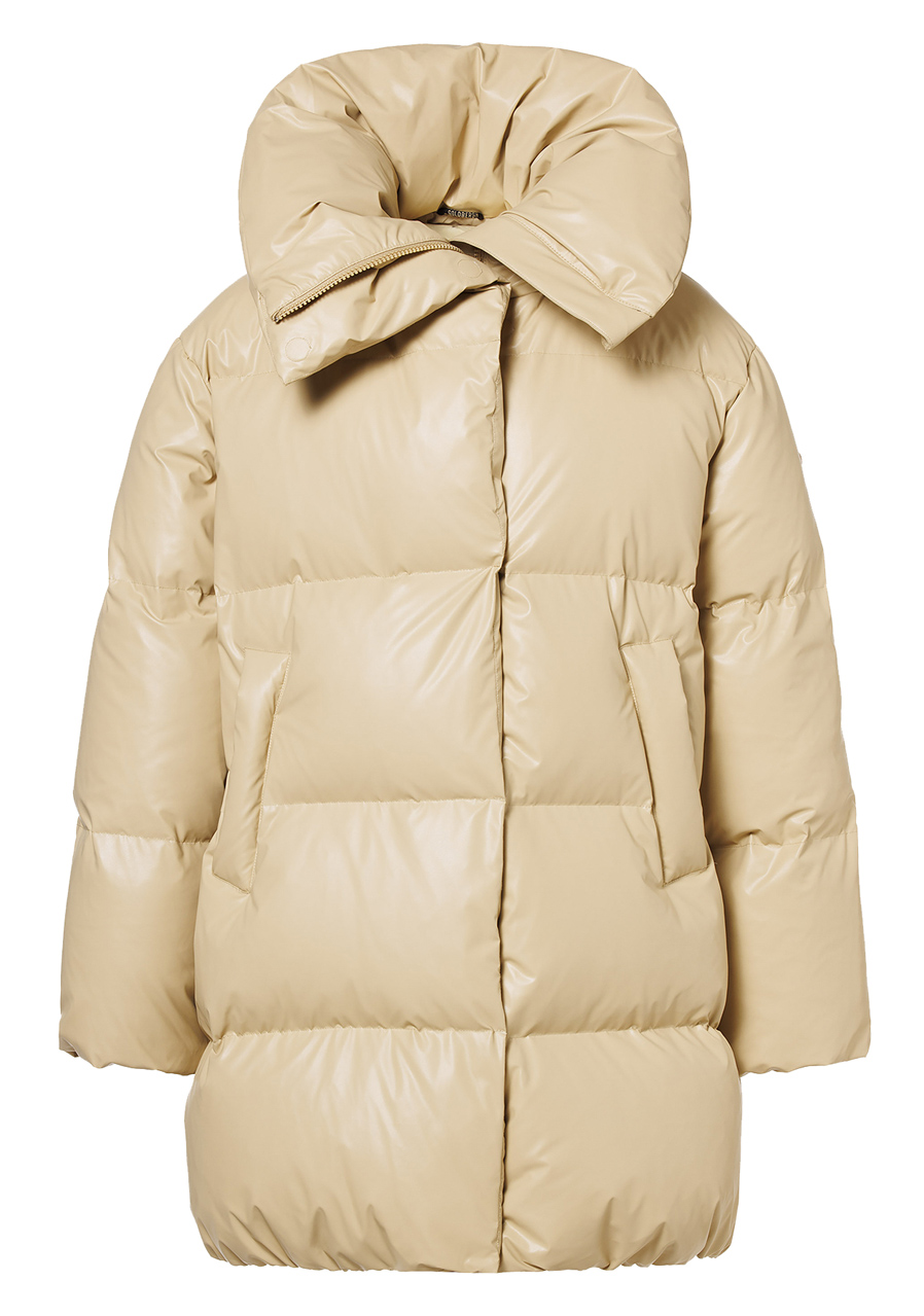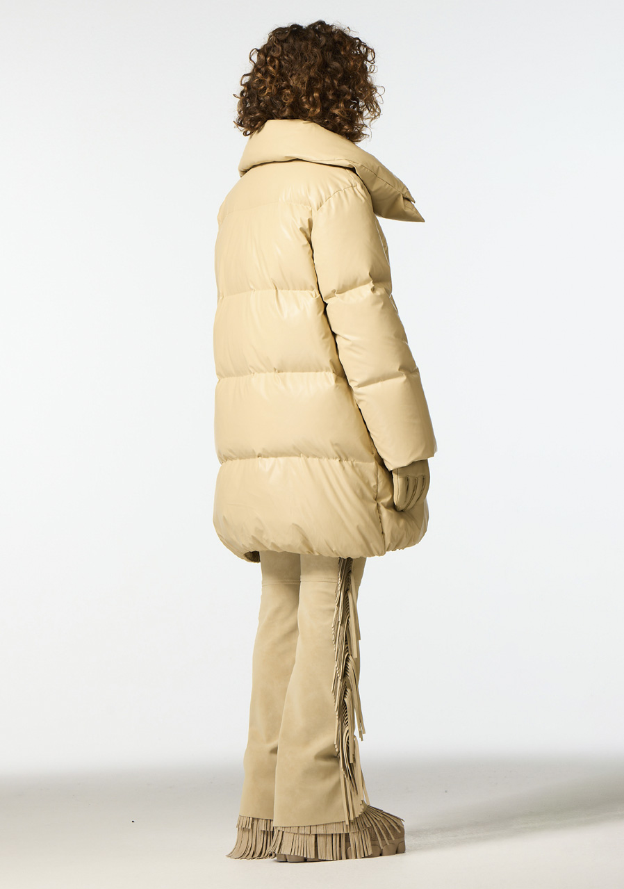 Svrchní materiál: 60 % recyklovaný polyester, 40 % polyuretan Podšívka: 58 % polyester, 42 % recyklovaný polyester Výplň: 90 % prachové kachní peří, 10 % pírka Délka zad: 90 cm (velikost 38)