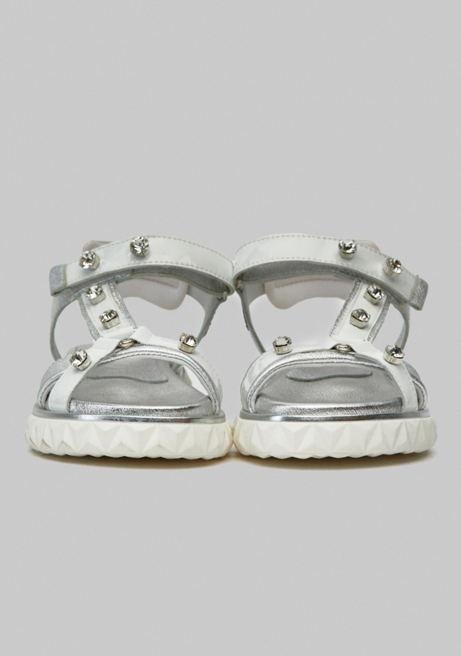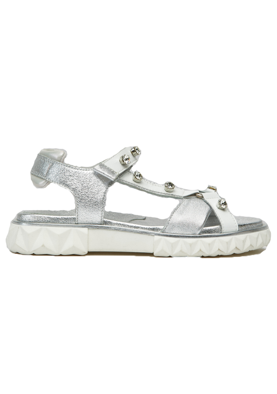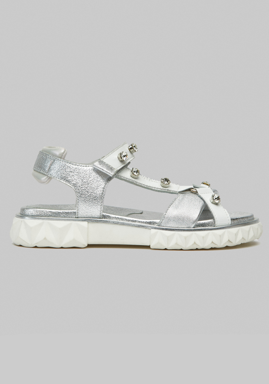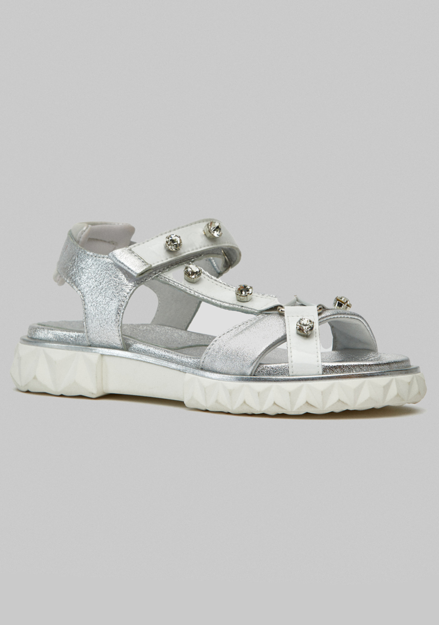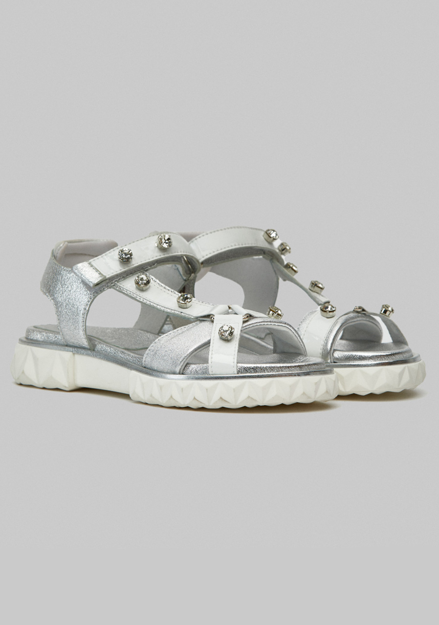 Pohodlné, praktické a módní sandály vyrobené ze stříbrné zbarvené nubukové kůže a lesklé bílé látky zdobené křišťálovými kamínky.