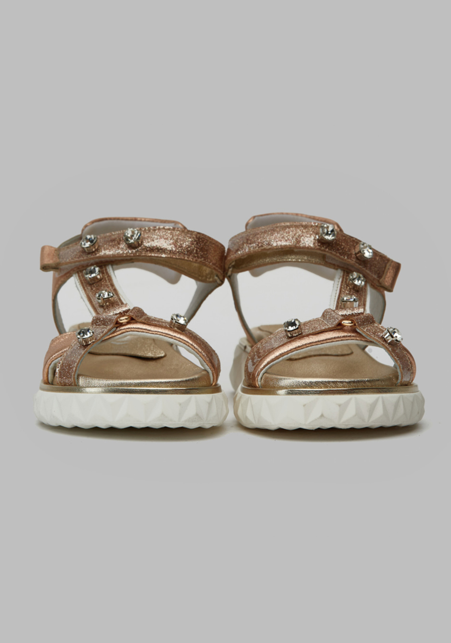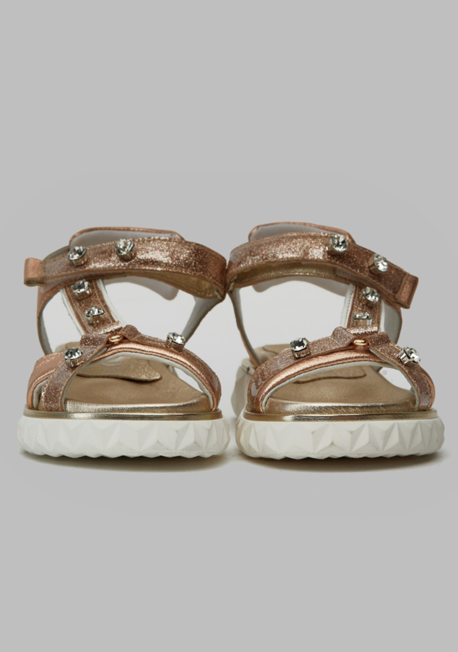 Pohodlné, praktické a módní sandály vyrobené z růžově zbarvené kůže a lesklé bílé látky zdobené křišťálovými kamínky.