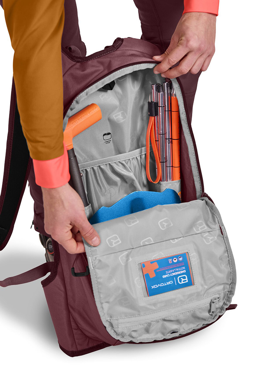 Kapsy: hlavní komora, kapsa na lavinové vybavení, bezpečnostní kapsa