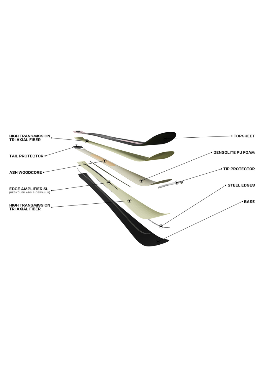 Díky technologii Edge Amplifier SL je zajištěn lepší přenos energie na hrany, což výrazně zlepšuje držení na tvrdém povrchu. Lehká konstrukce s dřevěným jádrem a titaniovou výztuhou zaručuje optimální tlumení vibrací a snadnou ovladatelnost. Semi Sandwich Sidewalls dodávají lyžím pevnost a přesnost při změnách směru.