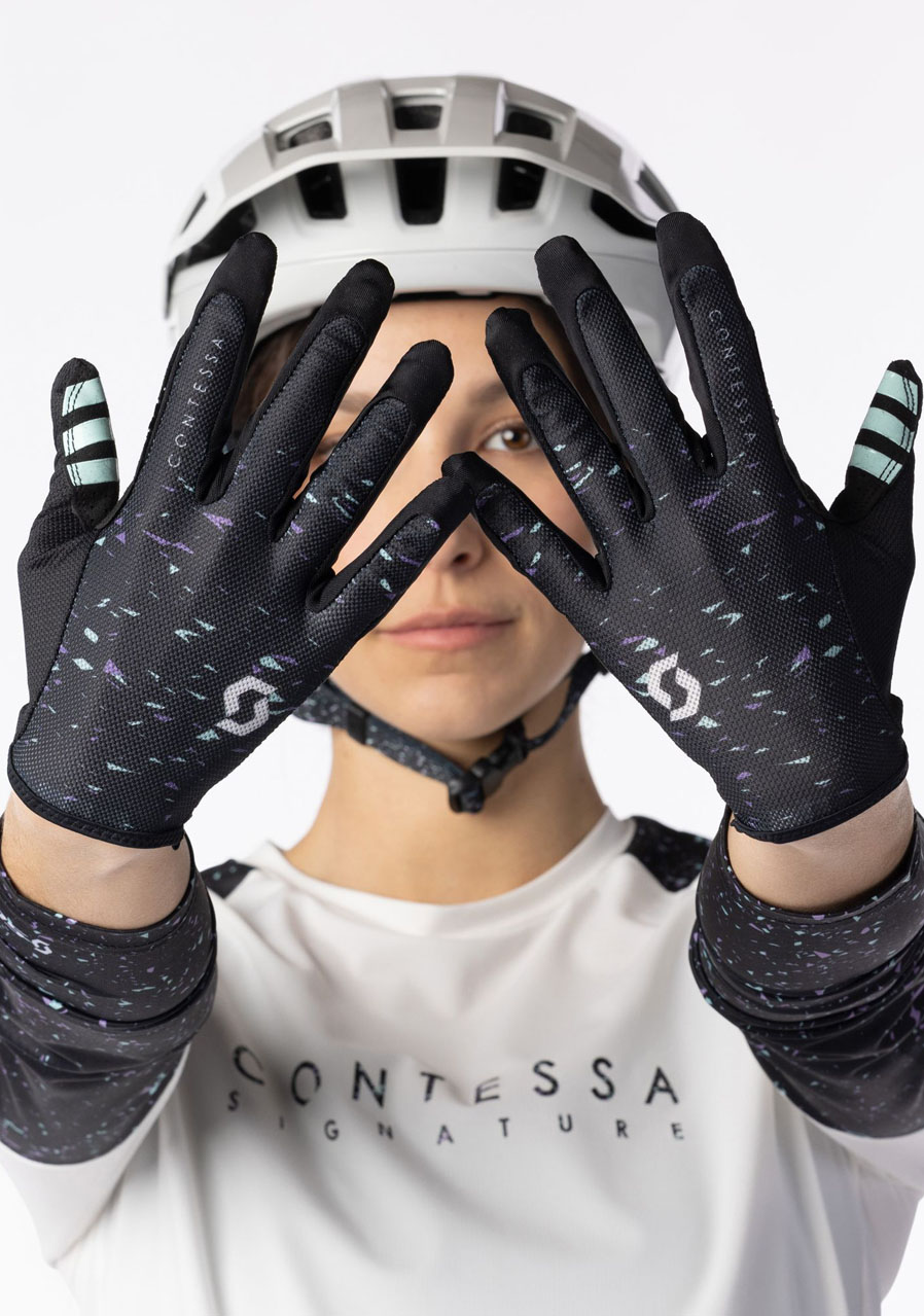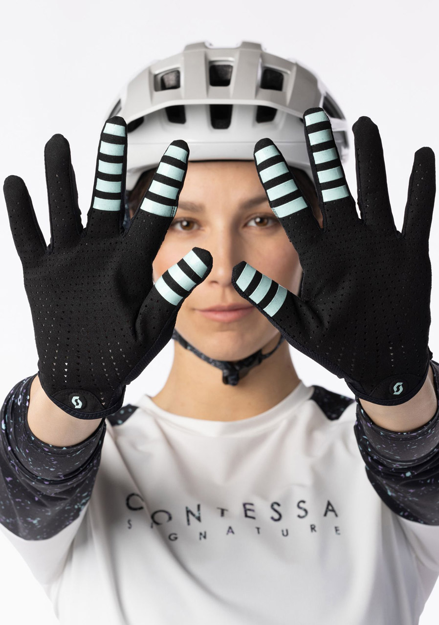 Silná, ženská a rychlá, naše kolekce Contessa Signature Collection byla ručně vytvořena pro ženy, které to myslí vážně s tím, jak jejich kola a vybavení vypadají a fungují. Rukavice SCOTT Traction Contessa s dlouhými prsty jsou vyrobeny z vysoce prodyšné strečové síťoviny na hřbetu ruky a perforované dlaně, takže při intenzivním nabíjení budete mít jistotu, že se ochladí. Speciální konstrukce prstů s menším počtem švů a silikonovým potiskem navíc nabízí dokonalou obratnost a přilnavost, kterou na řídítkách potřebujete. Podpisová série Contessa. Tak se válím. Méně švů v konstrukci prstů Prodyšná síťovina na hřbetu ruky Vysoce perforovaná dlaň Exkluzivní Contessa Sig. Branding Skrytý magnet pro uchycení páru