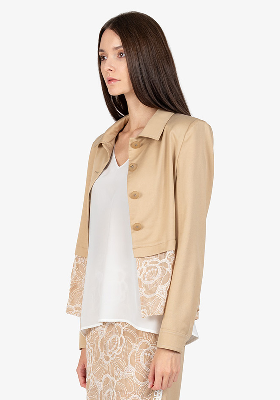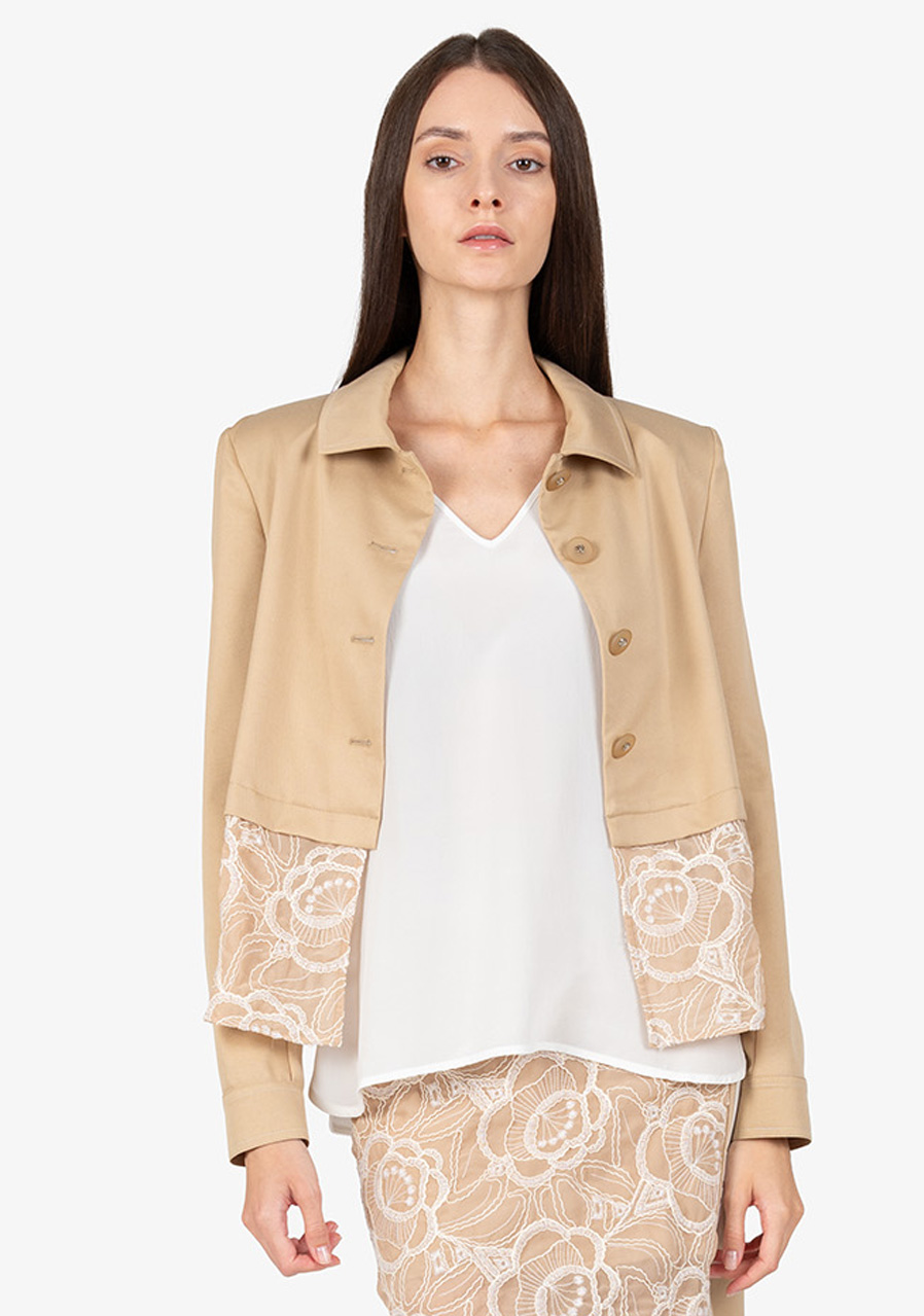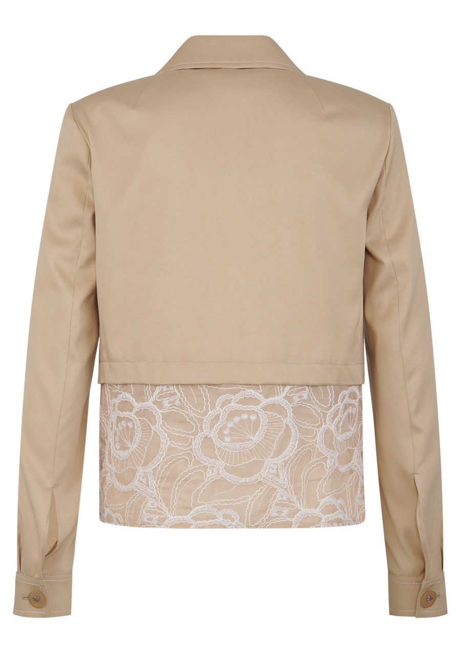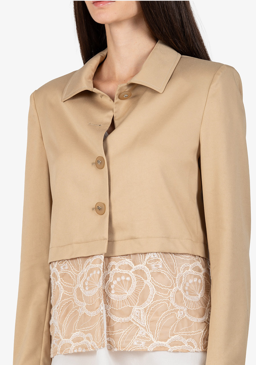 Materiál: bavlněná kvalita kombinovaná s jemnou krajkou Vzor: květinová krajka Střih: krátký, lichotící postavě Styl: elegantní, trendy Límec: košilový límeček Rukávy: dlouhé rukávy s manžetami Zapínání: zapínání na knoflíky uprostřed vpředu Zvýraznění: krajkový detail na lemu, kontrastní prošívání na manžetách a límci