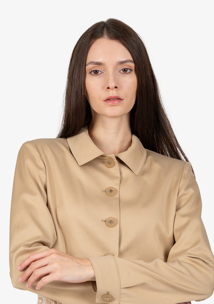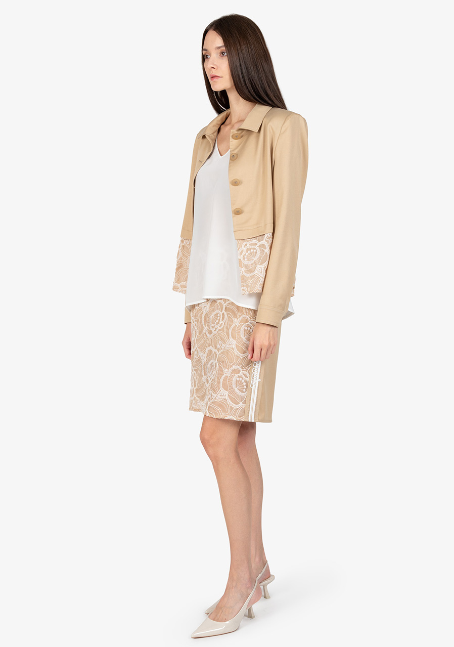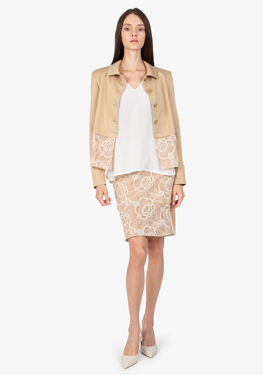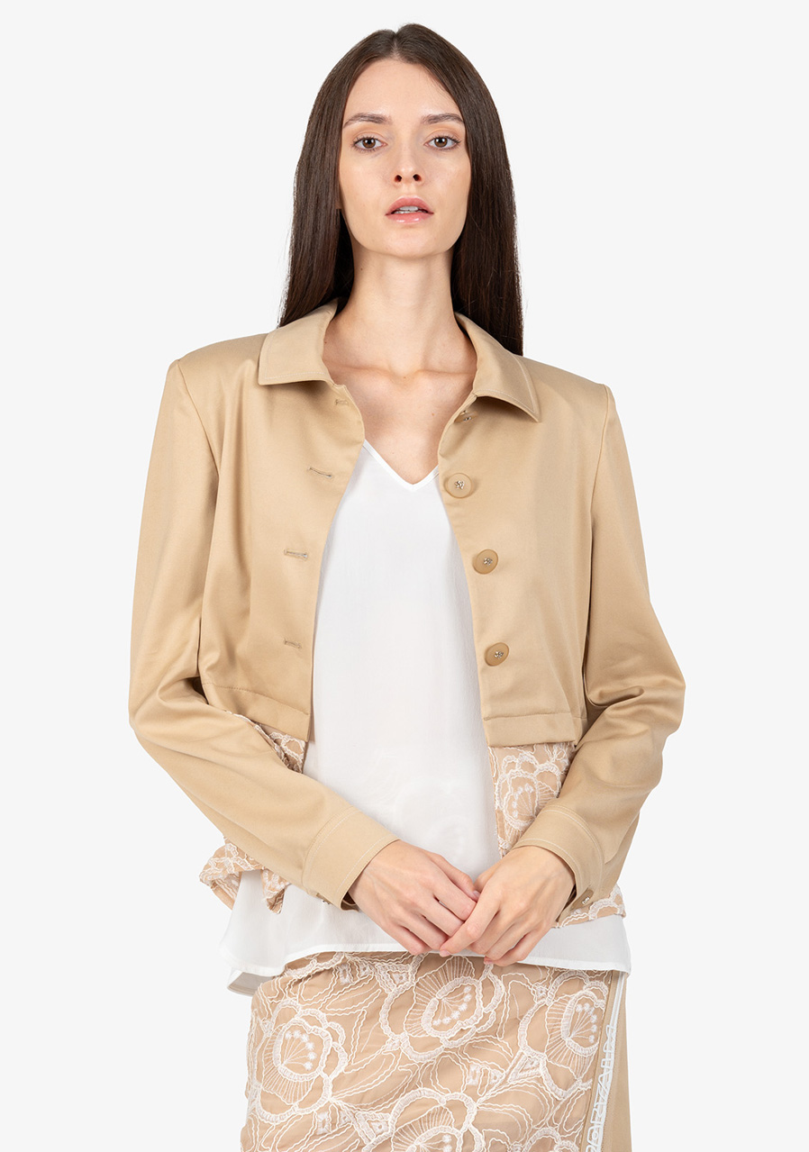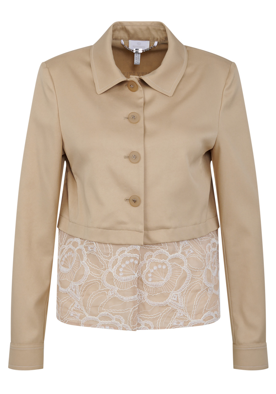 Materiál: bavlněná kvalita kombinovaná s jemnou krajkou Vzor: květinová krajka Střih: krátký, lichotící postavě Styl: elegantní, trendy Límec: košilový límeček Rukávy: dlouhé rukávy s manžetami Zapínání: zapínání na knoflíky uprostřed vpředu Zvýraznění: krajkový detail na lemu, kontrastní prošívání na manžetách a límci