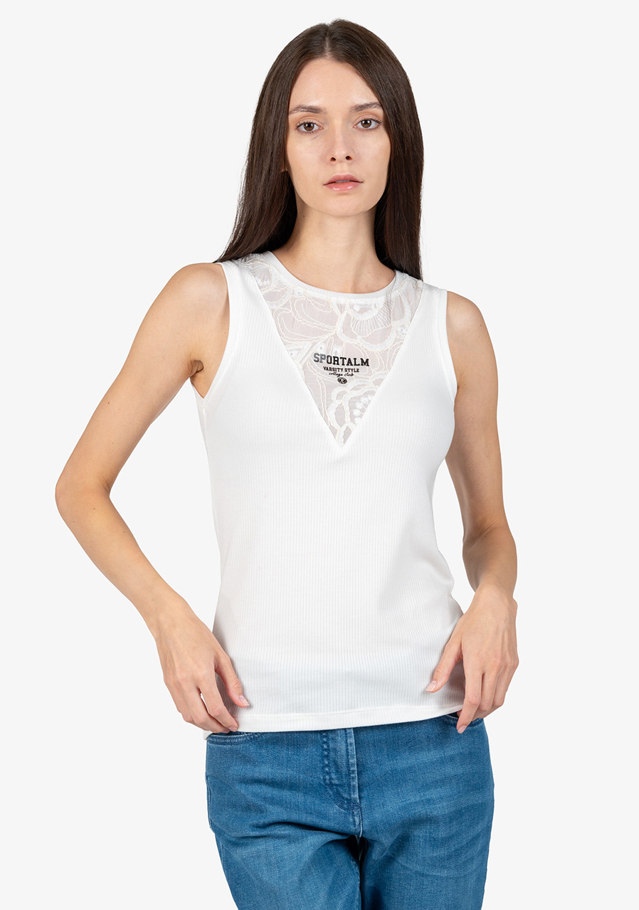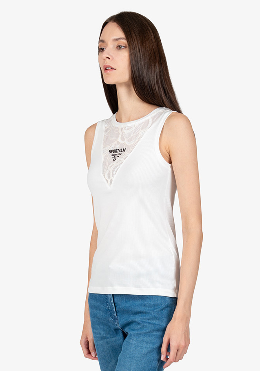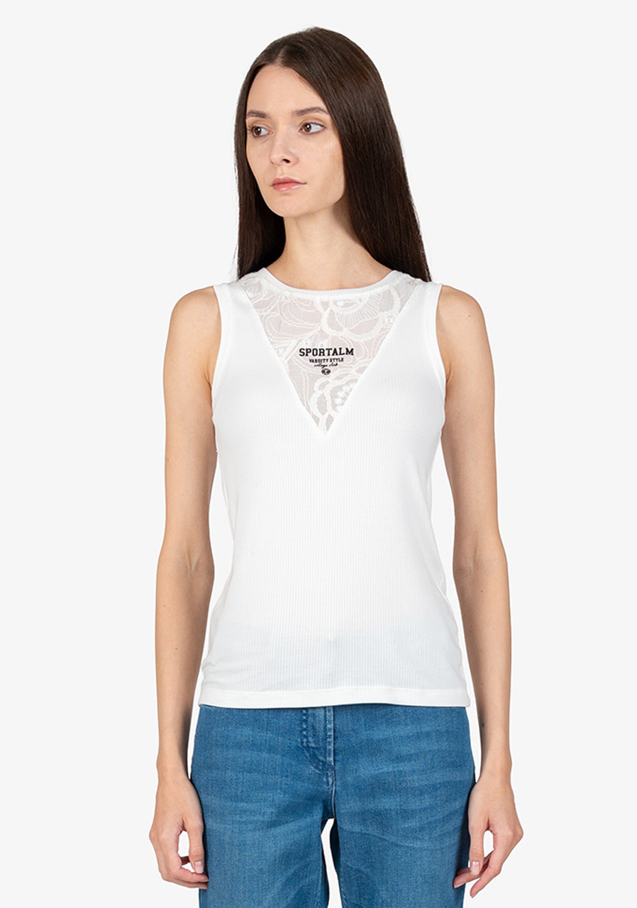 Tento přiléhavý dámský top je skvělou volbou pro každodenní nošení i speciální příležitosti. Přední část zdobí průhledná květinová krajka s jemnou vsadkou a 3D potiskem loga Sportalm, která dodává modelu elegantní a zároveň moderní nádech.