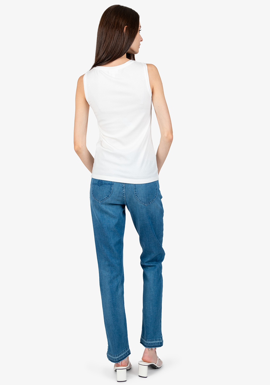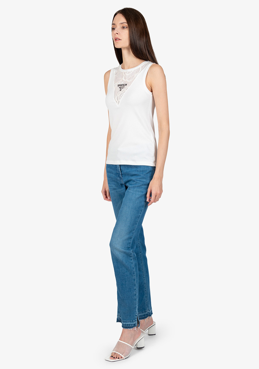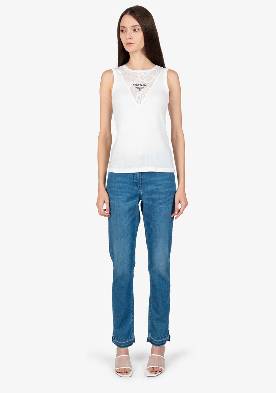 Tento přiléhavý dámský top je skvělou volbou pro každodenní nošení i speciální příležitosti. Přední část zdobí průhledná květinová krajka s jemnou vsadkou a 3D potiskem loga Sportalm, která dodává modelu elegantní a zároveň moderní nádech.