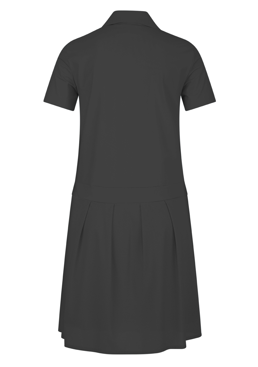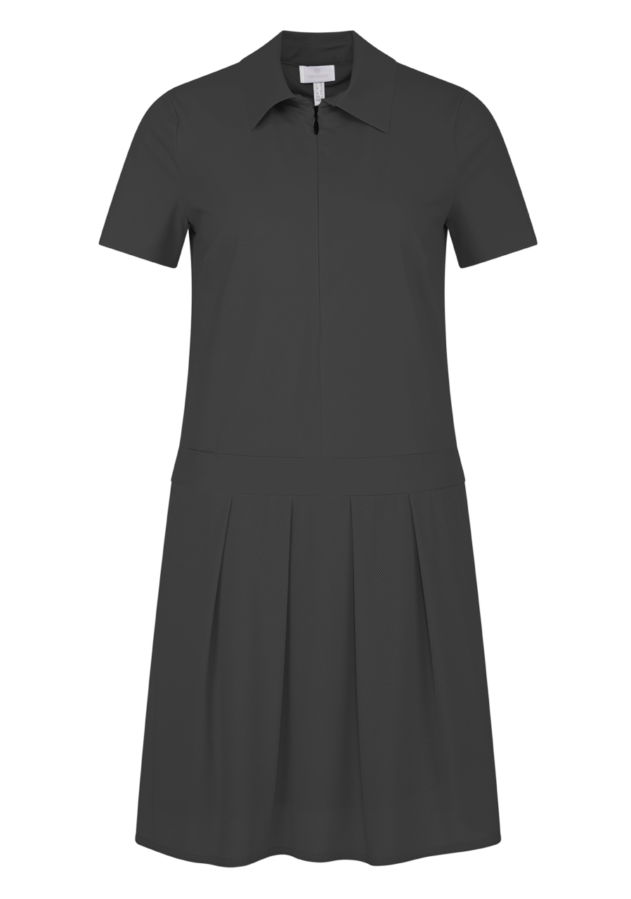 Přiléhavý střih, sportovní styl, košilovýlímec s neopracovanými okraji, krátké rukávy s neopracovanými okraji, skrytý zip uprostřed vpředu, boční, skrytá kapsa na zip v horní části sukně, malá skrytá kapsa na zip v pase, skládaná sukně s kraťasy pod ní, neopracované okraje. Částečně podšité elegantní sportovní šaty, které zaujmou nejen na greenu, ale i mimo něj.