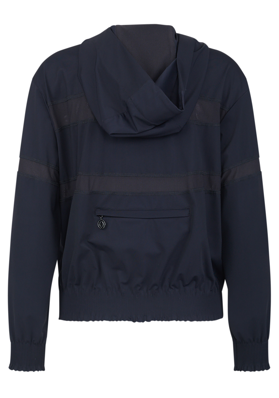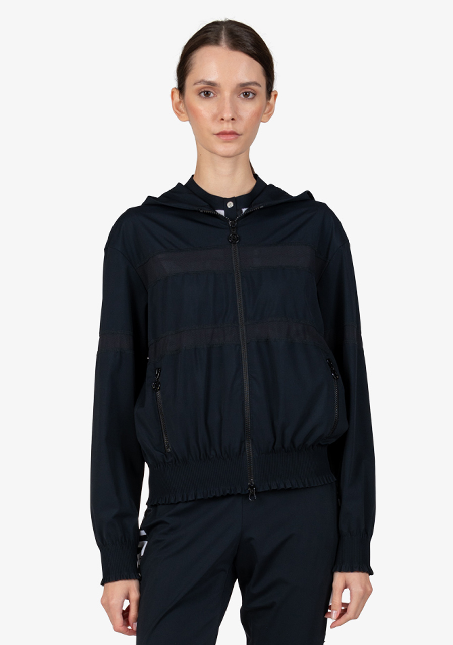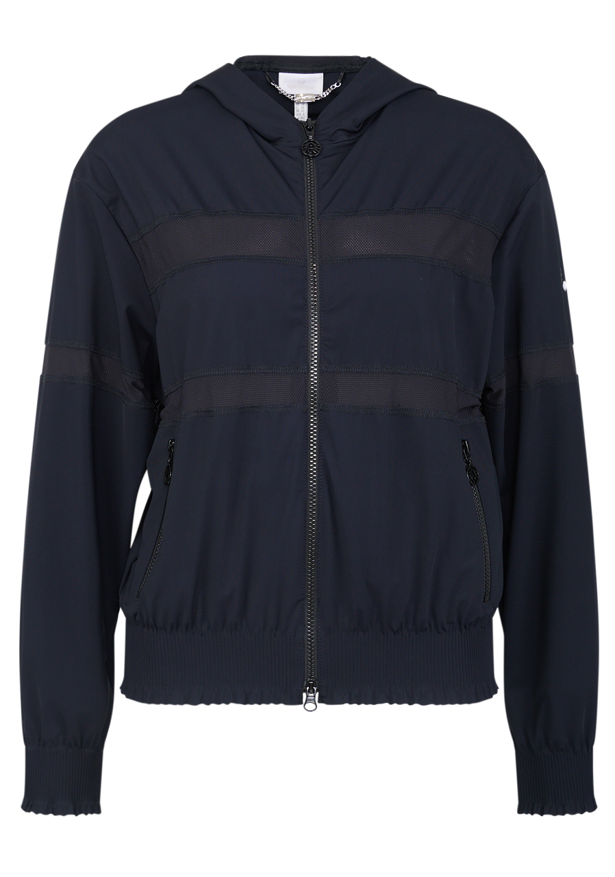 Volný střih, módní sportovní styl, široké rukávy s manžetami s žebrovaným lemováním, snížená ramena, viditelný oboucestný zip uprostřed předního dílu, viditelné kapsy na zip vpředu, lemovaná kapsa se zipem vzadu v pase, otevřený okraj, lem s žebrovaným lemováním, vložené pruhy jsou zvýrazněny saténovými stuhami¨,
