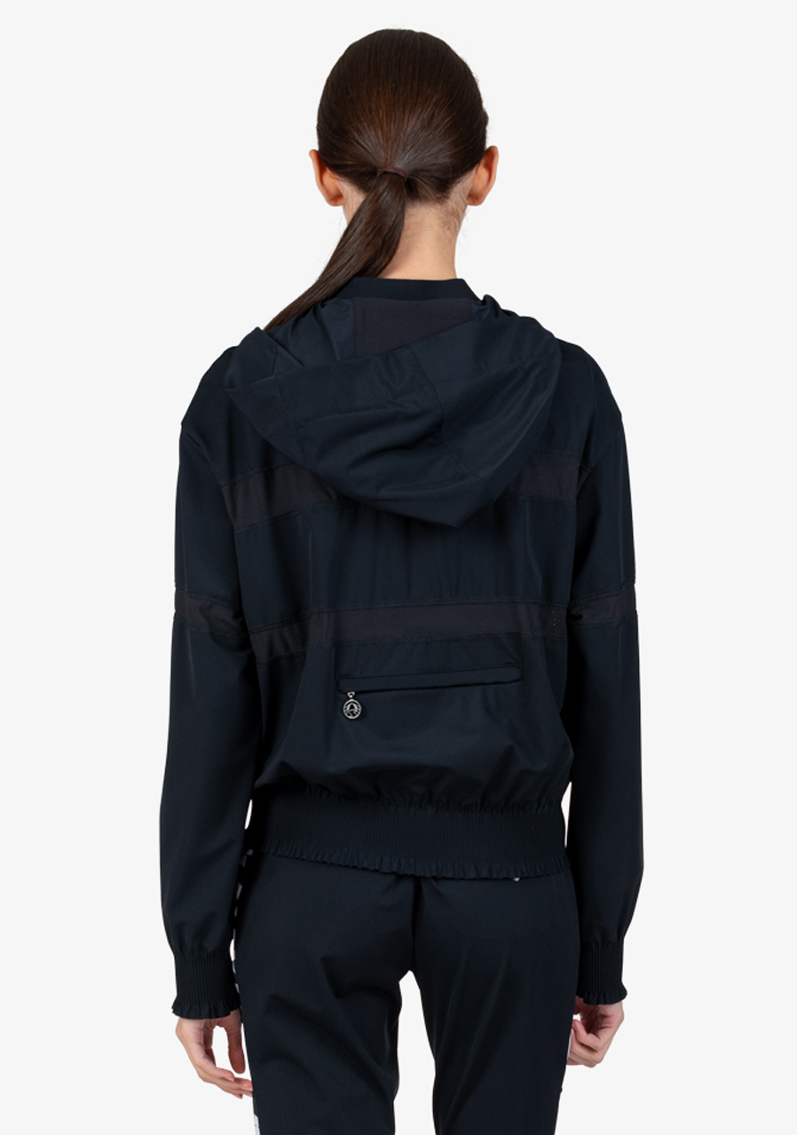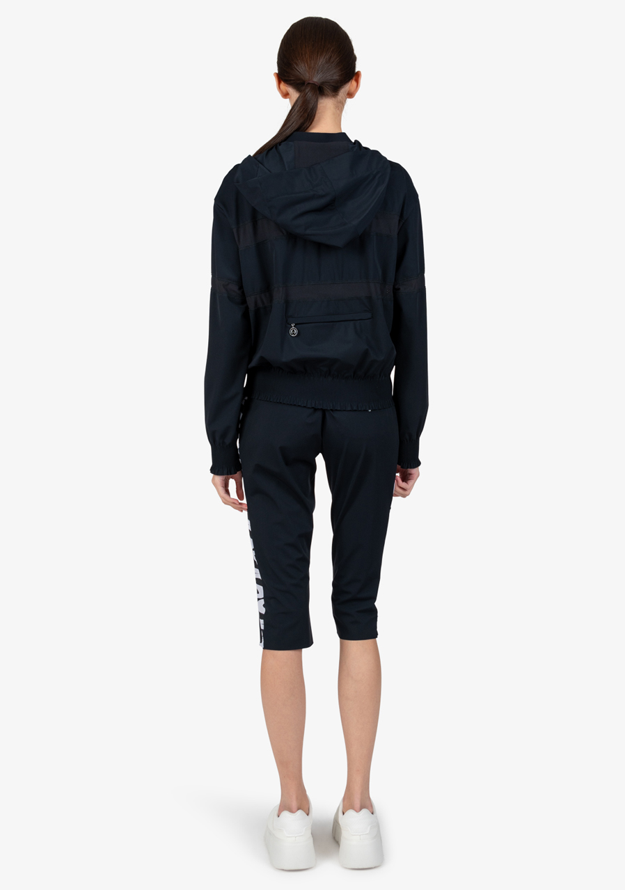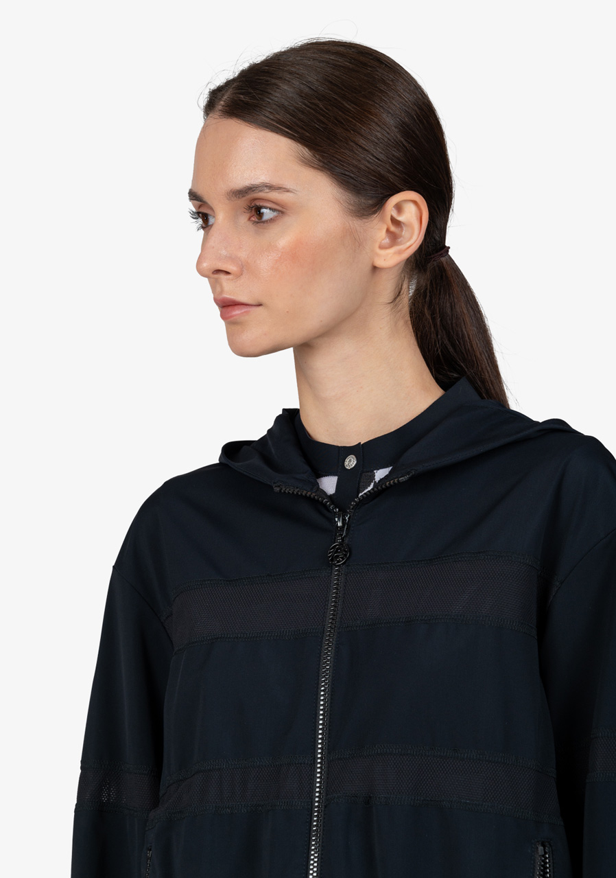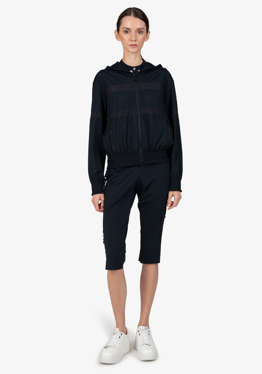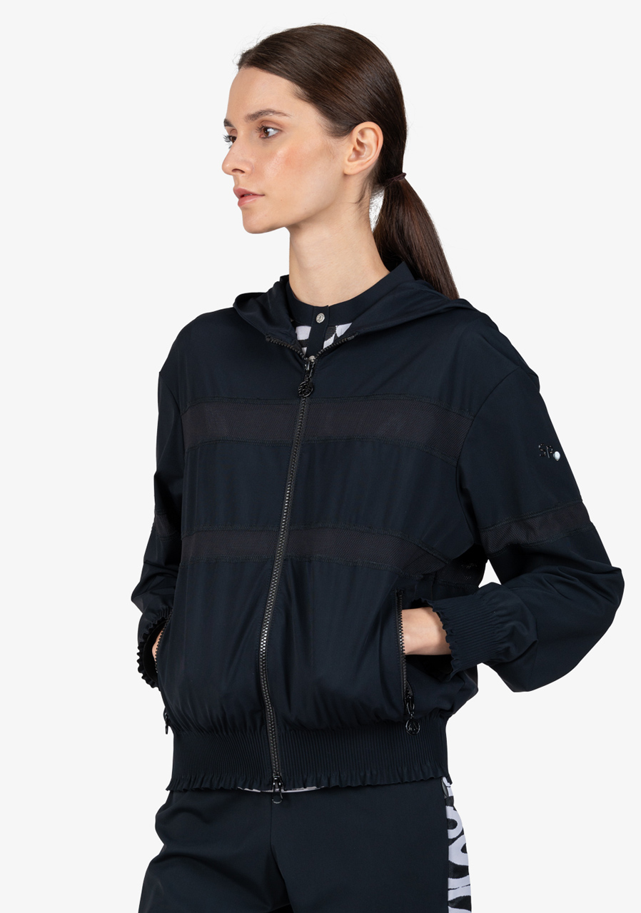Dámská zkrácená volná bunda s kapucí pruhovaným designem a efektními detaily. Je ideální pro sportovní i elegantní kombinace a díky pohodlnému střihu ji využijete každý den