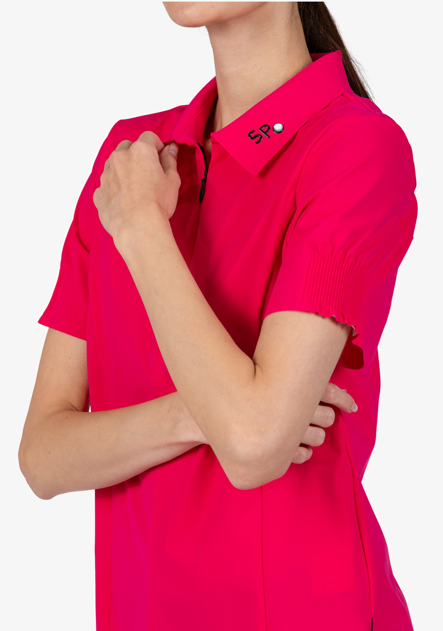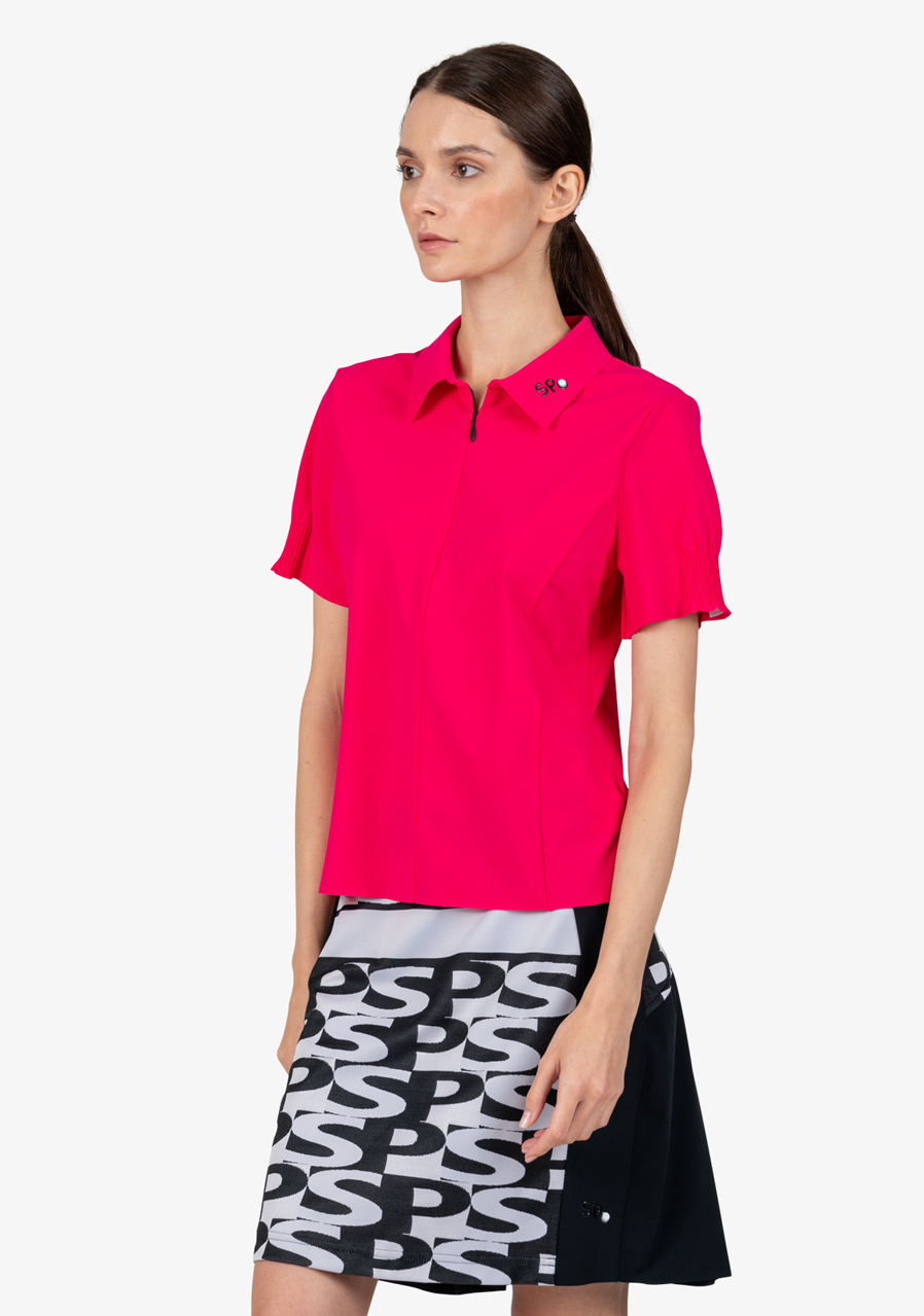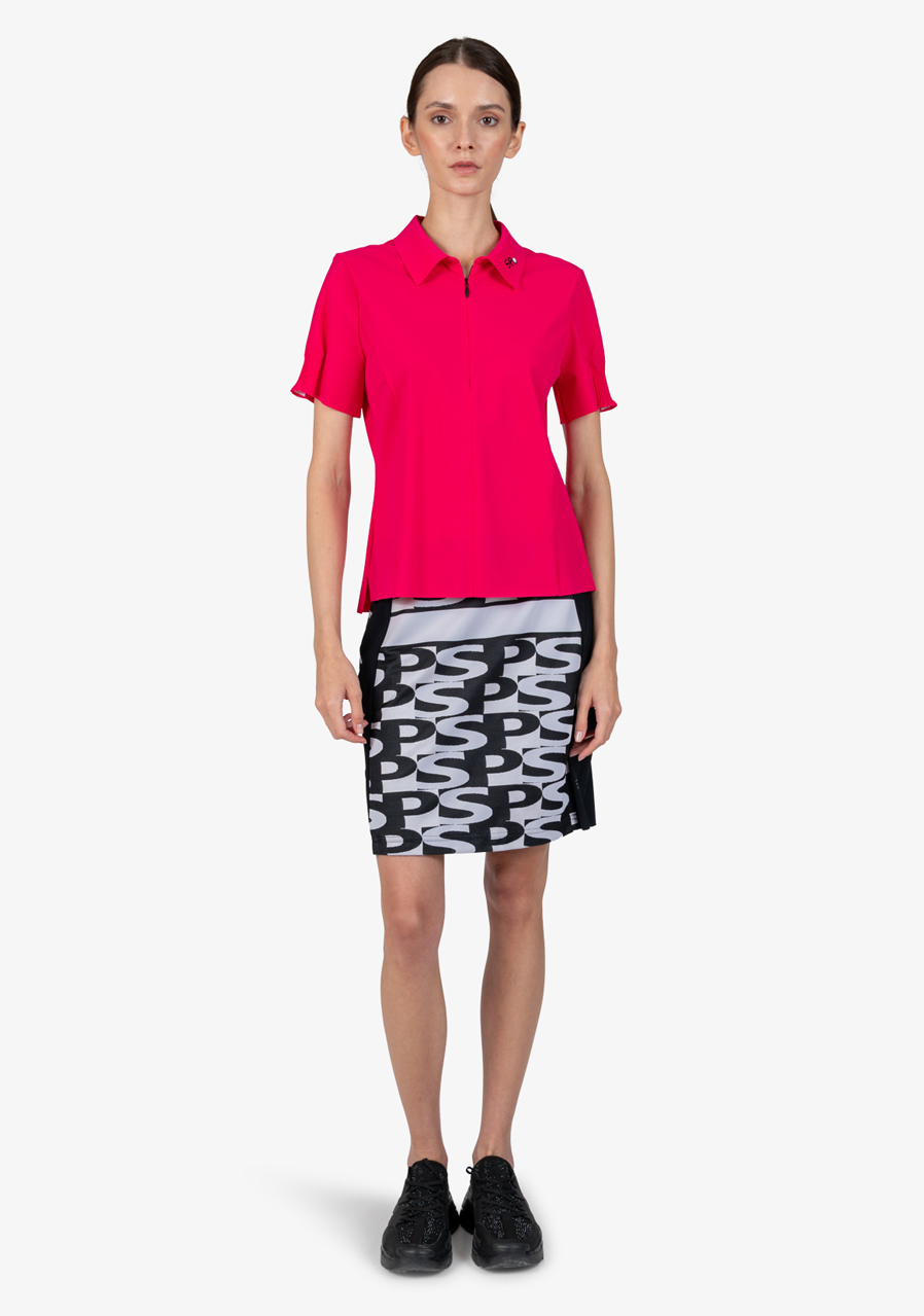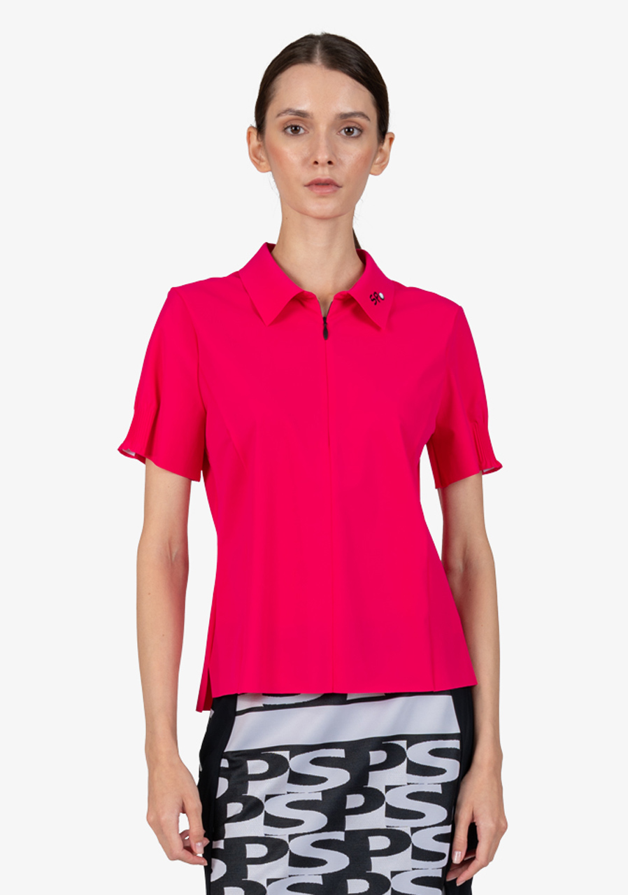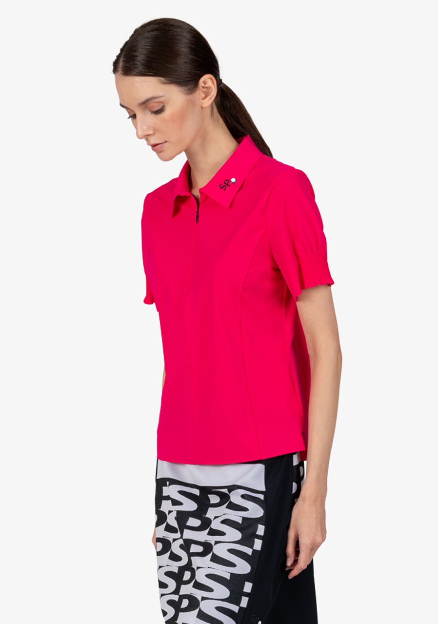 Další parametry: Mírně přiléhavý střih, sportovně módní styl, košilový límeček, otevřený okraj, krátké rukávy s žebrovaným lemem a gumou uvnitř, technický žerzej. Otevřený lem, krátké boční rozparky, malý skrytý zip uprostřed přední části, malý transferový potisk na límečku.