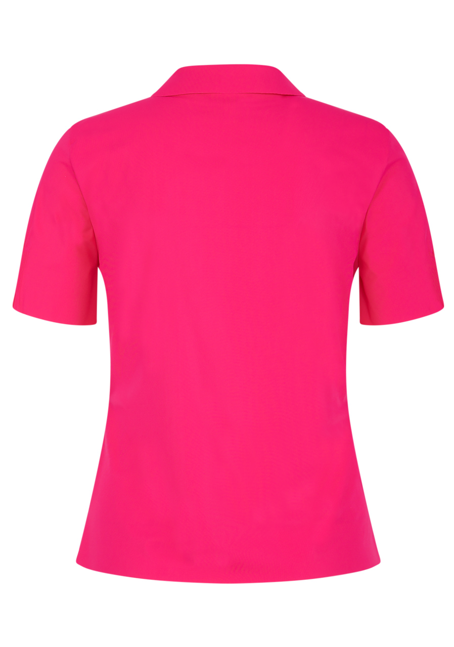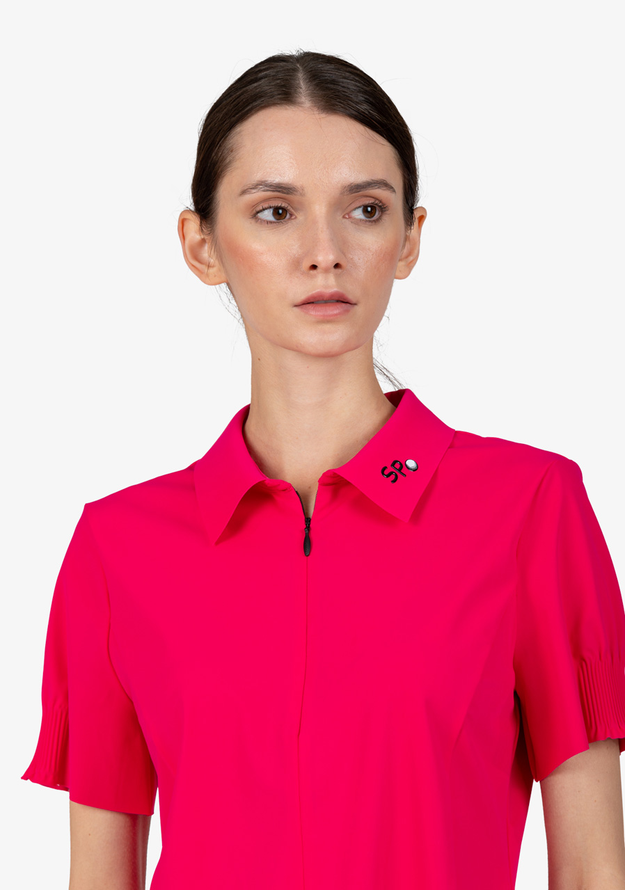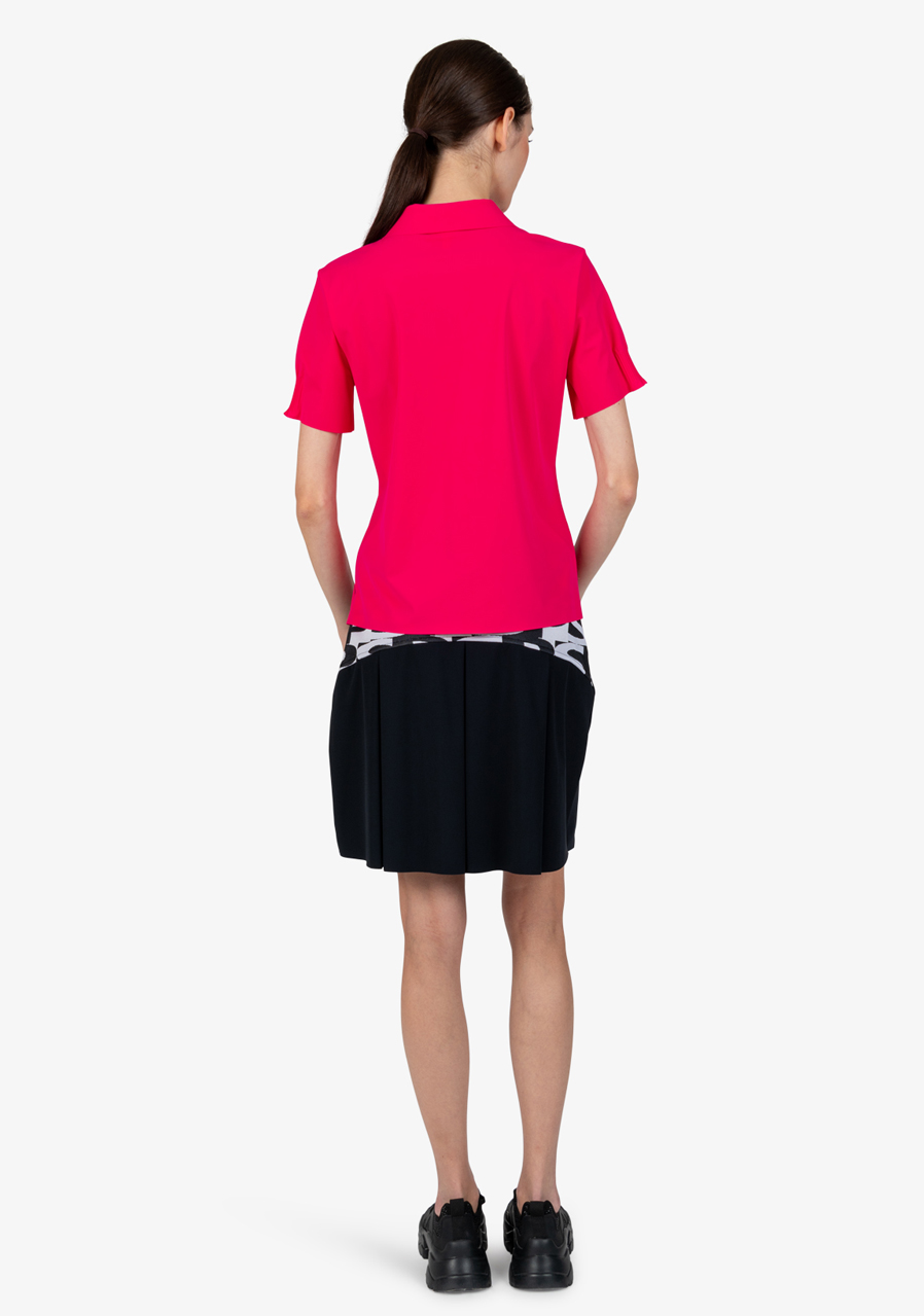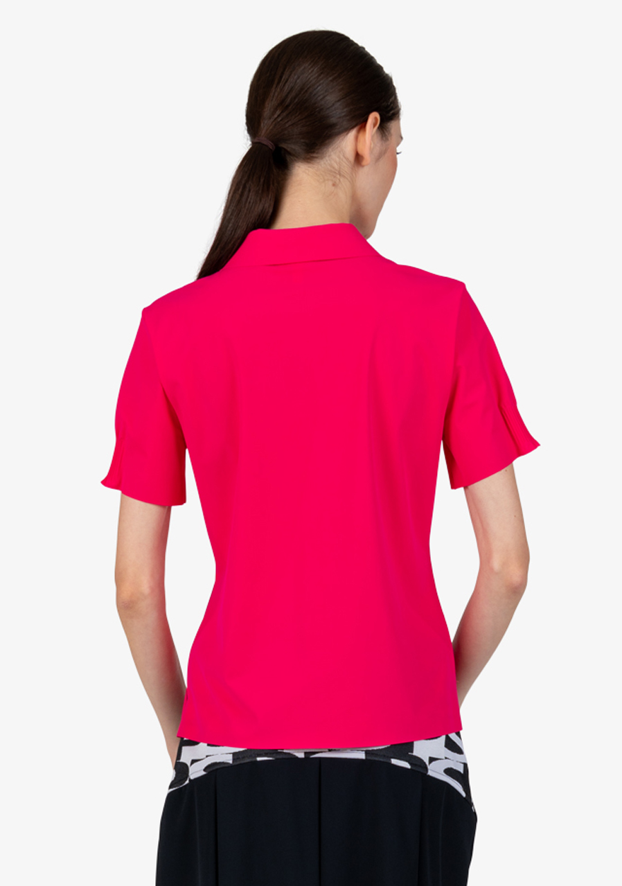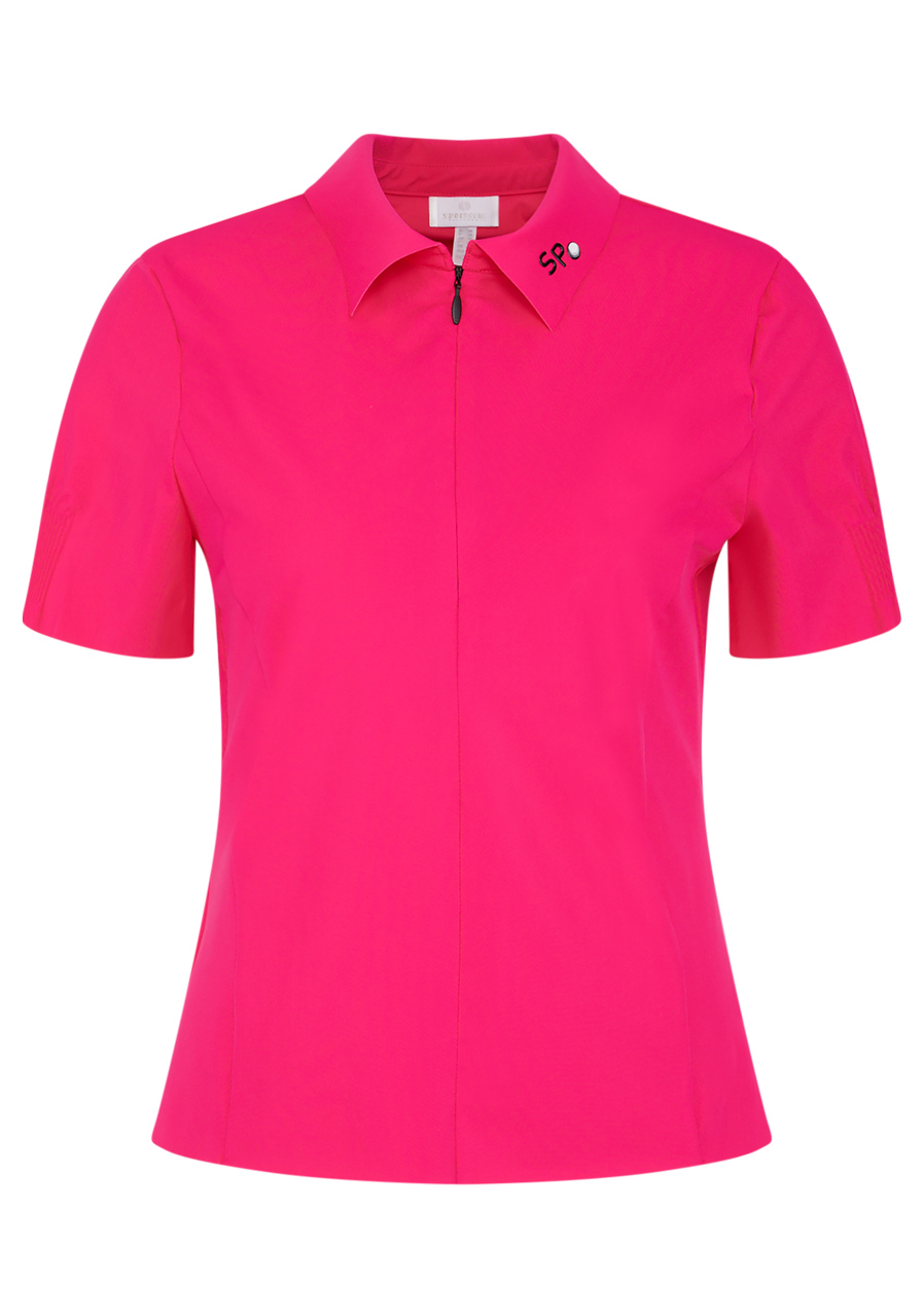 Další parametry: Mírně přiléhavý střih, sportovně módní styl, košilový límeček, otevřený okraj, krátké rukávy s žebrovaným lemem a gumou uvnitř, technický žerzej. Otevřený lem, krátké boční rozparky, malý skrytý zip uprostřed přední části, malý transferový potisk na límečku.