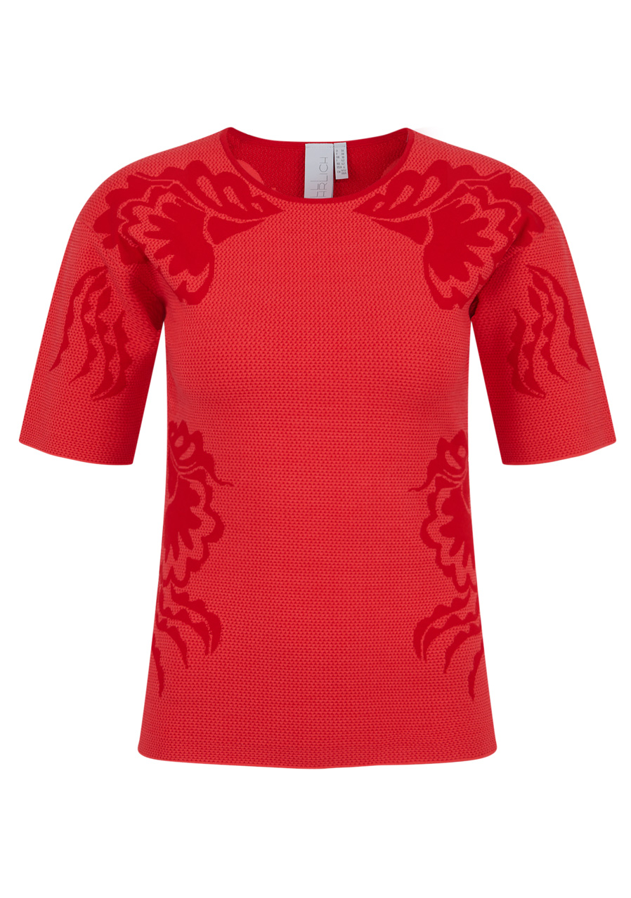 Dámské tričko Sportalm 450132 Strawberry Red je výrazným kouskem, který okouzlí svým dvoubarevným abstraktním žakárovým vzorem. Díky propracovanému úpletu a elegantnímu designu je ideální volbou pro ženy, které si zakládají na svém stylu a hledají něco výjimečného.