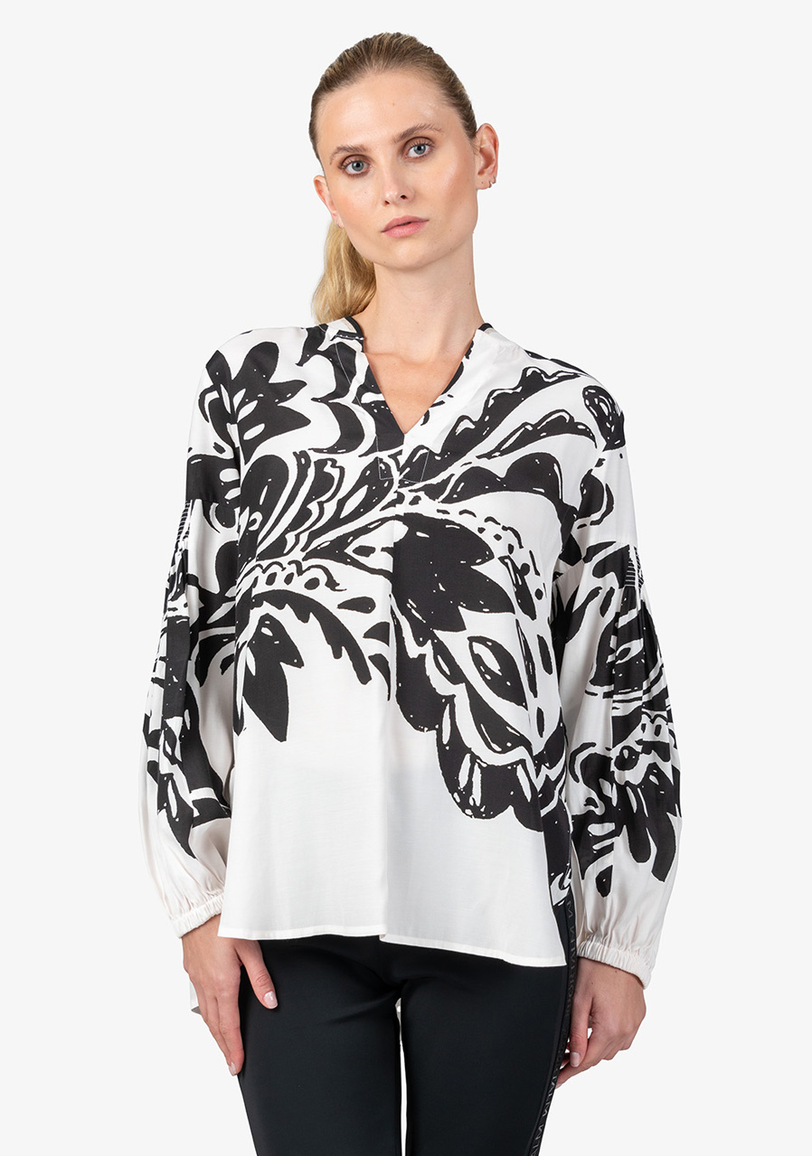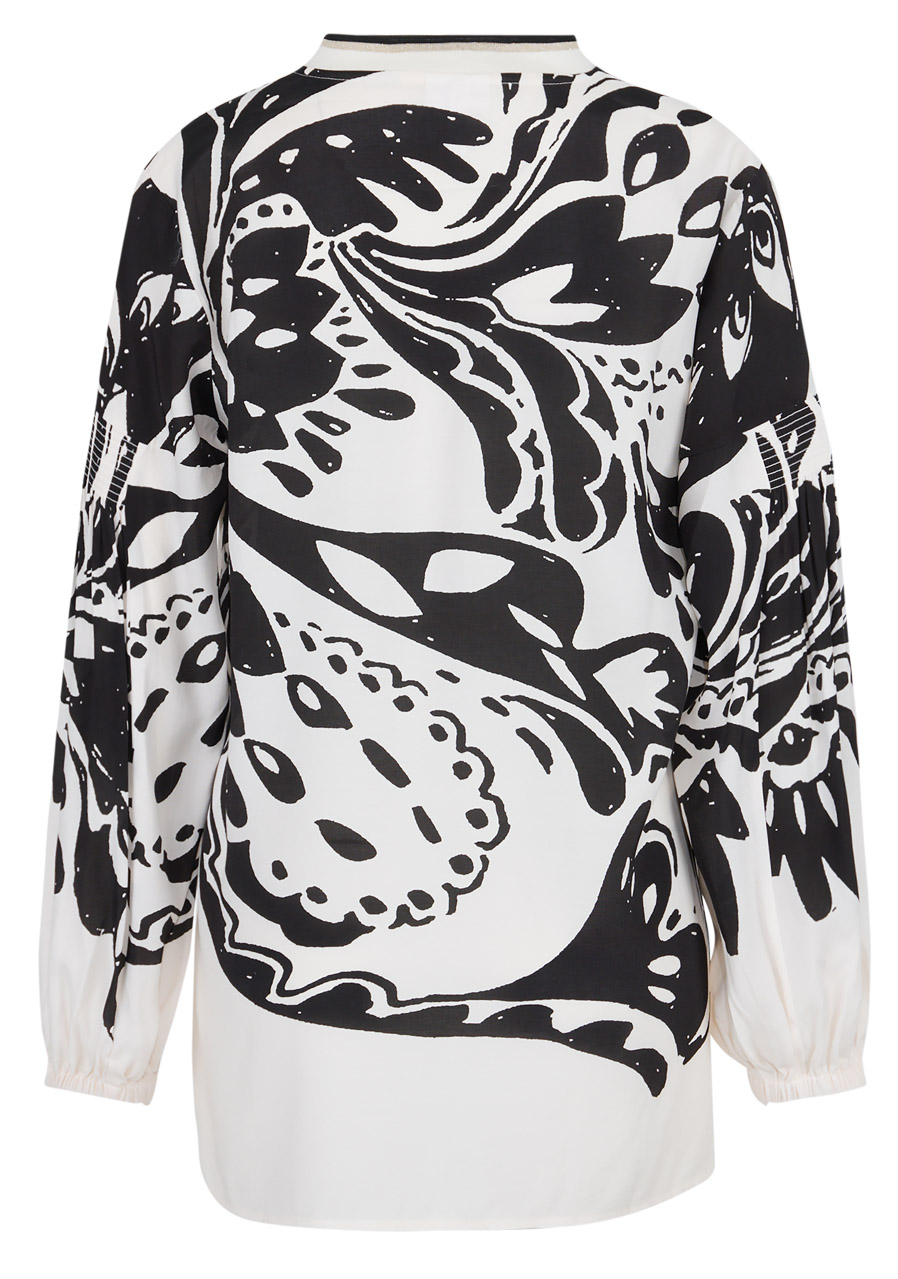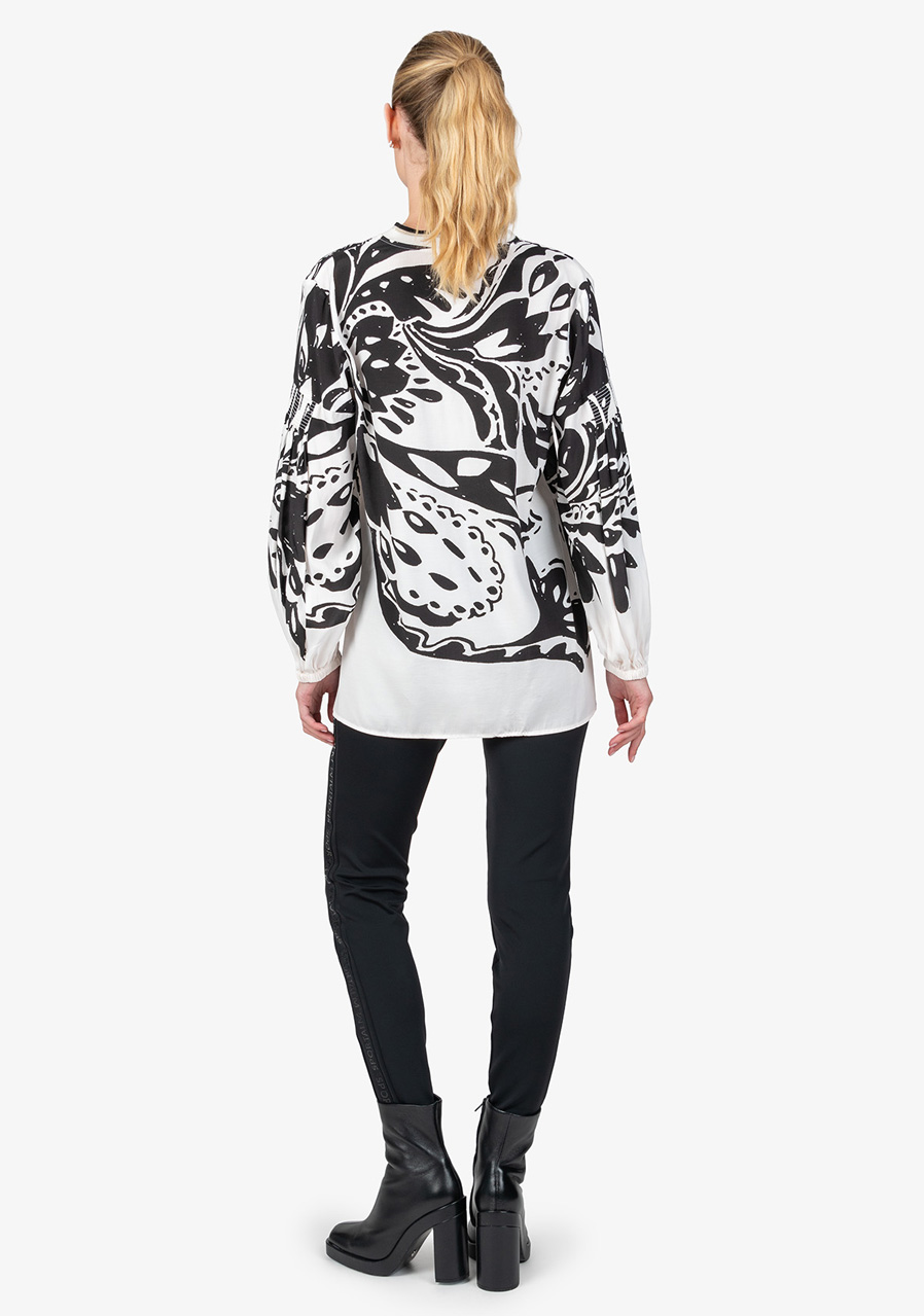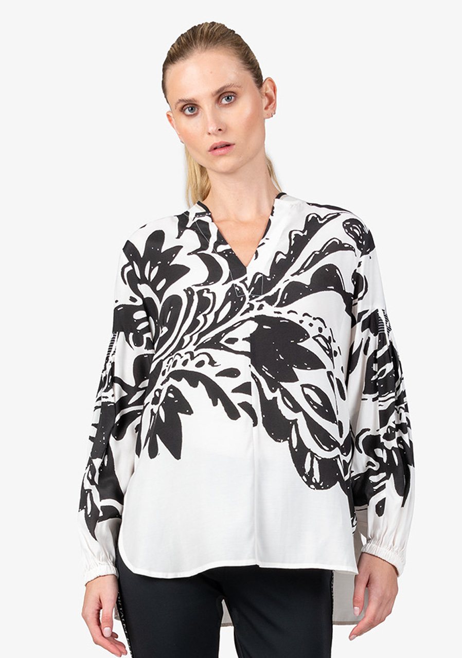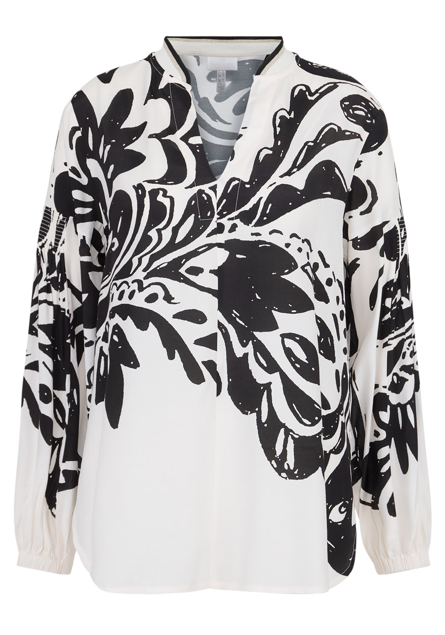 Dámská halenka Sportalm 500094 Overcast je ideálním kouskem pro ženy, které hledají eleganci a osobitý styl. S velkým paisley potiskem a volným střihem působí moderně a ležérně, přičemž propracované detaily, jako jsou objemné rukávy se záhyby a neviditelným elastickým lemem, dodávají halence originální vzhled.