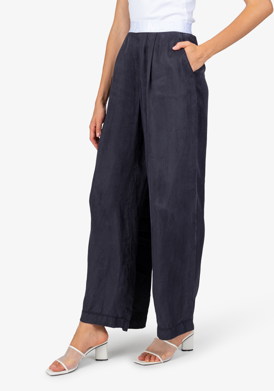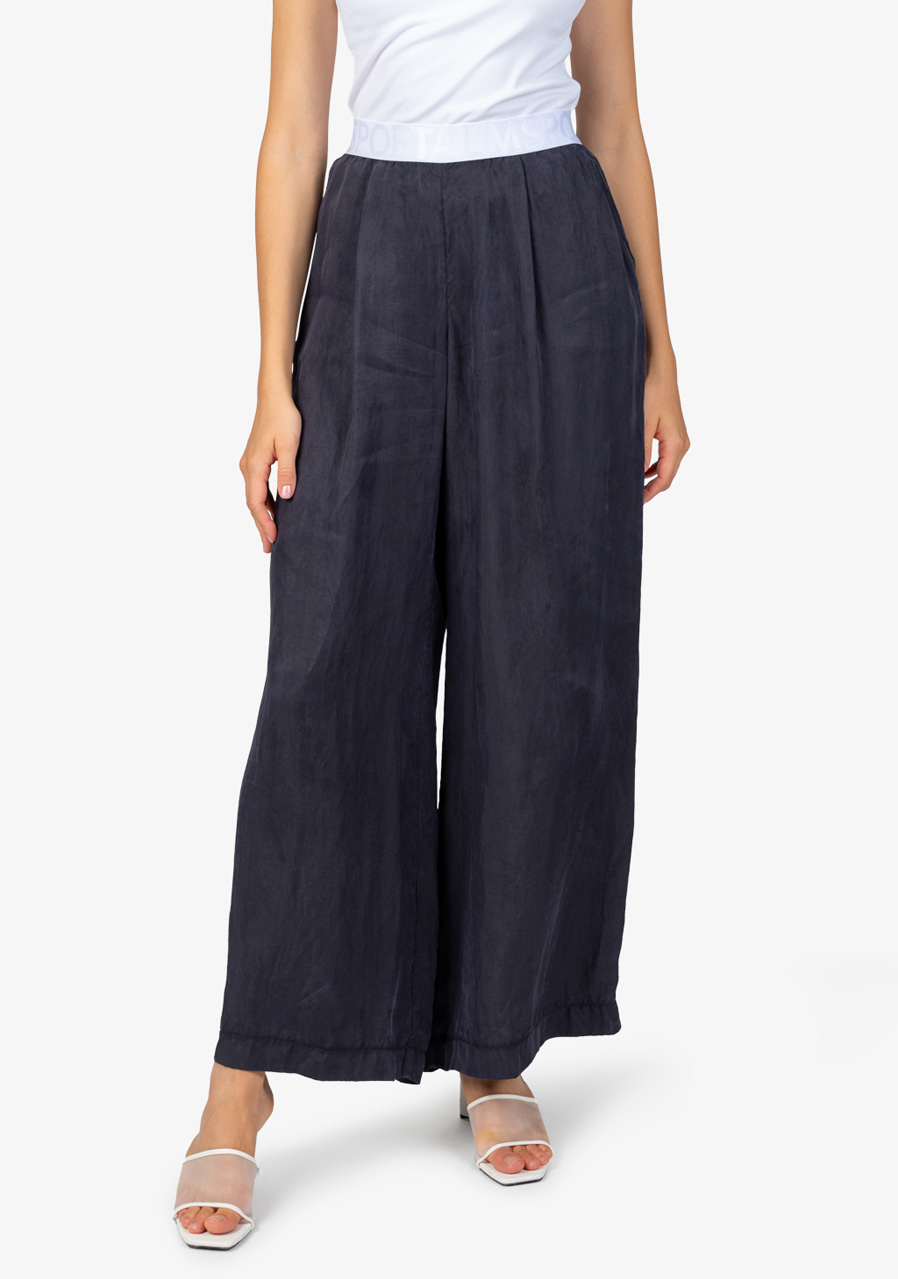 Materiál: 100% viskóza Vnitřní šev pro velikost 36: 80,0 cm Další parametry: Volný střih, módní styl, elastický pas s vyraženým logem Sportalm, široký tvar nohavic, boční kapsy, lehký Tencel materiál. Sklady vpředu zajišťují pohodlné nošení.
