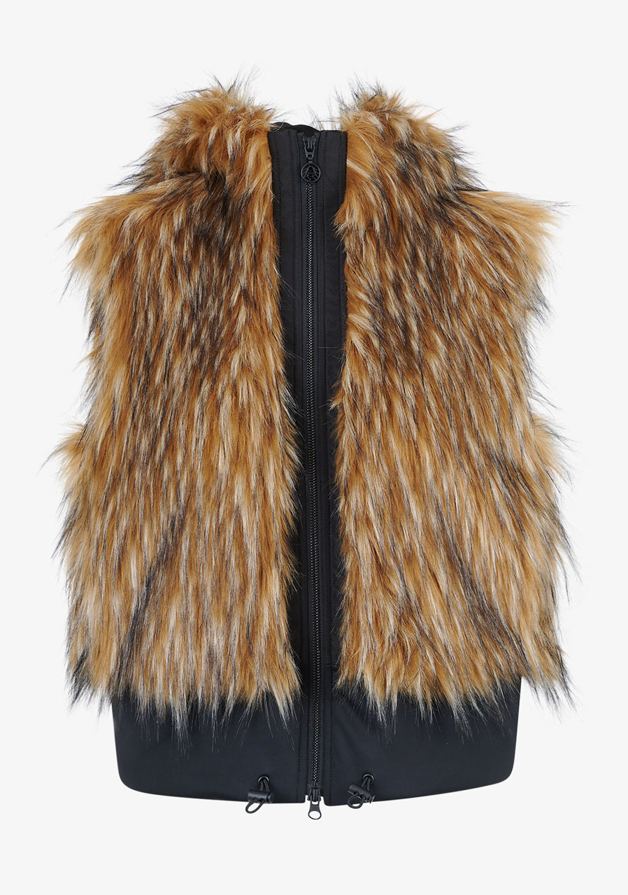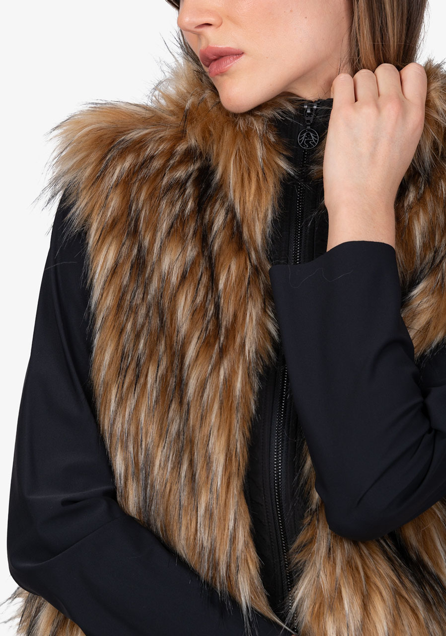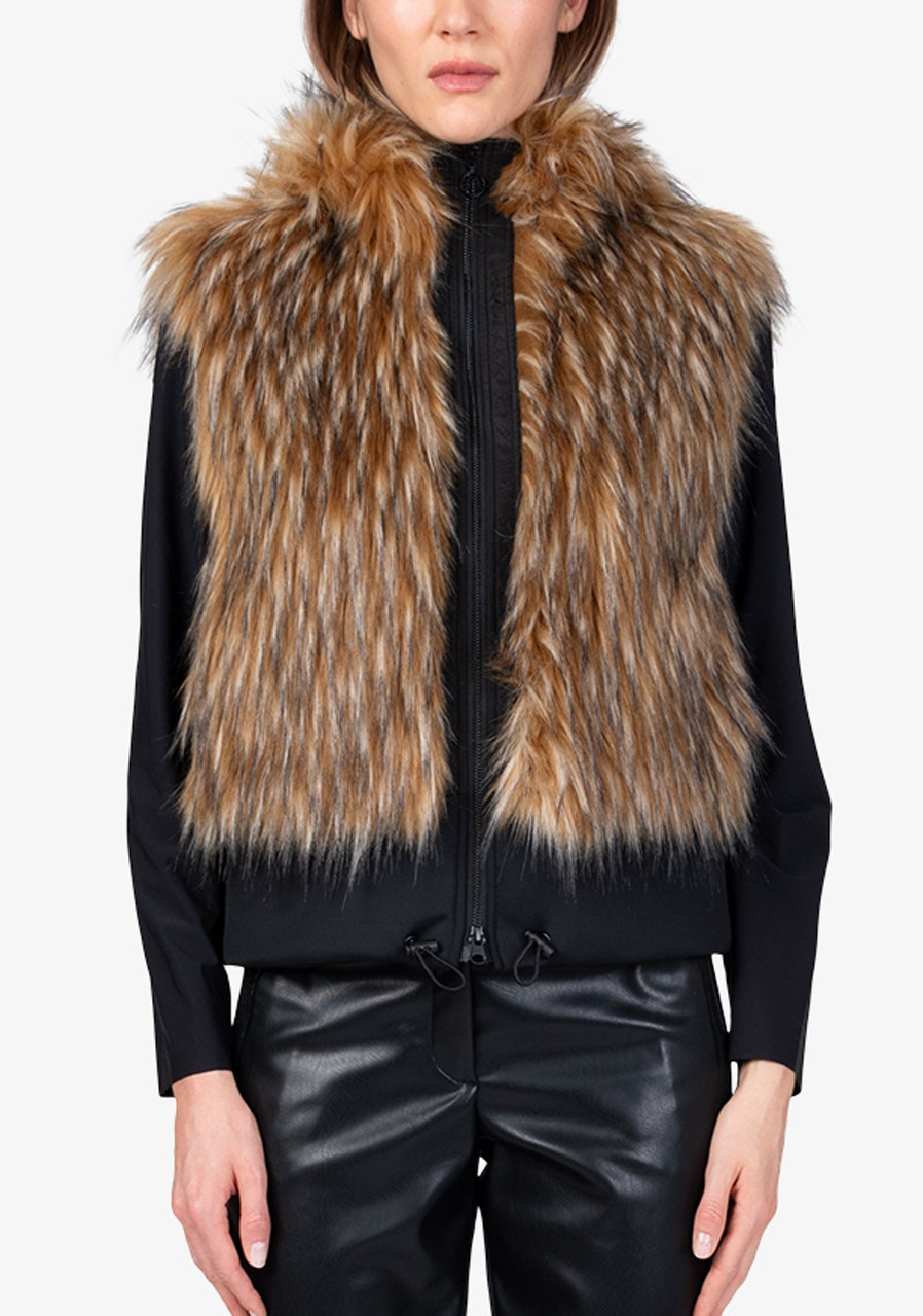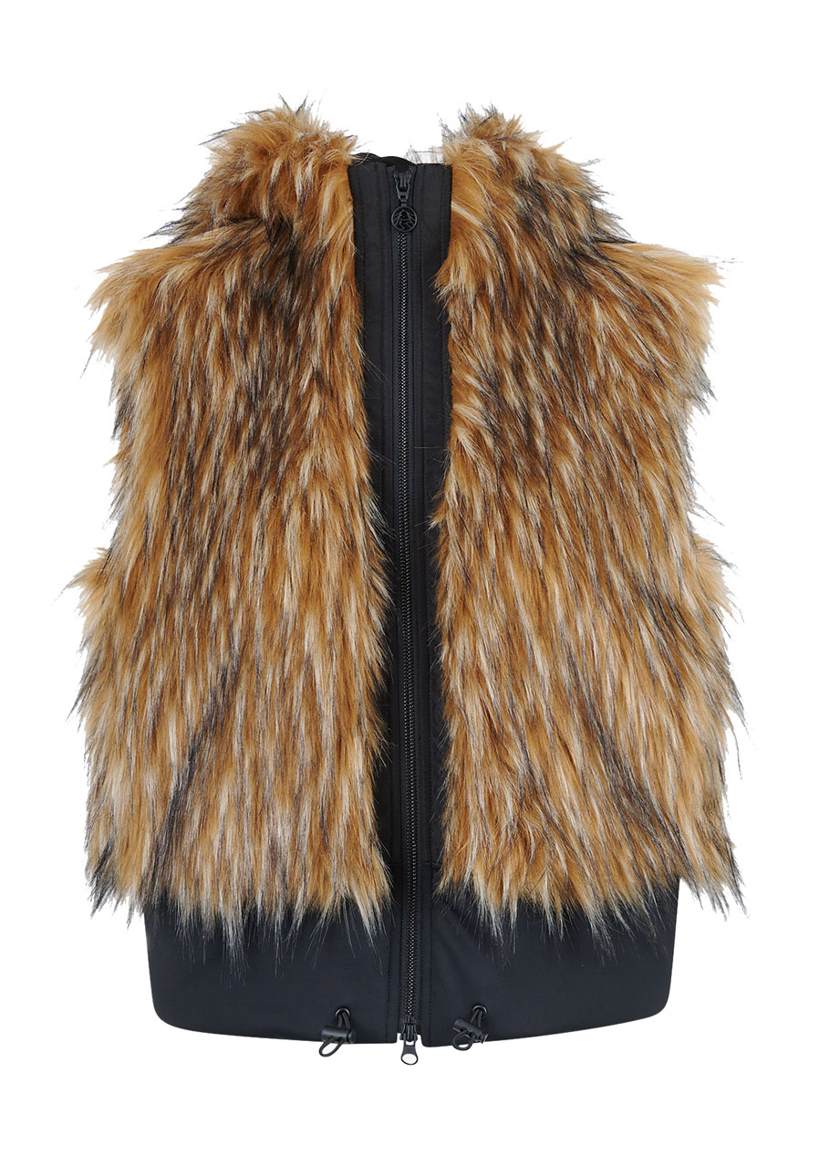 Dámská vesta Sportalm Faux Fur Vest s kapucí představuje luxusní doplněk, který spojuje eleganci, hřejivost a moderní design. Vyrobena z hebké umělé kožešiny ve vzhledu Finnraccoon v kombinaci s pružným scuba materiálem působí exkluzivně a přitom zůstává pohodlná na nošení. Kapuce dodává vestě ležérně stylový charakter, zatímco obousměrný zip a postranní kapsy zvyšují praktičnost. Široký scuba lem se stahovací šňůrkou umožňuje upravit šířku spodního okraje podle potřeby. Díky plné podšívce a preciznímu zpracování je tato vesta ideálním kouskem pro vrstvení a elegantní zimní outfity.