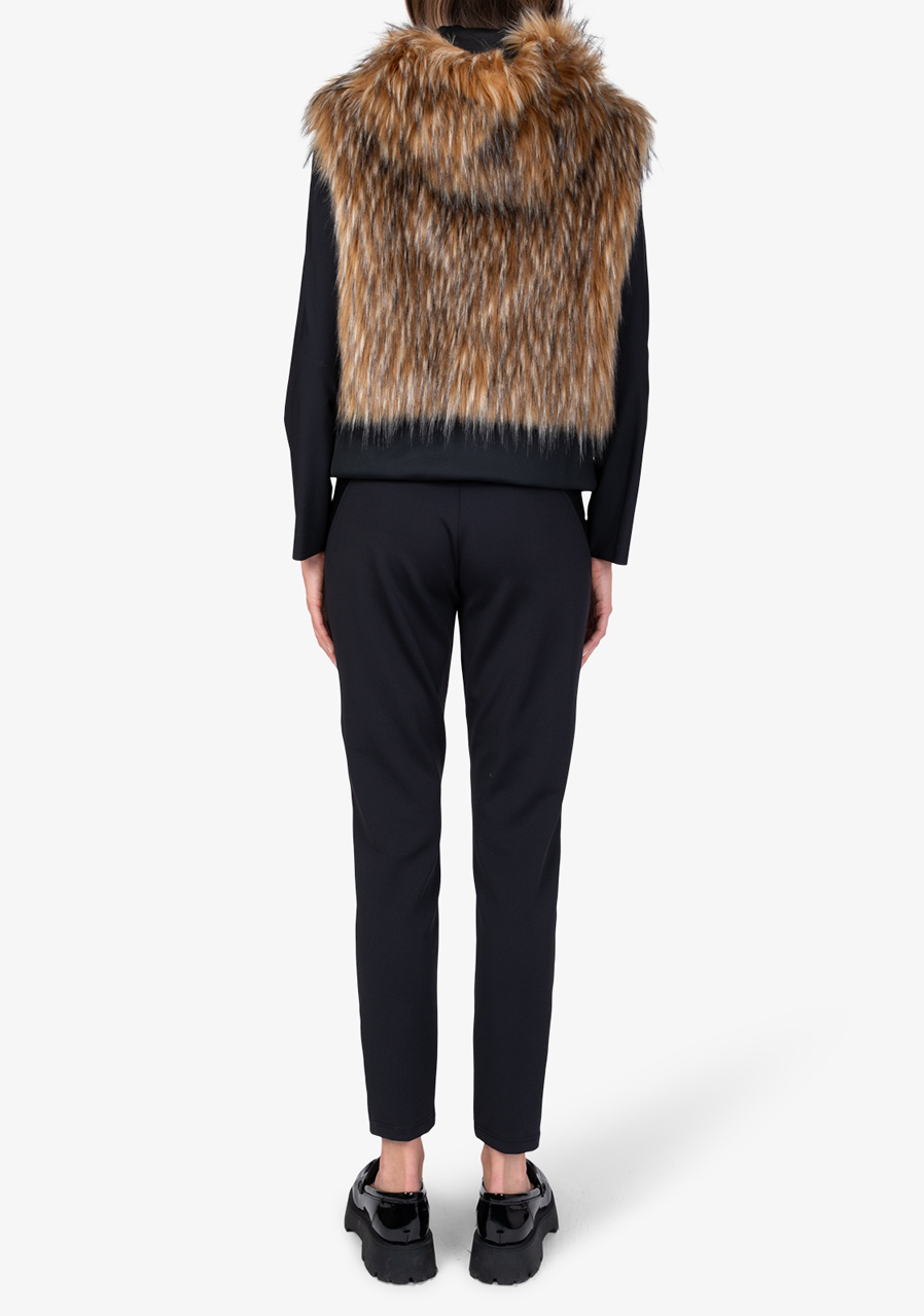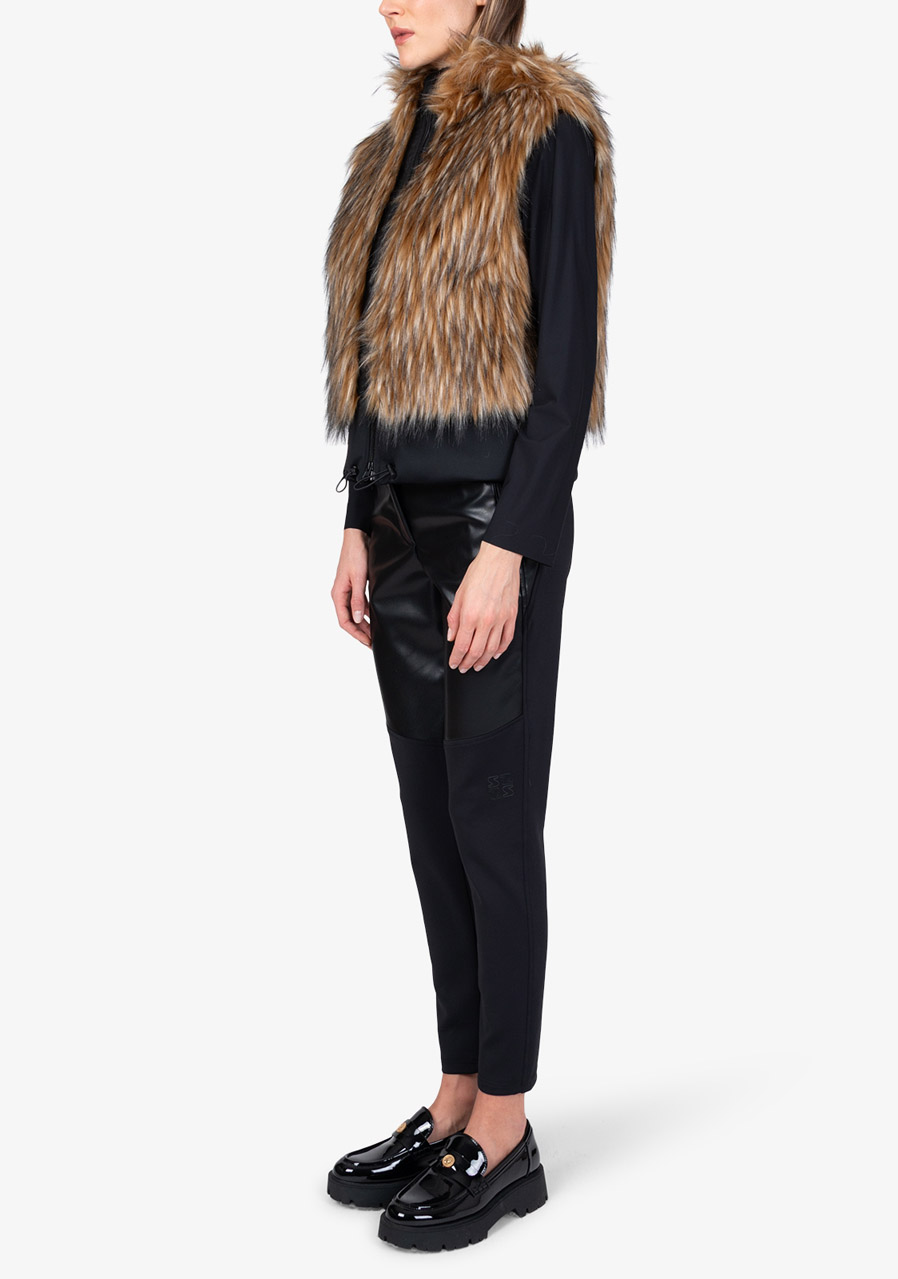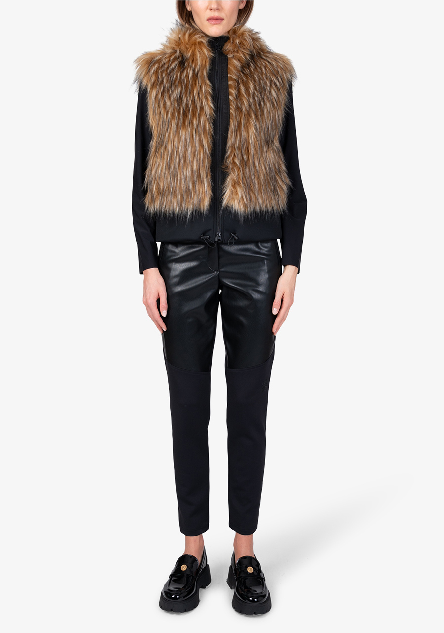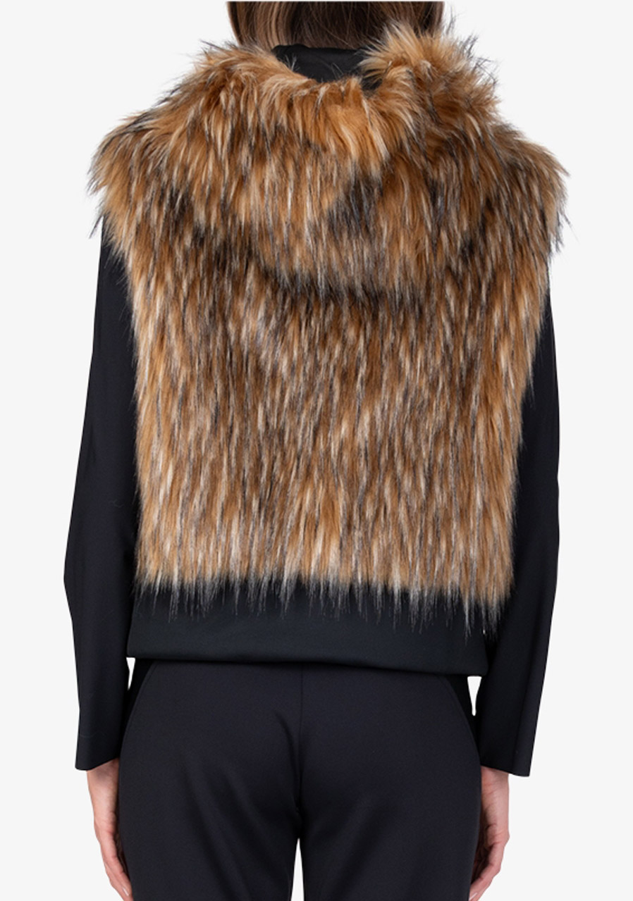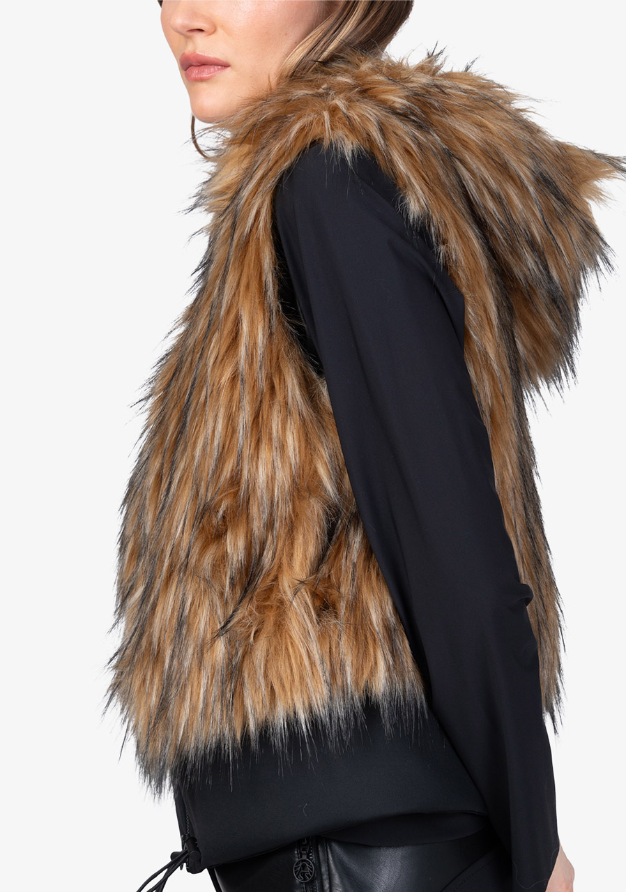Dámská vesta Sportalm Faux Fur Vest s kapucí představuje luxusní doplněk, který spojuje eleganci, hřejivost a moderní design. Vyrobena z hebké umělé kožešiny ve vzhledu Finnraccoon v kombinaci s pružným scuba materiálem působí exkluzivně a přitom zůstává pohodlná na nošení. Kapuce dodává vestě ležérně stylový charakter, zatímco obousměrný zip a postranní kapsy zvyšují praktičnost. Široký scuba lem se stahovací šňůrkou umožňuje upravit šířku spodního okraje podle potřeby. Díky plné podšívce a preciznímu zpracování je tato vesta ideálním kouskem pro vrstvení a elegantní zimní outfity.