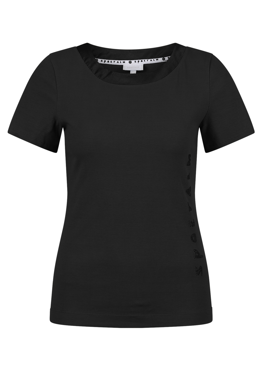 Elegantní a zároveň sportovní dámské tričko s krátkým rukávem, které zaujme kombinací žebrovaného materiálu a saténových detailů. Výrazným prvkem je třpytivý nápis Sportalm ze štrasových kamínků, který dodává celému modelu luxusní vzhled.