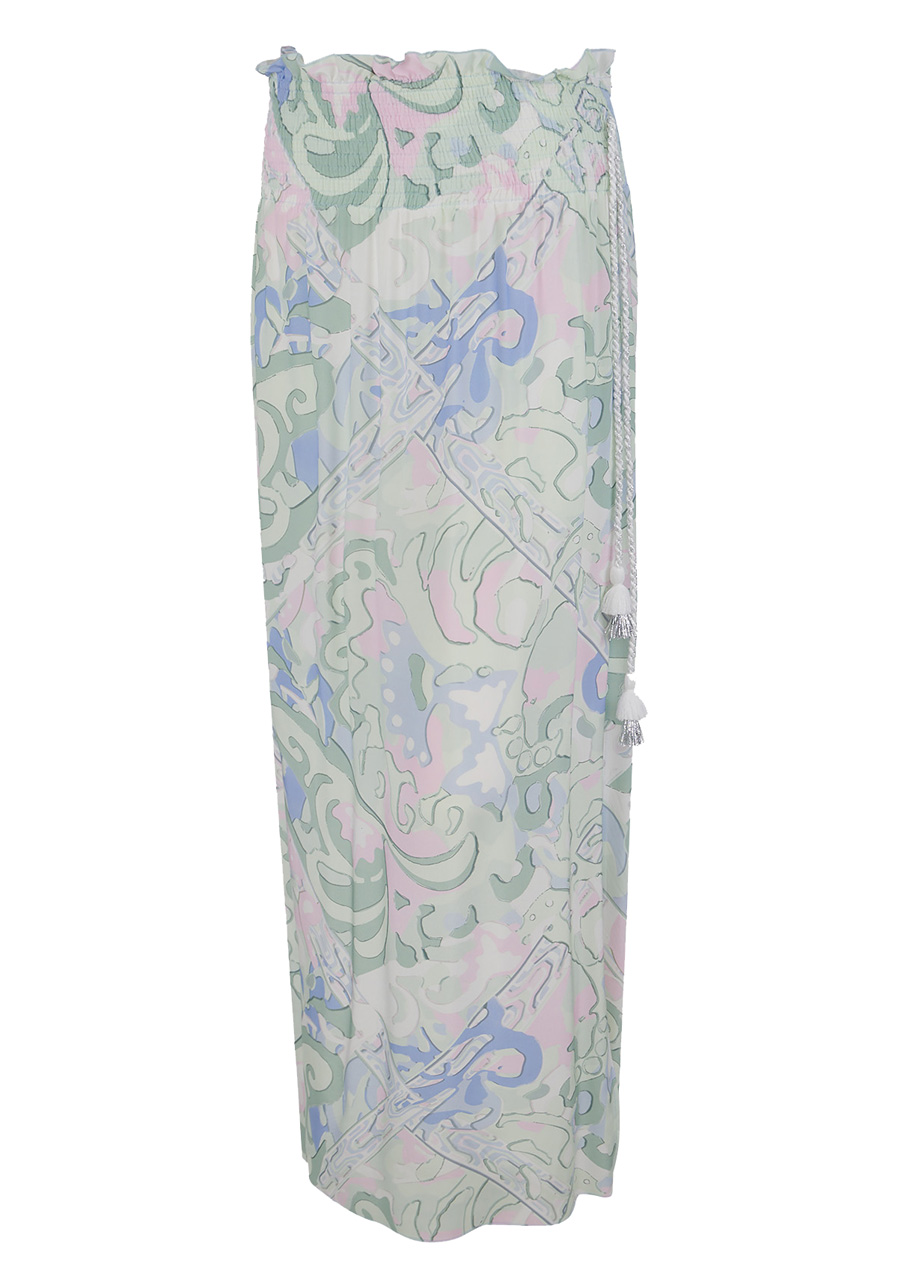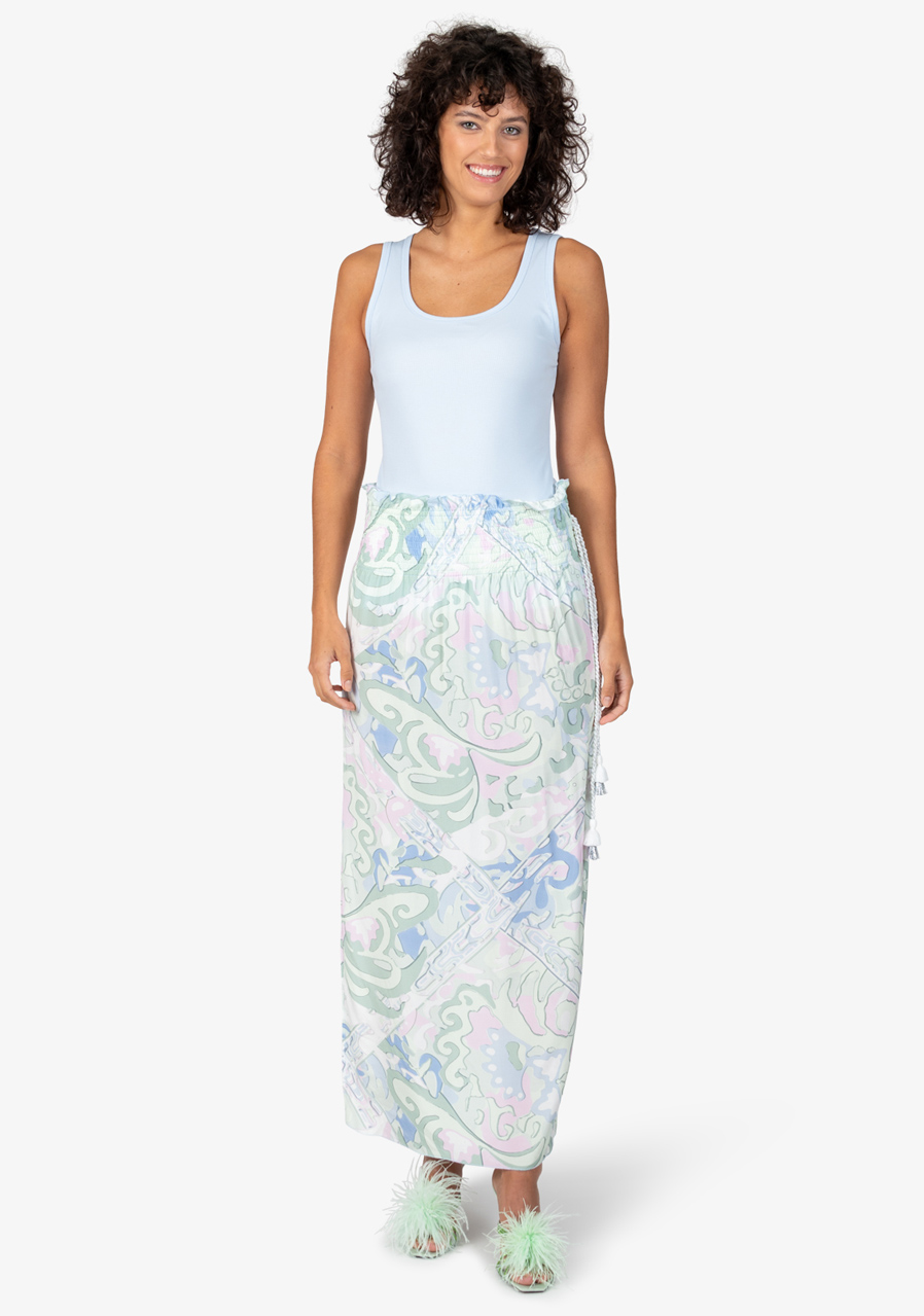 Tato dlouhá letní letní sukně s decentním celoplošným potiskem a ženskými bočními rozparky je ideální pro teplé dny. Nabízí styl a pohodlí, vhodná pro ležérní i módní outfity.