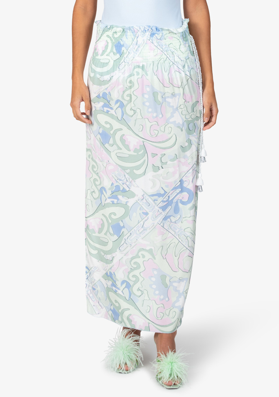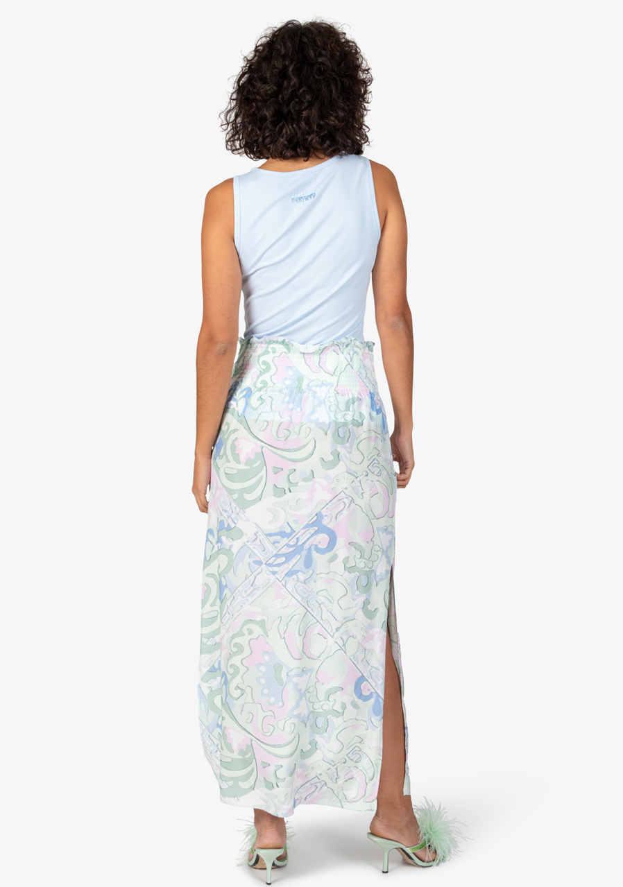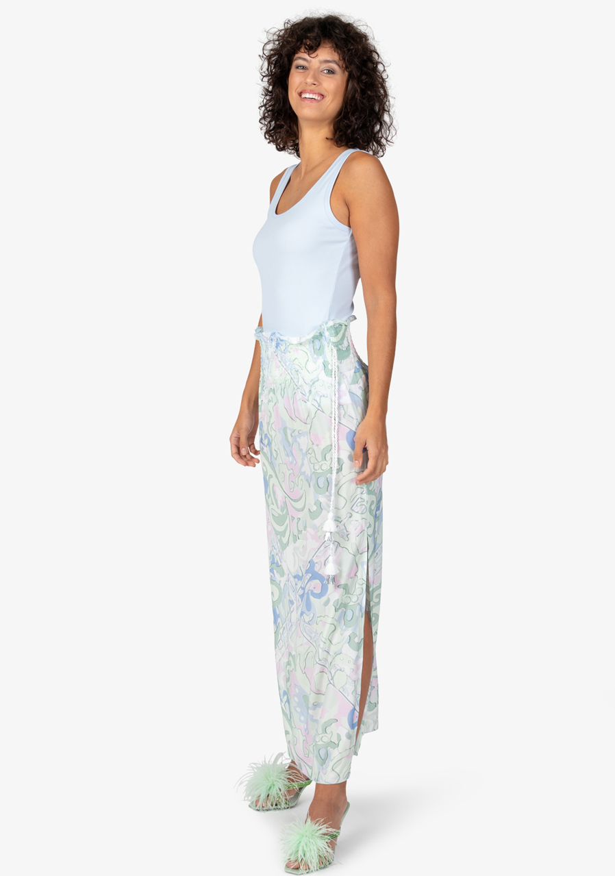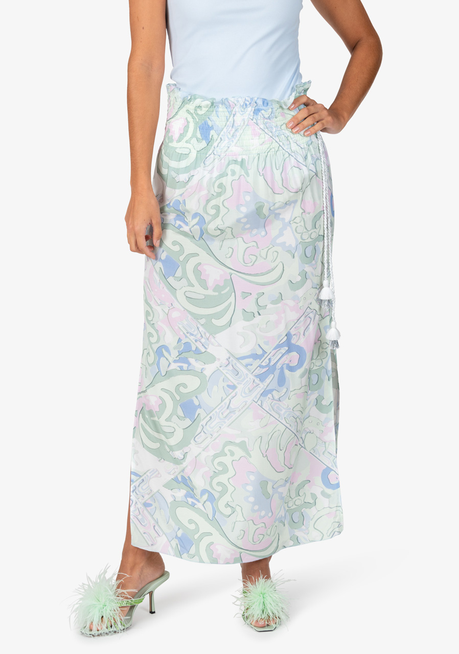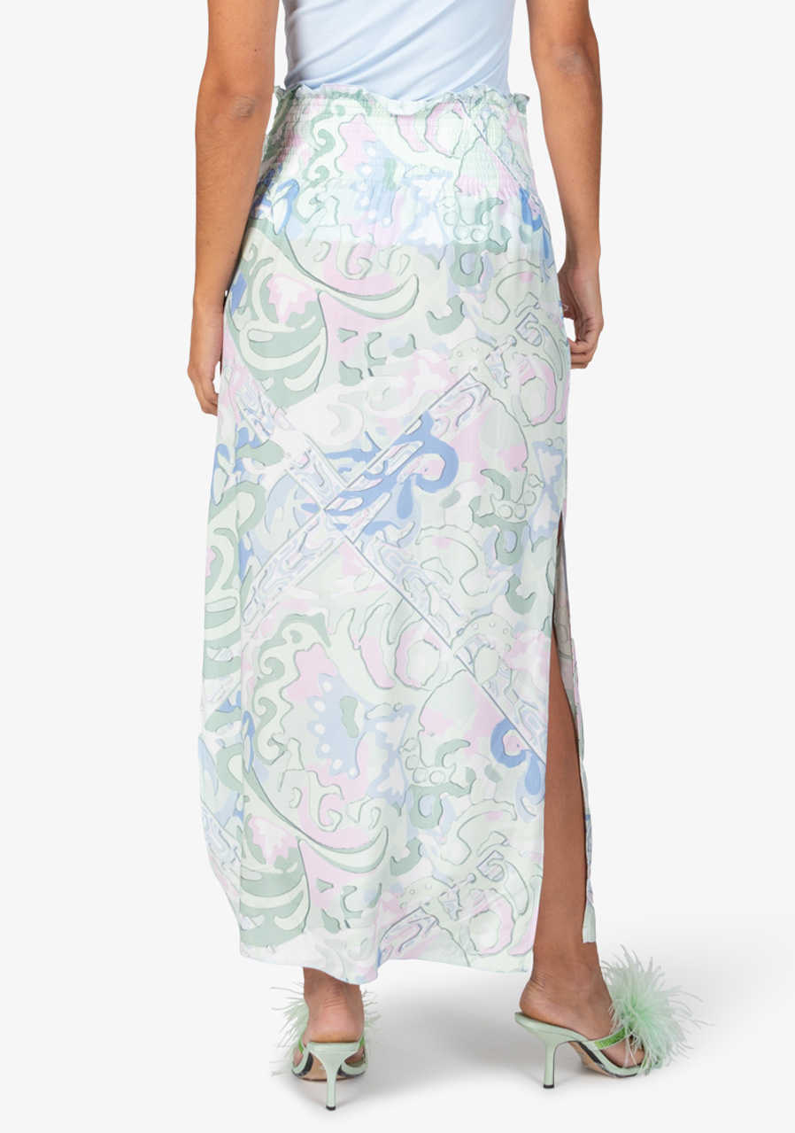 Přiléhavý střih, elegantní styl, chladivý letní satén měkká guma v pase, rozšířený střih sukně, abstraktní celoplošný potisk, ležérní stahovací šňůrka na boku pasu, vysoké boční rozparky, pas a lem s úpravou babylock. Lehká a elegantní sukně, která dodá vašemu letnímu outfitu vzdušnost a ženský půvab.