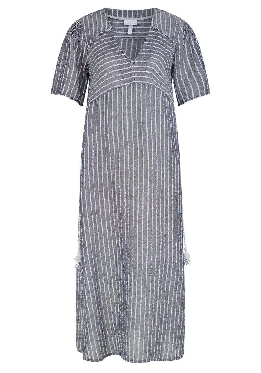 Lehké dámské šaty z kvalitního lnu zaujmou nejen přírodními materiály, ale i propracovanými detaily na rukávech. Volnější střih, jemné lurexové proužky a ručně zpracované zdobení na ramenou dodávají modelu jedinečný vzhled. Praktické kapsy, rozparky po stranách a ozdobný pásek s třásněmi v pase podtrhují pohodlný a stylový charakter těchto šatů.
