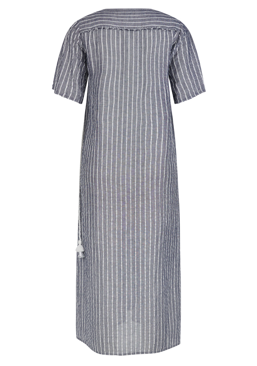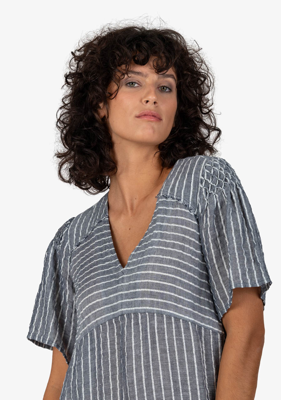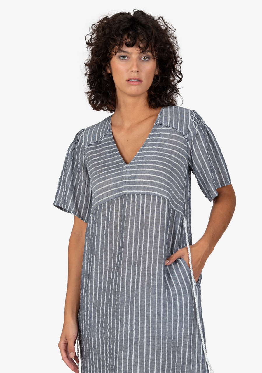 Volný ženský střih s výstřihem do V s krátkými rukávy a ruční výšivkou na rameni. Oblékání přes hlavu, pásek s třásněmi, boční všité kapsy, boční rozparky, zakončení otevřeným lemem.