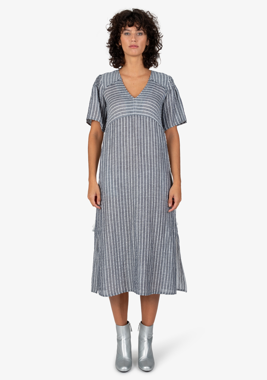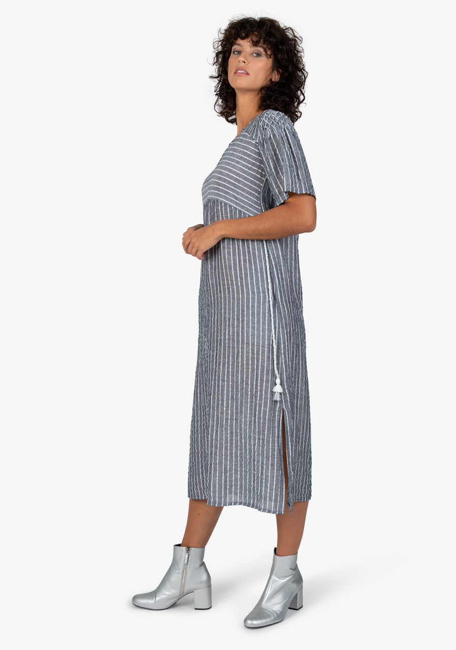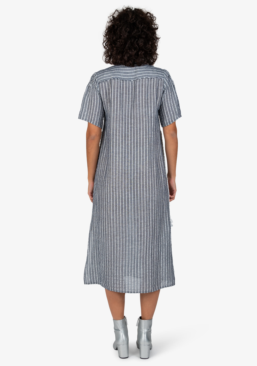 Volný ženský střih s výstřihem do V s krátkými rukávy a ruční výšivkou na rameni. Oblékání přes hlavu, pásek s třásněmi, boční všité kapsy, boční rozparky, zakončení otevřeným lemem.