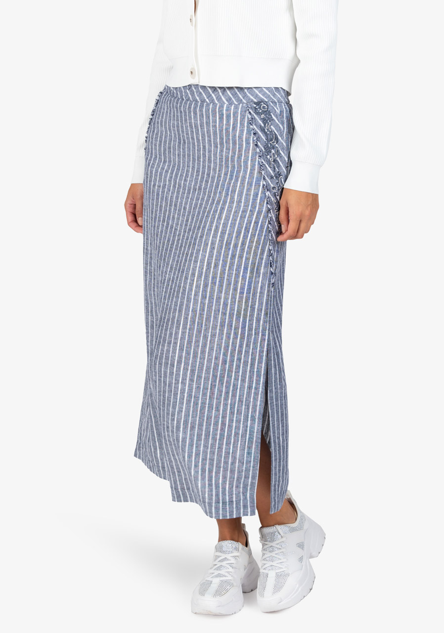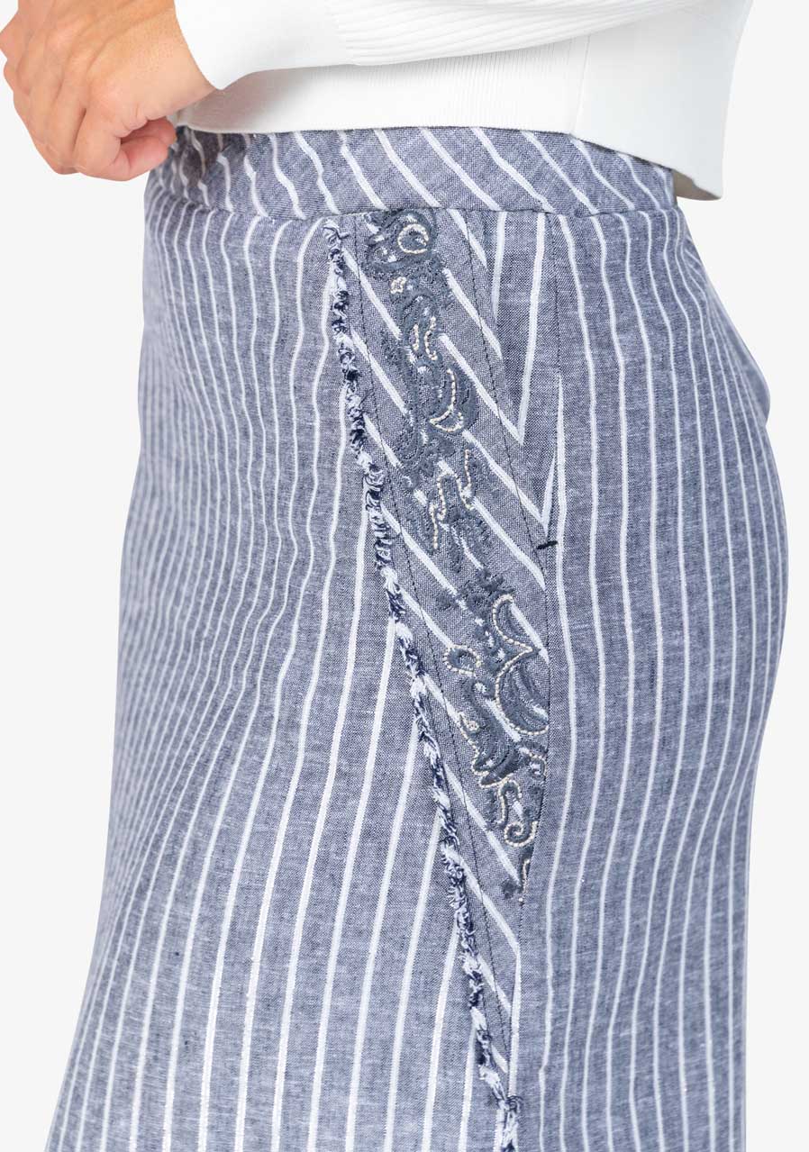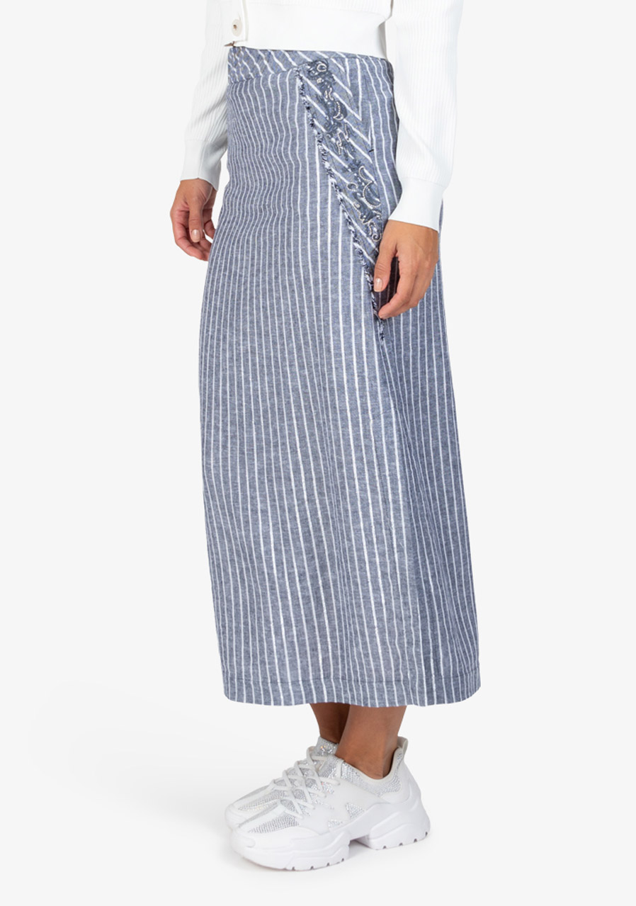 Dlouhá letní sukně s vyšívanými detaily a bočními rozparky. Lehký lněný materiál a propracované akcenty pro stylový letní vzhled.