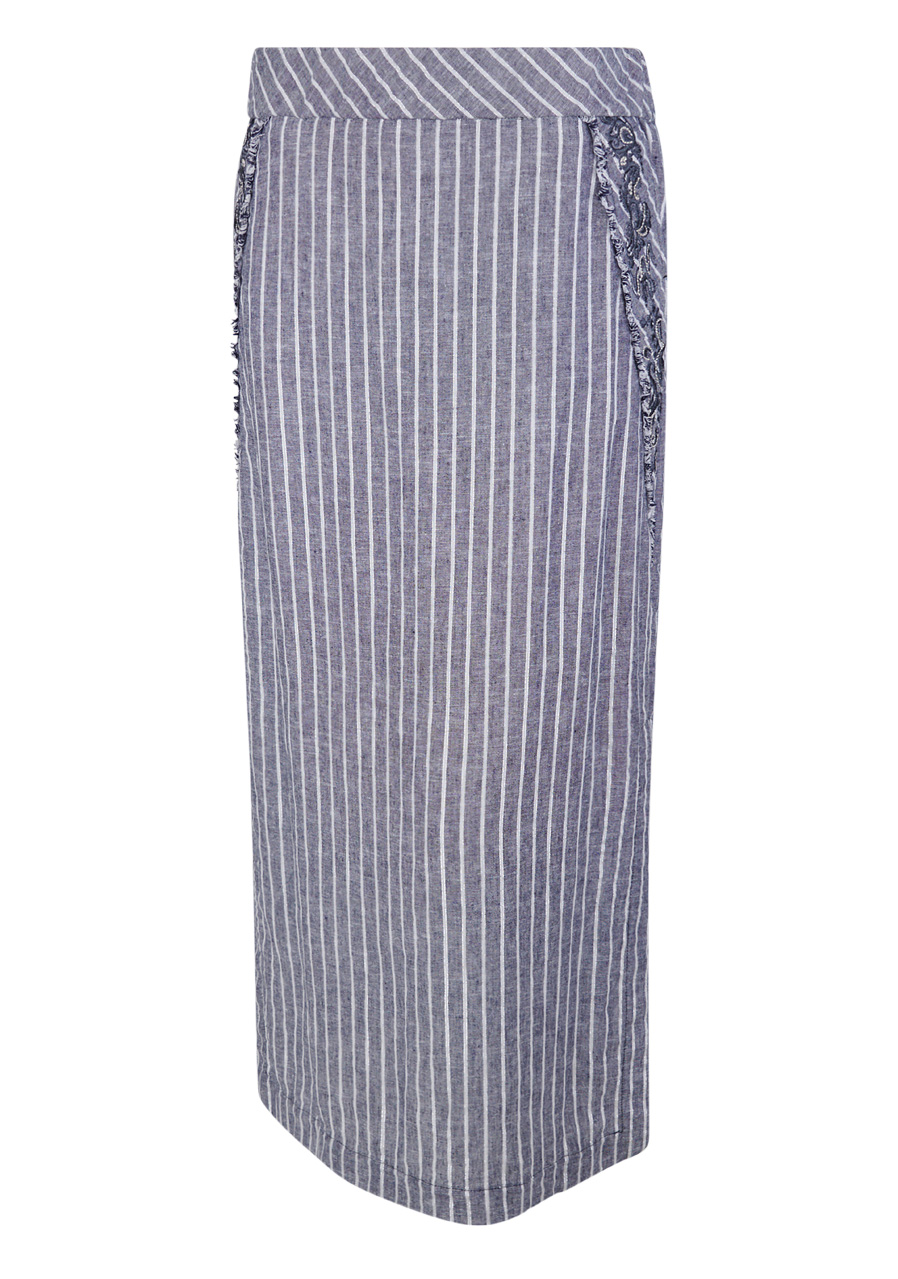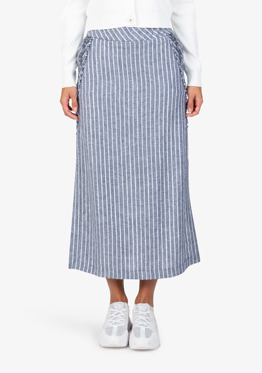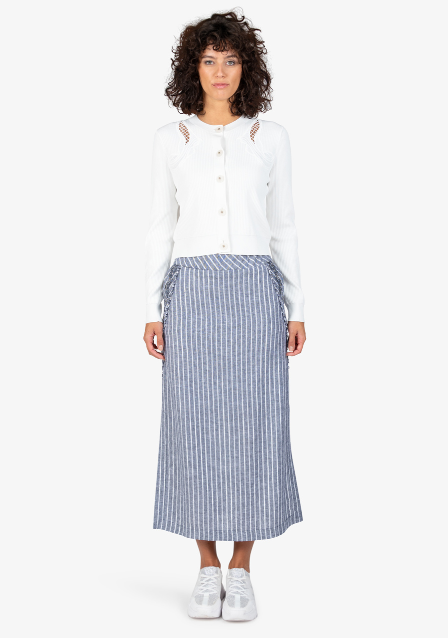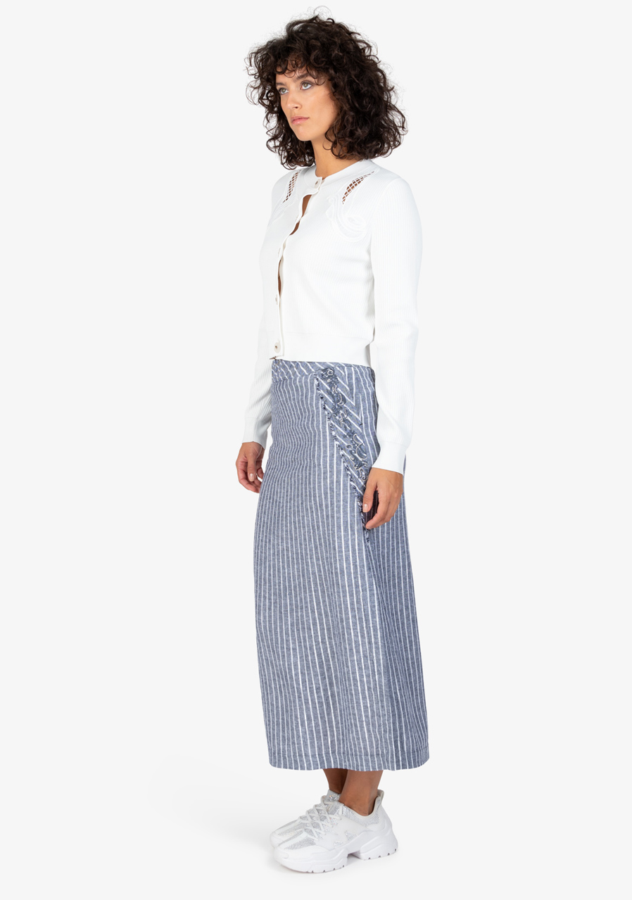 Dlouhá letní sukně s vyšívanými detaily a bočními rozparky. Lehký lněný materiál a propracované akcenty pro stylový letní vzhled.