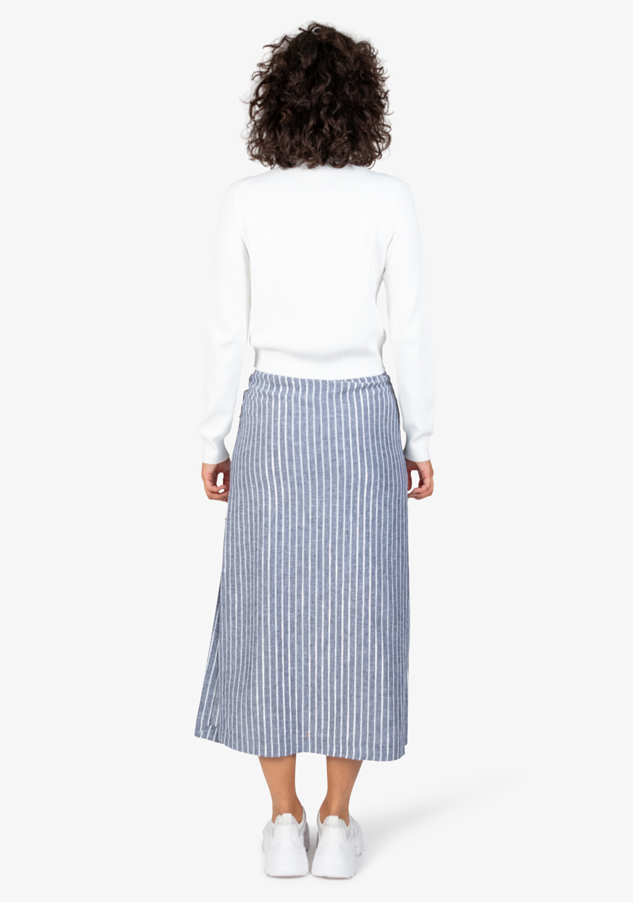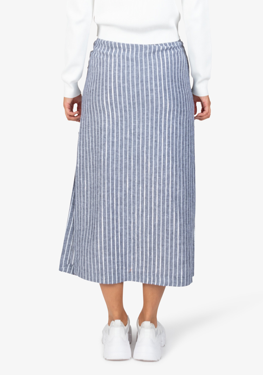 Materiál: 55% viskóza, 44% len, 1% polyester metalická Délka sukně pro velikost 36: 91,1 cm Další parametry: Vzor tkané lurexové pruhy, ležérní střih, módní elegantní styl, skrytý měkký elastický pas, rovný tvar sukně, límecové kapsy s propracovanou výšivkou, sukně s podšívkou. Zvýrazněné vysoké boční rozparky moderní vzhled díky speciálnímu praní.