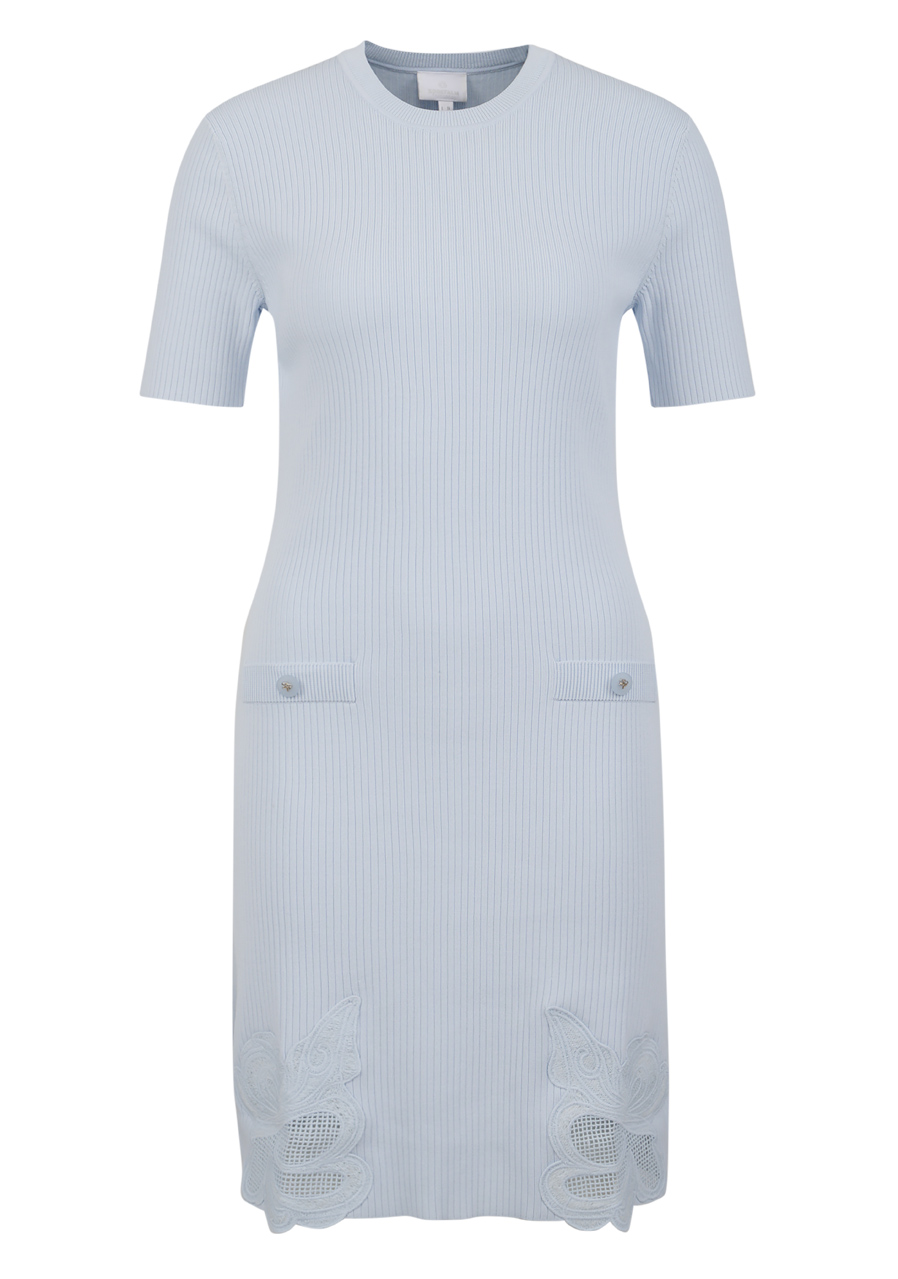 Pletené šaty s kulatým výstřihem jsou stylová volba pro každodenní eleganci s ohledem na přírodu. Tyto přiléhavé pletené šaty z recyklované viskózy a elastanu nabízejí maximální pohodlí, ženský střih a moderní vzhled. Kulatý výstřih a krátké rukávy podtrhují jednoduchost designu, zatímco abstraktní paisley výšivka vpředu dodává jemný akcent. Falešná lemovací kapsa s dekorativním knoflíkem pak vytváří zajímavý detail.
