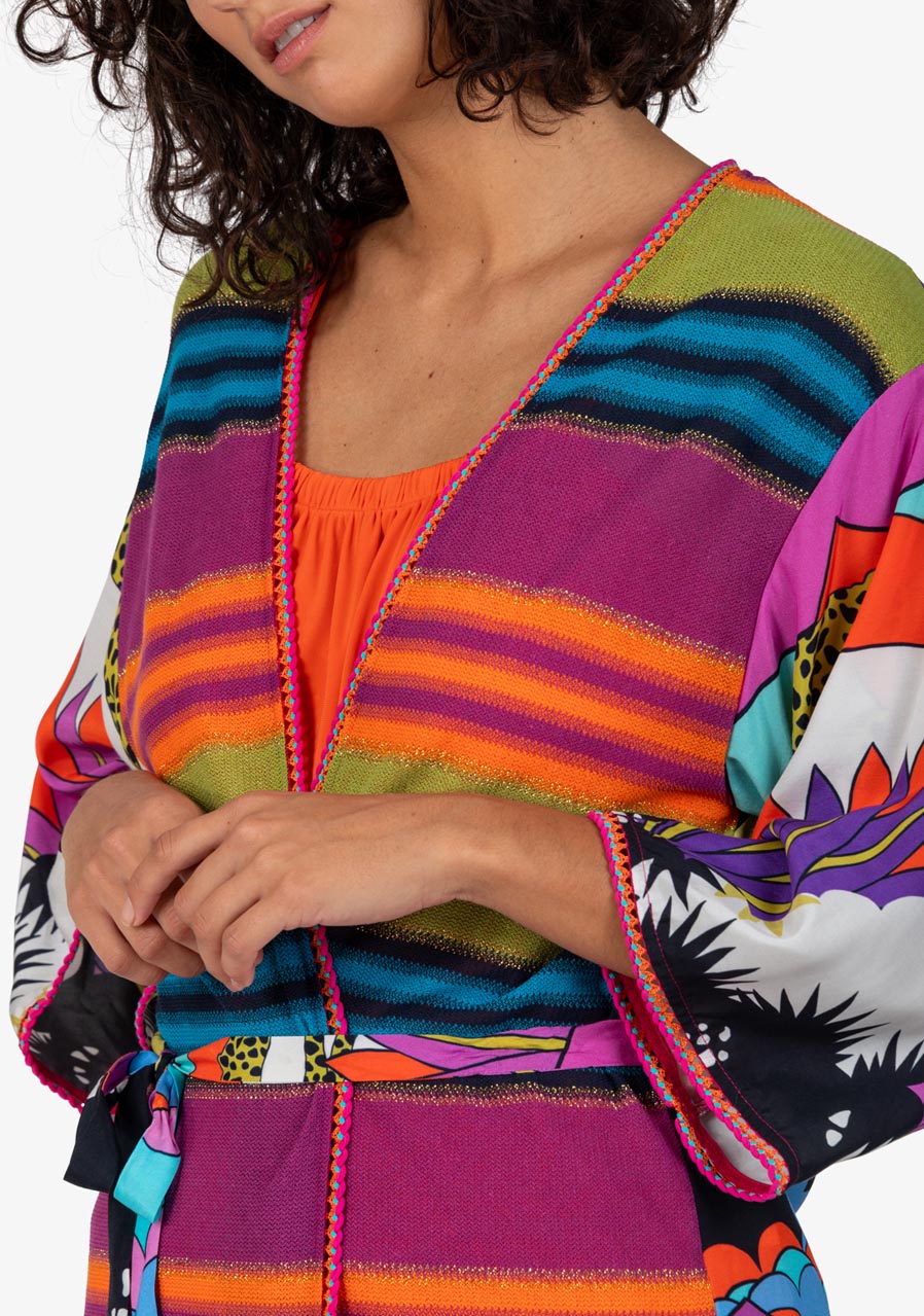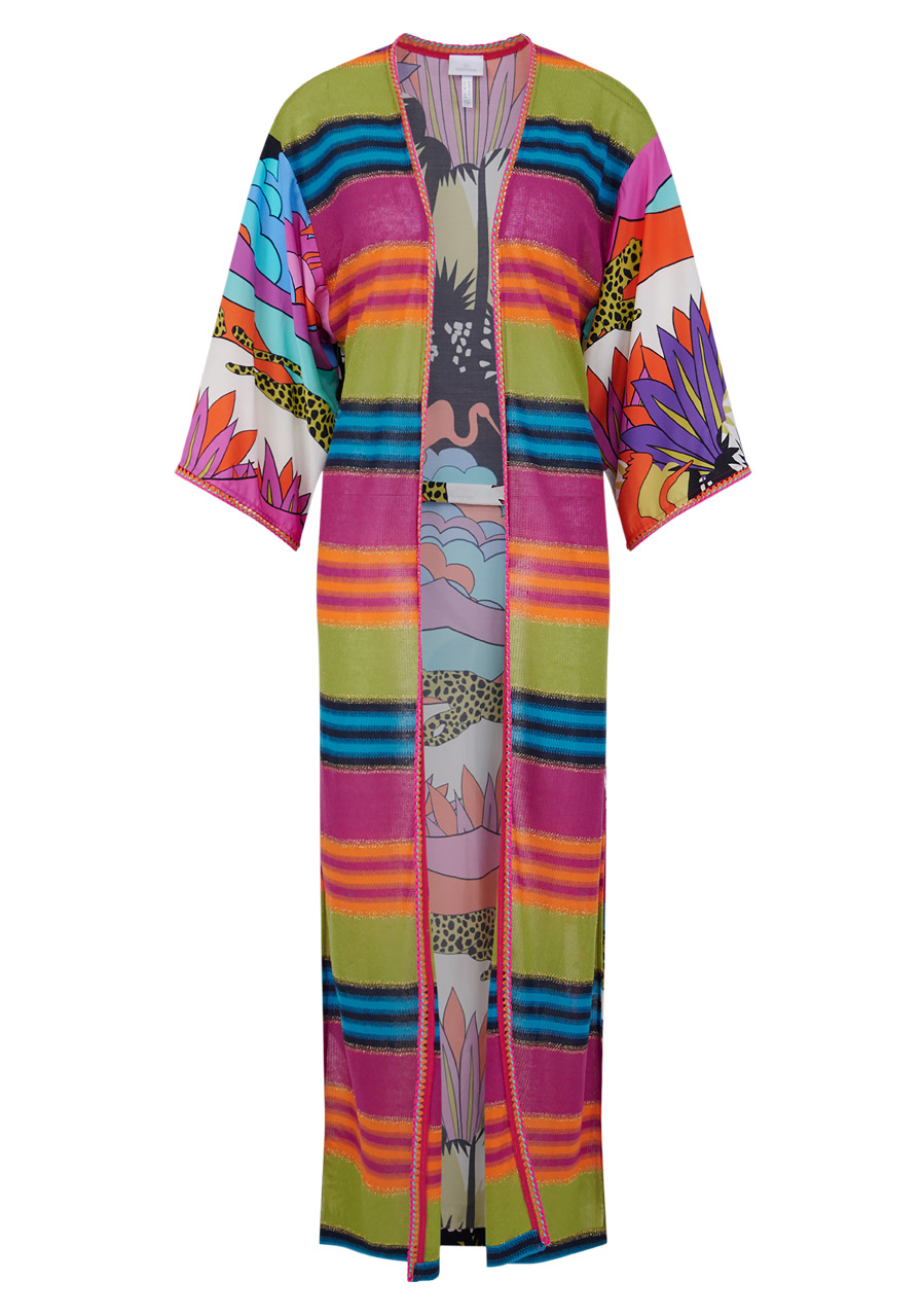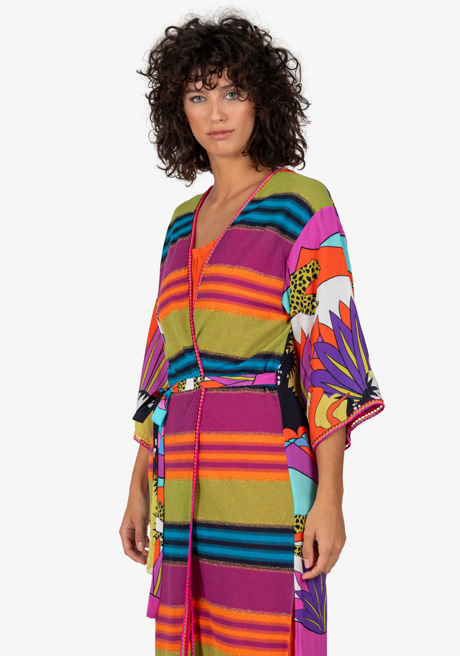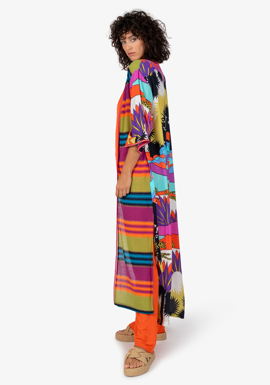 Tyto vzdušné šaty z potištěné viskózy a pruhovaného úpletu přináší lehkost, styl a pohodlí v jednom. Díky volnému střihu, květinovému potisku a praktickému pásku v pase působí elegantně a zároveň uvolněně. Boční rozparky dodávají na ležérnosti, zatímco pružné lemování na rukávech i výstřihu zajišťuje příjemné nošení. Perfektní volba pro letní dny, ať už na pláž nebo vycházky na dovolené.