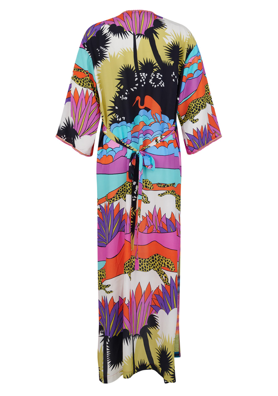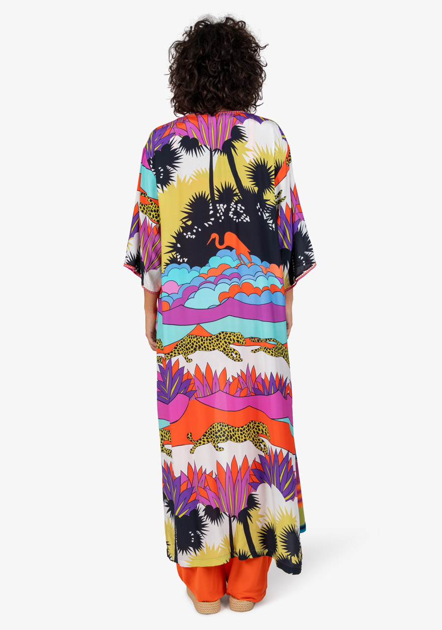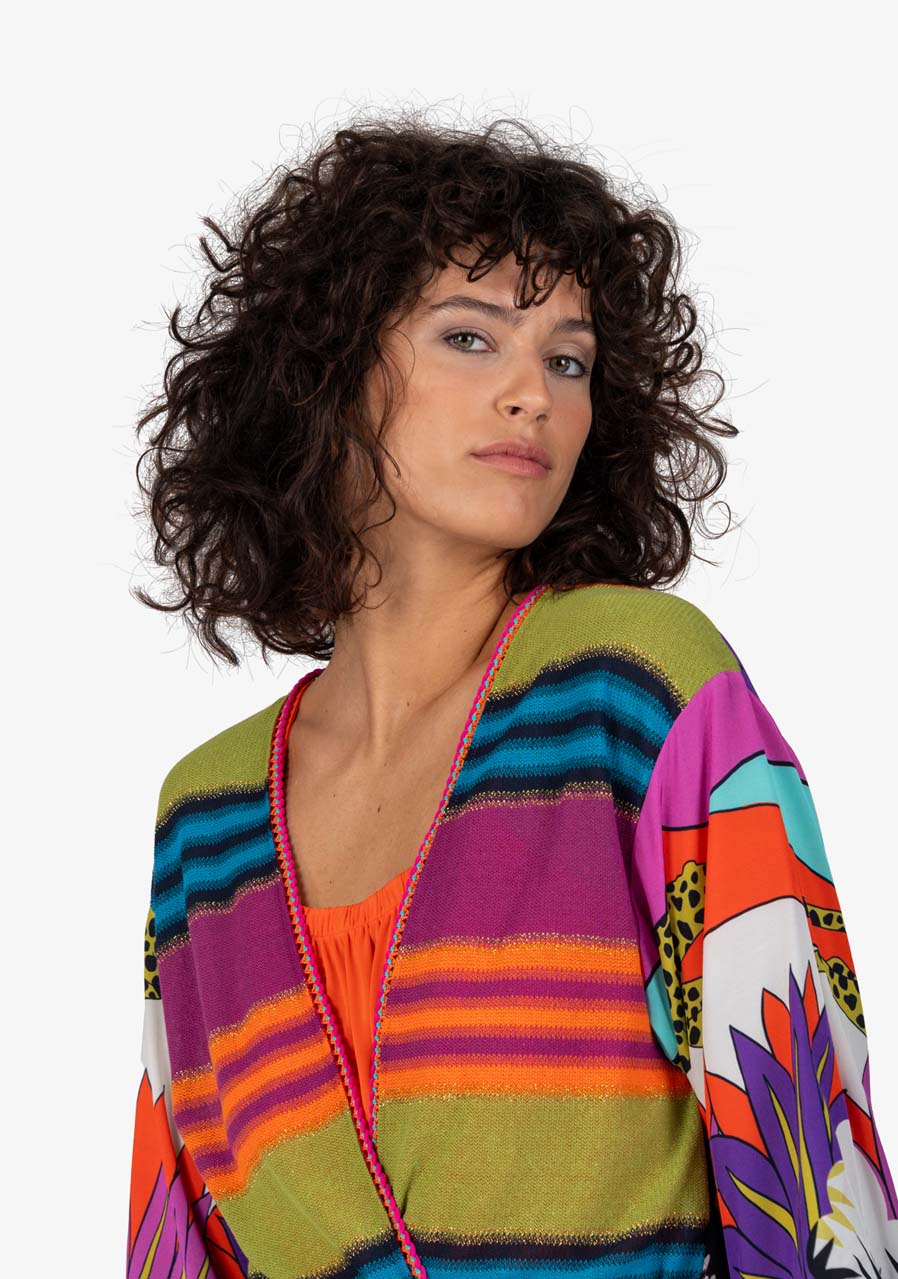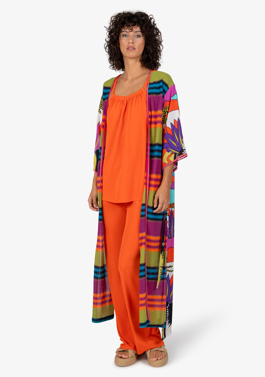 Tyto vzdušné šaty z potištěné viskózy a pruhovaného úpletu přináší lehkost, styl a pohodlí v jednom. Díky volnému střihu, květinovému potisku a praktickému pásku v pase působí elegantně a zároveň uvolněně. Boční rozparky dodávají na ležérnosti, zatímco pružné lemování na rukávech i výstřihu zajišťuje příjemné nošení. Perfektní volba pro letní dny, ať už na pláž nebo vycházky na dovolené.