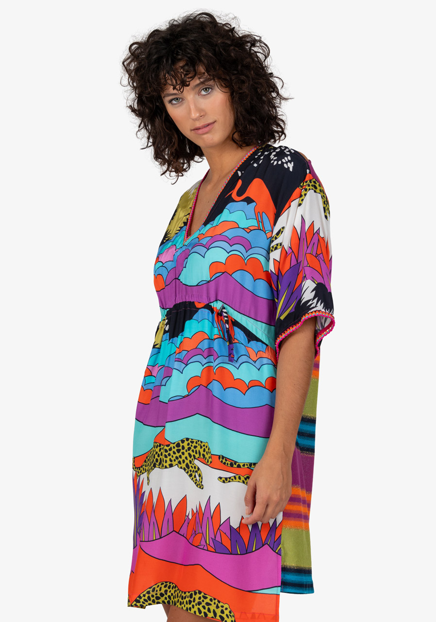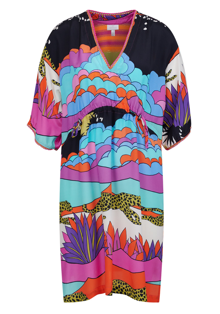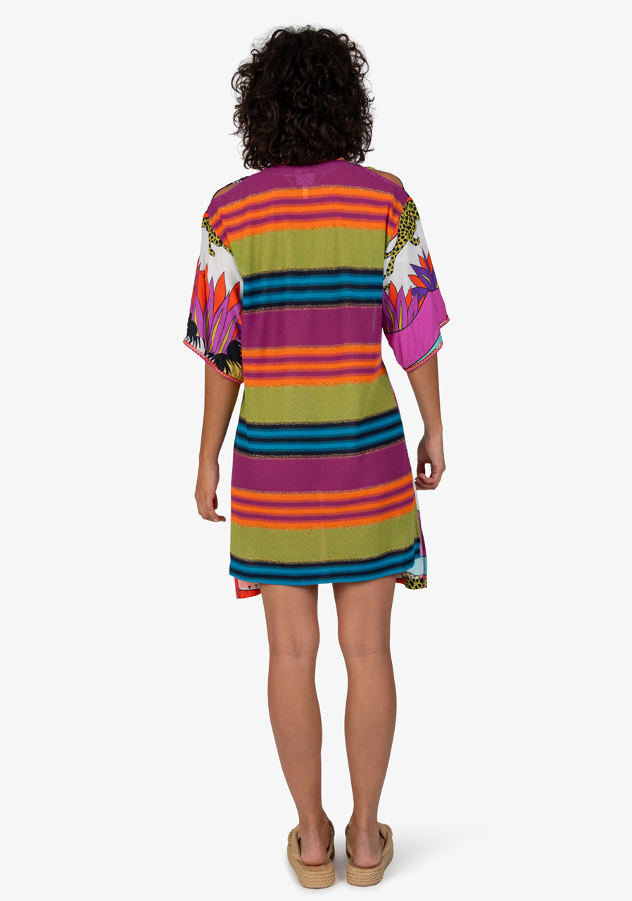 Tyto krátké tunikové šaty kombinují lehkost letního stylu s moderní elegancí. Barevný potisk v kombinaci s pruhovaným úpletem vytváří svěží a ženský vzhled. Sofistikovaný volán v pase a volný střih podtrhují ležérní pohodlí, zatímco kvalitní materiál z viskózy a úpletu zajišťuje příjemný pocit při nošení. Ideální pro volný čas, dovolenou i městské letní dny.